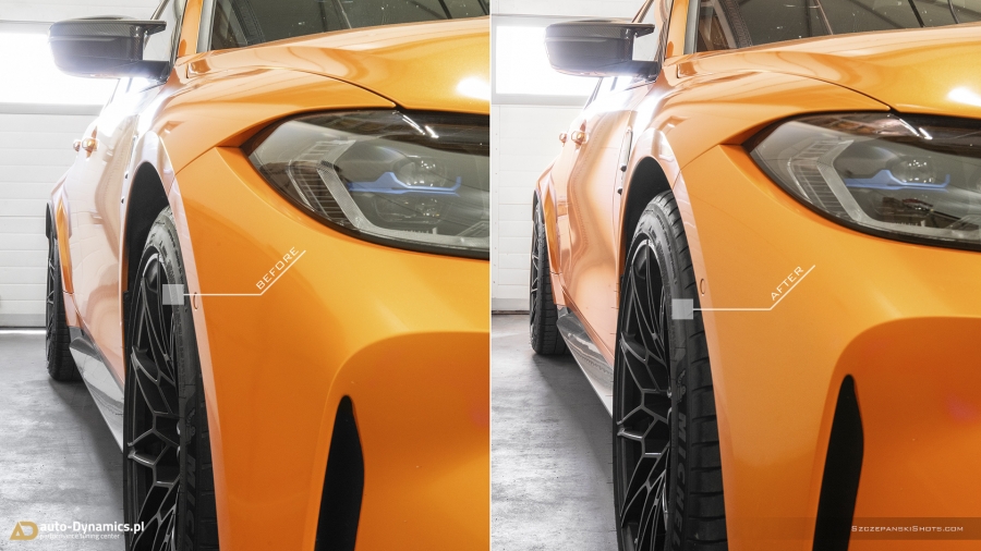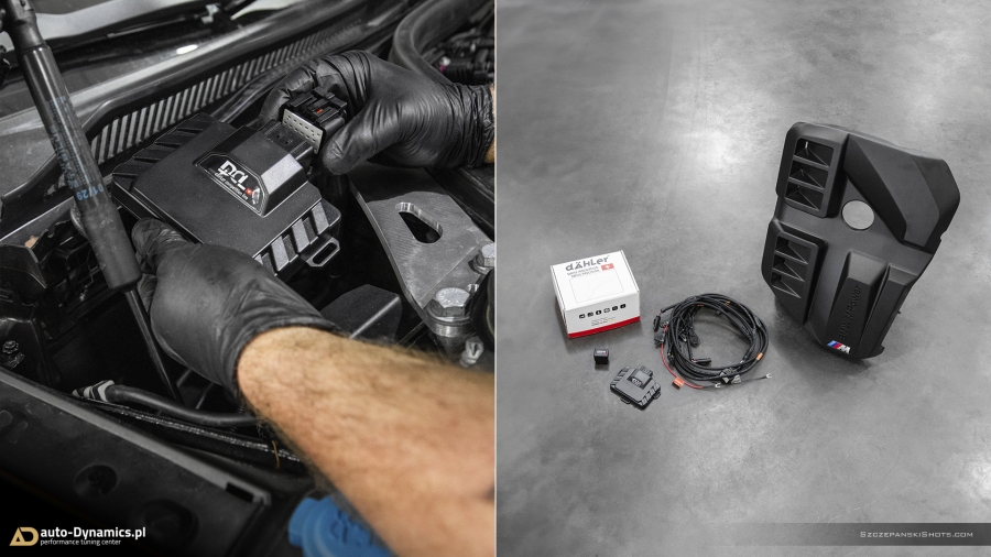 Nad ów wyjątkowym egzemplarzem ///M3 mieliśmy sposobność pracować w auto-Dynamics.pl jakiś czas temu, wówczas koncertując działania nad radykalną poprawą akustyki pojazdu paralelnie z nutą stylistycznego indywidualizmu [mods-Stage#1]. Podczas ówczesnej wizyty, skoncentrowaliśmy się nad poprawą elastyki i osiągów 3-litrowej, dualistycznie-doładowanej, rzędowej jednostki napędowej kodyfikowanej przez BMW jako S58. Respektując i uwzględniając obowiązującą gwarancję producencką, celem dynamicznej intensyfikacji właściwości tabelarycznych generowanych przez sześcio-cylindrowy silnik, w M3 [generacji G80] zainstalowany został profesjonalny, w pełni cyfrowy, dedykowany, zewnętrzny komputer ECU [Engine Control Unit] wraz z specjalną, rozbudowaną wiązką elektroniczną komunikującą się z sensorami magistrali CAN. Modyfikacja ta jest nieinwazyjna, nie wymaga zmian w fabrycznym oprogramowaniu i jest w pełni odwracalna gdy sytuacja tego wymaga [moduł wraz z wiązką można zdemontować bez pozostawienia żadnych śladów (mechanicznych i elektronicznych)]. Zainstalowany przez #teamAD kontroler wywodzi się z serii Competition Line od renomowanego, szwajcarskiego producenta i tunera pojazdów BMW - firmy dÄHLer [dÄHLer Design & Technik GmbH]. Zaawansowany, zewnętrzny sterownik ECU zapewnia osiągi i bezpieczeństwo silnika identyczne do typowego chiptuningu przez OBD. Moduł korzysta z map z dynamiczną adaptacją - monitoruje wiele wartości w czasie rzeczywistym i elastycznie dobiera wskazania, sięgając po drzemiący w 3-litrowej jednostce potencjał i przekuwa go w potężny zastrzyk przyrostu mocy i momentu obrotowego jak również znacznie zwiększa elastyczność dostępną w pełnym zakresie obrotów. Dodatkowo w ///M3 zamontowane zostały sportowe, wysokoprzepustowe, wieczyste filtry powietrza od renomowanego, włoskiego producenta - firmy BMC które to wyeliminowały skrajnie niewydolne, papierowe filtry fabryczne dostarczając po wymianie większą dawkę chłodnego i mniej zabrudzonego powietrza to komory spalania. Właściwości nominalne / katalogowe przedstawione przez BMW to: 510KM (375kW) i 650Nm [Wyniki pomiaru seryjnych wartości z zainstalowanych układem wydechowym i filtrami powietrza to 523KM (384kW) i 681Nm]. Efekty naszego zabiegu zmierzone na hamowni [paliwo RON98] to 612KM (450kW) i 764Nm [Przyrost: +102KM (+75kW) i +114Nm w stosunku do wartości katalogowych a +89KM (+66kW) i +83Nm w stosunku do wartości rzeczywistych]. Wzrost parametrów na tym poziomie zapewnia absolutną bezawaryjność jednostki napędowej w połączeniu z rewelacyjnymi osiągami pozwalającymi na bezpieczne oraz dynamiczne wyprzedzanie w każdych okolicznościach i warunkach drogowych. Różnica przyspieszenia zarówno w przedziale 0-100km/h jak i 100-200km/h oraz 200km/h-UP jest absolutnie kolosalna. Odczucia z jazdy, w połączniu z napędem ///M xDrive, są teraz naprawdę niesamowite, a elastyczność dzięki momentowi obrotowemu dostępnemu w szeroki i pełnym zakresie obrotów zdumiewa na każdym biegu! #Performance&WarrantyWithAD