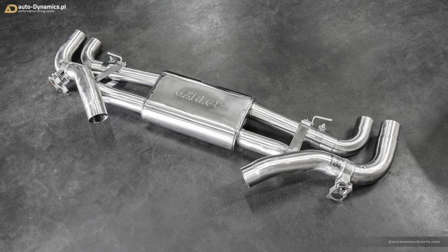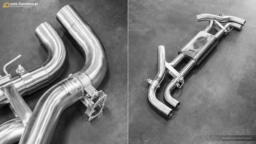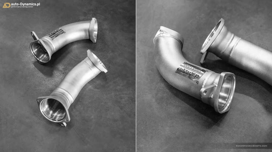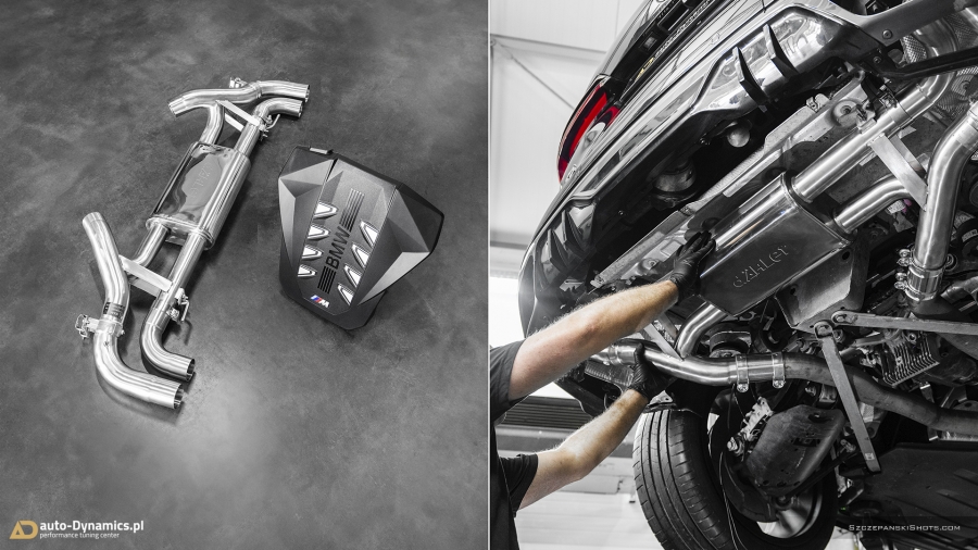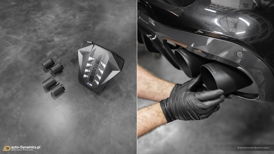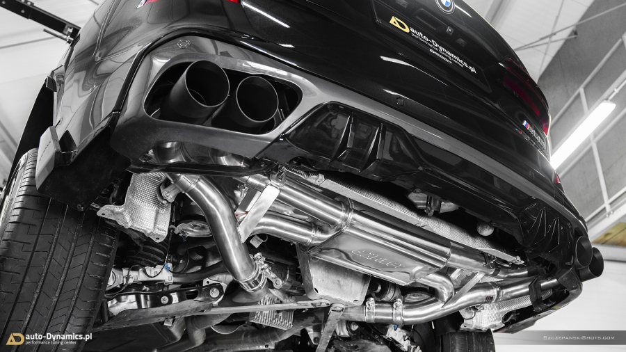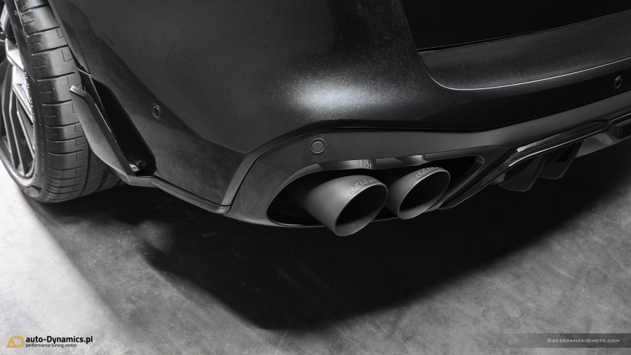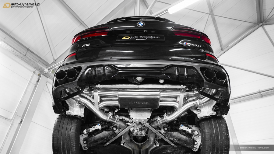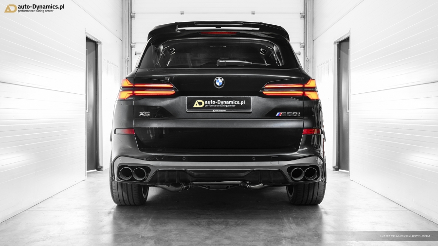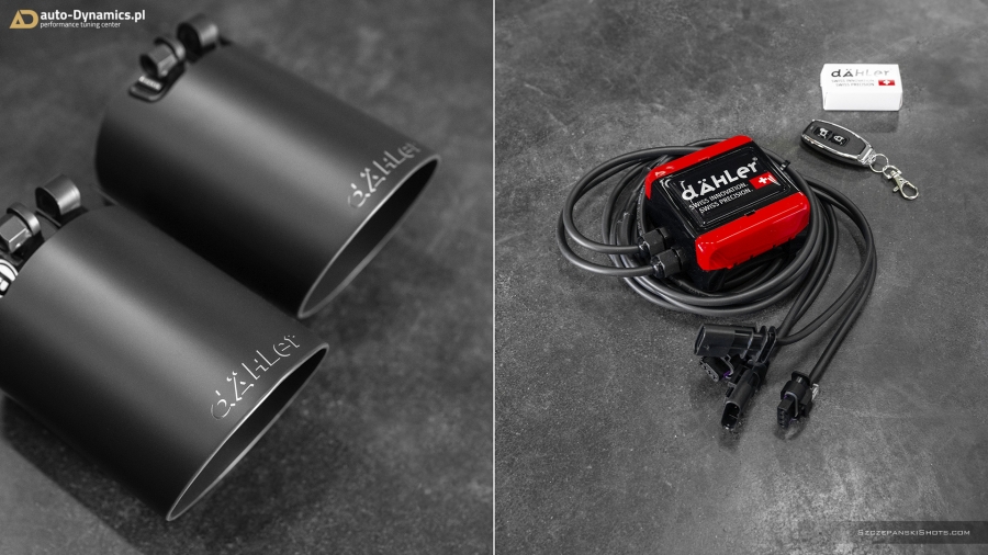 Radykalna poprawa barwy tonów emitowanych przez pojazdy uposażone fabrycznie w filtry OPF / GPF nie jest zadaniem prostym. Szczególnie w przypadku konieczności pozostawienia ów ekologicznych filtrów w nienaruszonej formie, choćby z tytułu szeregu aspektów gwarancyjnych tudzież homologacyjnych. Emancypację całkowicie wykastrowanej z akustyki przez uprzednio wspomniane filtry, jednostki kodyfikowanej przez BMW jako S68 rozpoczęliśmy od zastąpienia szalenie restrykcyjnego, seryjnego układu wydechowego – jego sportowym zamiennikiem pochodzącym z linii produktów Competition Line – model "High-Performance Stage#3" wprost od renomowanego, ekskluzywnego producenta specjalizującego się od dziesięcioleci w tuningu i modyfikacjach pojazdów marki BMW – szwajcarskiej firmy dÄHLer. Zainstalowany w X5 przez zespół #AD układ wydechowy stanowi kompletacja zawierająca wysoko przepustowy, sportowy tłumik końcowy z zaimplementowanym systemem zaworów / przepustnic / klap, cztery fenomenalnie prezentujące się końcówki wykończone w kolorze czarnej satyny które to jednocześnie, dzięki swoim pokaźnym rozmiarom [4 x 101mm] idealnie wypełniły otwory w tylnym dyfuzorze. Immanentny skład zestawu HP Stage#3 stanowi również zestaw wysoko przepustowych, sportowych rur DP’s [downpipe’s] które to zastępują restrykcyjne, drugie katalizatory. Drugie katalizatory instalowane w silnikach S68 nie są monitorowane przez ECU dlatego ich eliminacja nie wymaga żadnych zmian w elektronice oraz oprogramowaniu pojazdu a co za tym idzie jest to idealne rozwiązanie dla osób chcących wydobyć więcej dźwięku z silnika V8 przy zachowaniu gwarancji producenta pojazdu. Zwieńczenie hardware’owe systemu HP Stage#3 od dÄHLer to sterownik systemu zaworów / przepustnic / klap układu wydechowego. W najnowszych modelach BMW fabryczny sterownik otwiera przepustnice na maksymalnie 75% uchylenia [nawet w modelach M], ponadto klapy cały czas pracują [otwierają się i zamykają nawet w trybach sportowych]. Sterownik dÄHLer umożliwia ich pełne otwarcie nawet w trybach nie sportowych. A trybie automatycznym przywraca sterowanie klapami fabrycznemu, on-board’owemu sterownikowi BMW. Kontroler posiada również wbudowaną pamięć więc nie trzeba każdorazowo klikać oczekiwanego trybu na pilocie. Pracujące w trybie zamkniętym zawory pozwalają w arcy-komfortowych warunkach pokonywać autostradowe odległości a tryb otwartych zaworów stanowi salwę nasyconych agresywną barwą, motoryzacyjnych dźwięków i tonów. Wartym podkreślenia pozostaje stylistyczny fakt przeprowadzonej modyfikacji, który to nie pozwala przejść obok pojazdu obojętnie dzięki poczwórnym końcówkom systemu wydechowego nadającym szalenie indywidualnej, charakterystycznej, dynamicznie zorientowanej fizjonomii w tylnej ekspozyturze bawarskiego SUV’a. #PerfectionRedefinedByAD