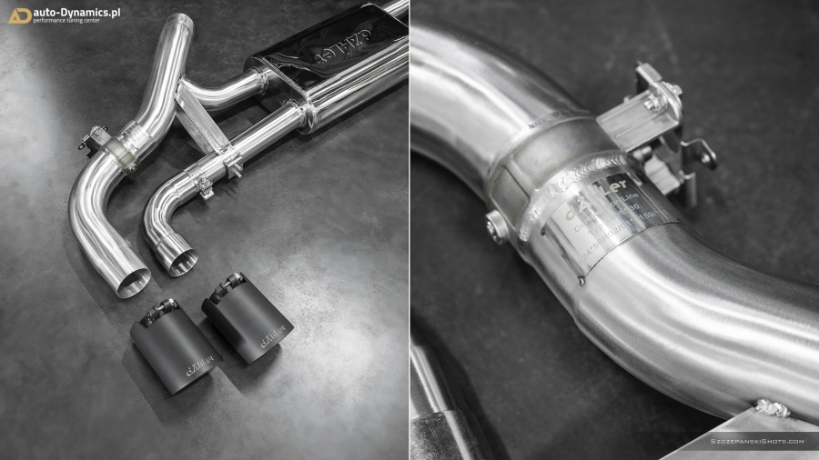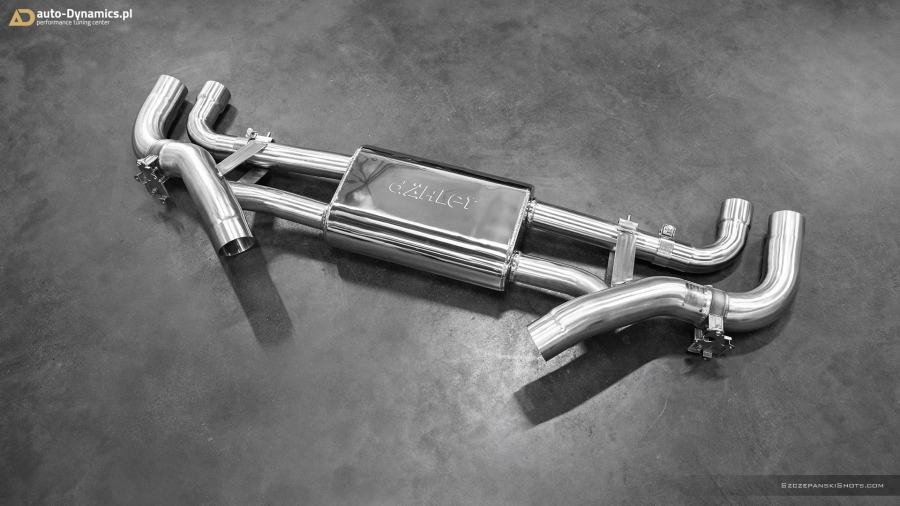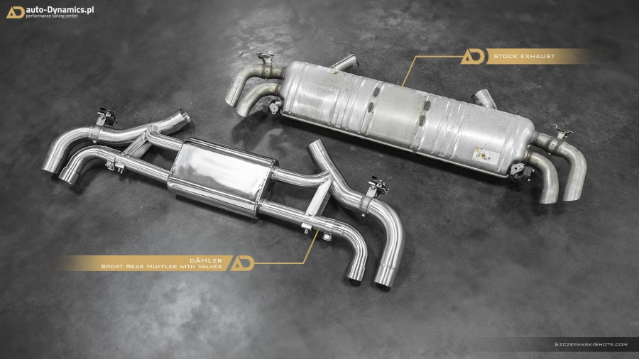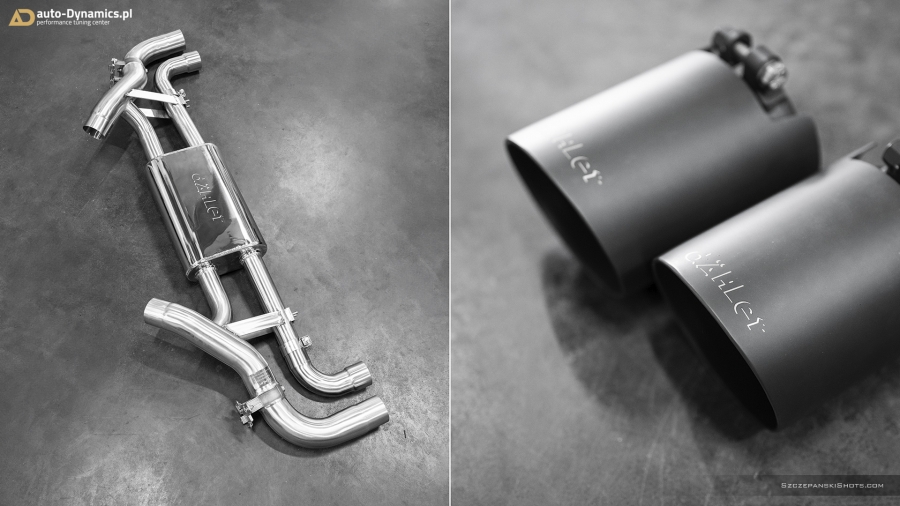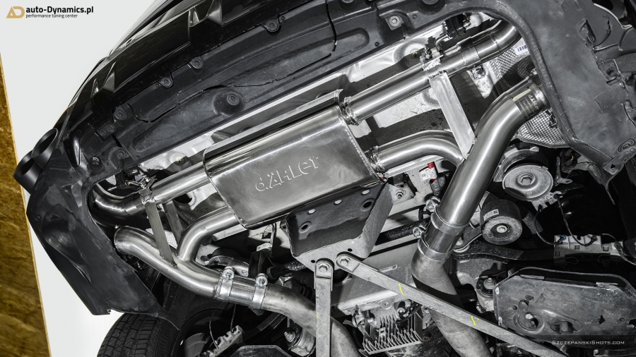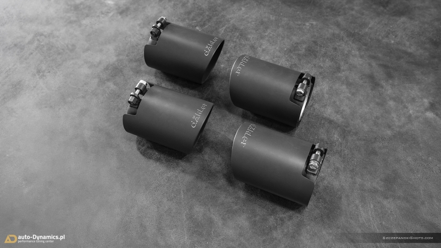 Dynamiczną eskalację fonetyki generowanej przez silnik kodyfikowany przez monachijskiego producenta jako N63B44 rozpoczęliśmy od eliminacji skrajnie niewydolnego, skutecznie kastrującego wszelkie, tak pożądane przez entuzjastów motoryzacji dźwięki, fabrycznego tłumika końcowego. Nie przebierając w półśrodkach, sięgnęliśmy po rozwiązanie od naszego wieloletniego partnera, pod postacią sportowego układu wydechowego od szwajcarsko-niemieckiej manufaktury trudniącej się od lat w profesjonalnych modyfikacjach pojazdów marki BMW – firmy dÄHLer. Kompletację zainstalowanego w X6 zestawu stanowi sportowy, perfekcyjnie wykonany i doskonale brzmiący, wysoko-przepustowy tłumik końcowy z zaimplementowanym systemem zaworów. Wpisanym w wydech dÄHLer systemem przepustnic zawiaduje on-board’owy komputer BMW [eco / comfort – zawory zamknięte (tryb cichszy) i sport / sport+ - zawory otwarte (tryb głośniejszy)]. Pracujące w trybie zamkniętym oba zawory pozwalają w arcy-komfortowych warunkach pokonywać autostradowe odległości a tryb otwartych, podwójnych zaworów stanowi salwę nasyconych agresywną barwą, motoryzacyjnych dźwięków i tonów. Wartym podkreślenia pozostaje stylistyczny fakt przeprowadzonej modyfikacji, który to nie pozwala przejść obok pojazdu obojętnie dzięki poczwórnym [4 x Ø 101 mm], fenomenalnie prezentującym się końcówkom w kolorze czarnej satyny z wygrawerowanym laserowo logo producenta które to nadały szalenie indywidualnej, charakterystycznej, dynamicznie zorientowanej aparycji tylnej ekspozyturze pojazdu. #X6RedefinedByAD