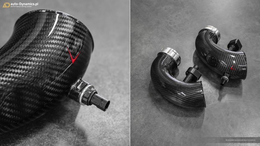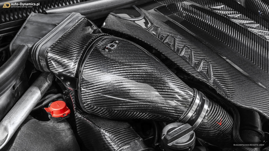 Ciąg dalszy tuningowej kompilacji stanowią zmiany wniesione w układ dolotowy poliftingowej wersji BMW X7. Nie przebierając w półśrodkach, sięgnęliśmy po top’owy, ultra wydajny i obłędnie prezentujący się, profesjonalny, sportowy układ dolotowy od renomowanego, brytyjskiego producenta – firmy Eventuri. System wykonany w całości z włókna węglowego [carbon fiber], eliminuje fabryczne, papierowe, panelowe filtry powietrza zapewniając jednocześnie maksymalizację dawki dopływu zimnego powietrza do turbosprężarek co w konsekwencji przekłada się na wzrost mocy i momentu obrotowego a także zapewnia niesamowite wrażenia akustyczne [dźwięk zasysanego powietrza]. Airbox’y jak i pozostałe elementy systemu dolotowego Eventuri wykonane są z najwyższej jakości włókien karbonizowanych. Materiał ten idealnie izoluje ciepło generowane przez silnik od filtrów powietrza. Zaimplementowane w cały, przeprojektowany system dolotu powietrza - sportowe, zbrojone filtry gwarantują doskonałe właściwości filtracyjne. Materiał zastosowany w filtrach to specjalna, zbrojona bawełna przechwytująca najmniejsze zanieczyszczenia. Ponadto, kompletację zainstalowanego przez #teamAD układu dolotowego, rozszerzyliśmy o pakiet karbonowych rur „Turbo Inlets” które to w sposób wręcz ekstremalny w stosunku do OEM, jeszcze bardziej śrubują efektywność całego układu Eventuri. Dodatkowo, nieobojętny pozostaje również fakt nowej, stylistycznej aranżacji komory silnika która to po montażu kompletnego systemu Eventuri prezentuje się teraz moto-fenomenalnie. Idealnie! #DeepBreathByAD
