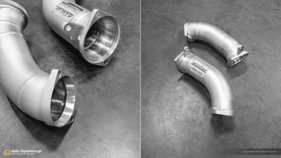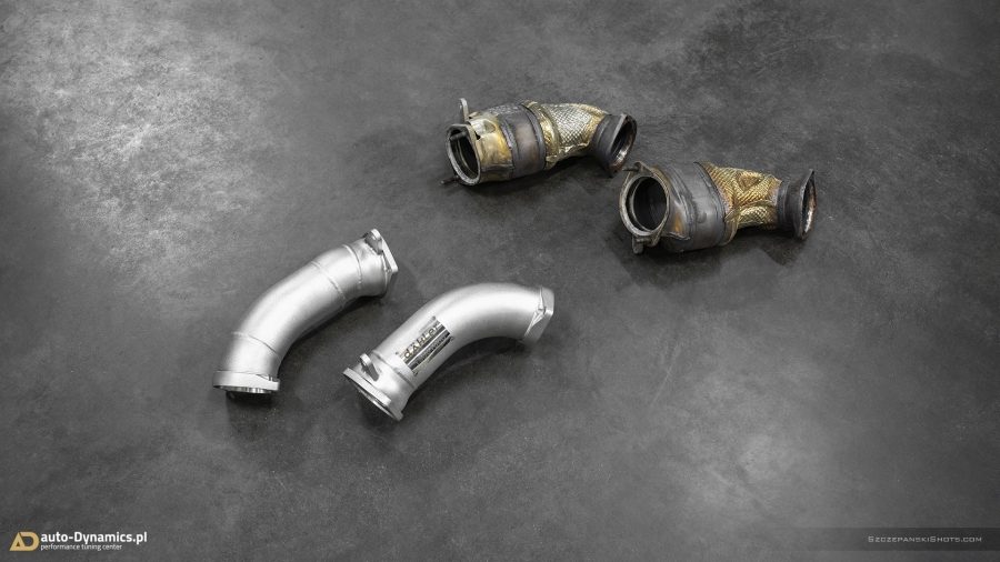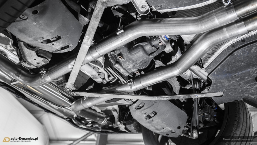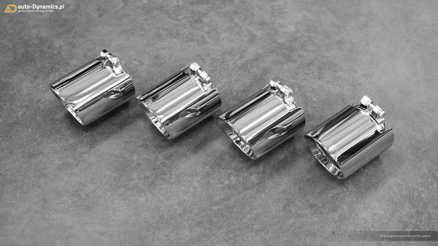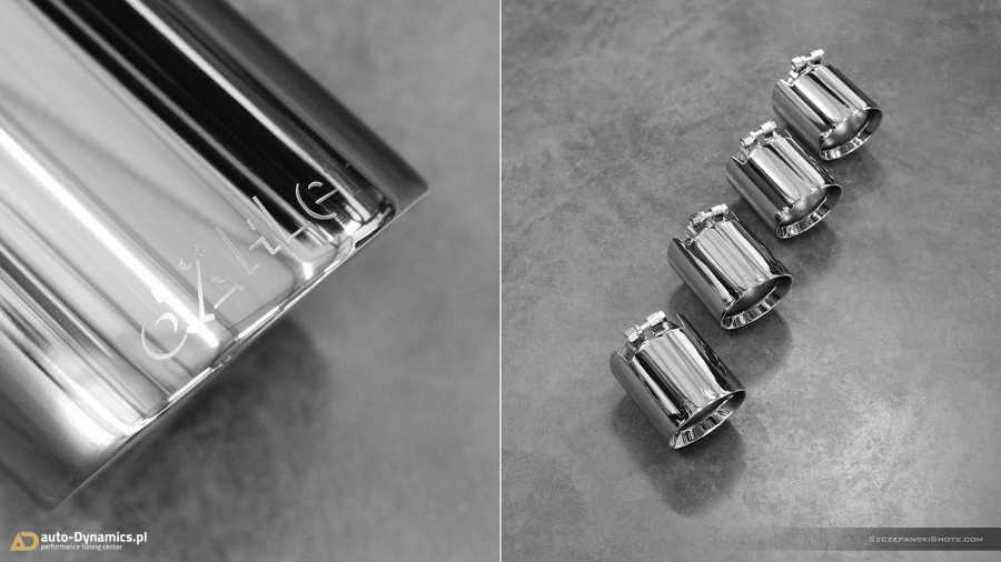 Modyfikacyjną metamorfozę monachijskiej X7 której genotyp pierwotnie zaaranżowała dywizja ///M-Performance, rozpoczęliśmy od dynamicznej eskalacji i znacznego podbicia właściwości akustycznych generowanych przez widlastą jednostkę napędową w układzie V8. Radykalna korekta barwy dźwięków i tonów generowanych przez pojazdy uposażone fabrycznie w ekologiczne filtry OPF / GPF nie jest zadaniem trywialnym i prostym. Szczególnie w przypadku konieczności pozostawienia ów ekologicznych filtrów w nienaruszonej formie, choćby z tytułu szeregu aspektów gwarancyjnych tudzież homologacyjnych. Przemianowanie całkowicie wykastrowanej z akustyki przez uprzednio wspomniane filtry, jednostki kodyfikowanej przez BMW jako S68 rozpoczęliśmy od zastąpienia szalenie restrykcyjnego, seryjnego układu wydechowego – jego sportowym zamiennikiem pochodzącym z linii produktów Competition Line – model High-Performance Stage#3 wprost od renomowanego, ekskluzywnego producenta specjalizującego się od dziesięcioleci w tuningu i modyfikacjach pojazdów marki BMW – szwajcarskiej firmy dÄHLer. Zainstalowany w X7 przez zespół #AD układ wydechowy stanowi kompletacja zawierająca wysoko przepustowy, sportowy tłumik końcowy z zaimplementowanym systemem zaworów / przepustnic / klap, cztery fenomenalnie prezentujące się końcówki wykończone w kolorze srebrnym które to jednocześnie, dzięki swoim pokaźnym rozmiarom [4 x 101mm] idealnie wypełniły otwory w tylnym dyfuzorze. Tłumik końcowy dopełnia zestaw rur łączących do sekcji centralnej. Immanentny skład zestawu HP Stage#3 stanowi również zestaw wysoko przepustowych, sportowych rur DP’s [downpipe’s] które to zastępują restrykcyjne, drugie katalizatory. Drugie katalizatory instalowane w silnikach S68 nie są monitorowane przez ECU dlatego ich eliminacja nie wymaga żadnych zmian w elektronice oraz oprogramowaniu pojazdu a co za tym idzie jest to idealne rozwiązanie dla osób chcących wydobyć więcej dźwięku z silnika V8 przy zachowaniu gwarancji producenta pojazdu. Zwieńczenie hardware’owe systemu HP Stage#3 od dÄHLer to sterownik systemu zaworów / przepustnic / klap układu wydechowego. W najnowszych modelach BMW fabryczny sterownik otwiera przepustnice na maksymalnie 75% uchylenia [nawet w modelach M], ponadto klapy cały czas pracują [otwierają się i zamykają nawet w trybach sportowych]. Sterownik dÄHLer umożliwia ich pełne otwarcie nawet w trybach nie sportowych. A trybie automatycznym przywraca sterowanie klapami fabrycznemu, on-board’owemu sterownikowi BMW. Kontroler posiada również wbudowaną pamięć więc nie trzeba każdorazowo klikać oczekiwanego trybu na pilocie. Pracujące w trybie zamkniętym zawory pozwalają w arcy-komfortowych warunkach pokonywać autostradowe odległości a tryb otwartych zaworów stanowi salwę nasyconych agresywną barwą, motoryzacyjnych dźwięków i tonów. Wartym podkreślenia pozostaje stylistyczny fakt przeprowadzonej modyfikacji, który to nie pozwala przejść obok pojazdu obojętnie dzięki poczwórnym końcówkom systemu wydechowego nadającym szalenie indywidualnej, charakterystycznej, dynamicznie zorientowanej fizjonomii w tylnej ekspozyturze pojazdu. #V8SoundByAD