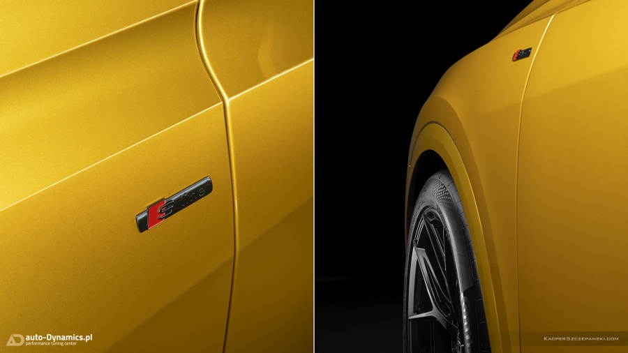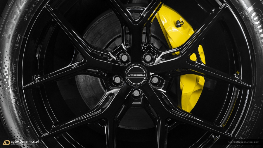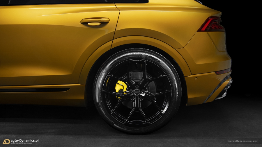 Nad ów fenomenalnym egzemplarzem Q8 mieliśmy sposobność pracować w #AD onegdaj [mods-Stage#X], windując wówczas wartości tabelaryczne. Kontynuując modyfikacyjną trawestację Coupé-Crossover’a, określającego górną granicę modelową [S]port [U]tility [V]ehicle stajni Audi AG, podczas kolejnego pit-stop’u w #AD zaaprowizowaliśmy w zestaw szalenie indywidualnych, charakterystycznych, agresywnych wizualnie, aluminiowych felg. Pochodzący się z najnowszej kolekcji, model HF-5 wywodzący się z serii „Hybrid Forged” od renomowanego, amerykańskiego producenta – firmy Vossen. Felgi wykończone zostały w kolorze czarnego, głębokiego, fortepianowego połysku który idealnie współgra z lakierem karoserii „Dragon Orange Metallic” a specyfikacja zainstalowanego zestawu to - 22” [4 x 10.5” / FA + RA]. Precyzyjnie przeprojektowane, skrupulatnie wyliczone, agresywne odsadzenie ET pozwoliło wpisać nowy zestaw kół w nadkola, zrównując tym samym perfekcyjnie ich linię z linią błotników, a adekwatne zwymiarowanie umożliwiło zachowanie nominalnego obwodu tocznego zapewniając elektronicznym, on-board’owym systemom pełną, niezakłóconą funkcjonalność. Felgi wyposażone zostały w zestaw opon klasy high-performance – niemieckiej firmy Continental. Sprawujący się perfekcyjnie w każdych warunkach, sportowy model – SportContact6 z homologacją Audi [4 x 285/40/22] oraz w pakiet nowych, OEM’owych [Audi] czujników kontroli i monitorowania ciśnienia w oponach [TPMS], które własnym sumptem, metodą proszkową wylakierowaliśmy w kolorze obręczy Vossen celem niezaburzonego i estetycznego odbioru, nowych, czarnych felg. Tożsamą procedurę zastosowaliśmy do odważników które korelują harmonijnie z pozostałymi składowymi pakietu. Prawidłowe mocowanie felg do piast zapewnił zestaw dedykowanych, odpowiednio zwymiarowanych śrub Vossen, na których to „łbach” wygrawerowana została charakterystyczna dla producenta „V-ka”. Dopełnienie modyfikacyjnej metamorfozy stanowią indywidulane, proste w wizualnym charakterze a zarazem koherentne z całością, aluminiowe, korespondujące z całym optycznym zamysłem - zaślepki piast Vossen a także custom’owe nakrętki zaworów ciśnieniowych z charakterystycznym logotypem „V”. Cały komplet przed montażem zabezpieczony został flagową powłoką ceramiczno-ochronną MOHS pochodzącą z palety produktów firmy Gyeon. Standardowo dla #teamAD, cały zestaw zmontowany został na bezkonkurencyjnej maszynie firmy Hunter która to zapewniają pełną optymalizacje ułożenia opony względem felgi, test drogowy a finalnie – perfekcyjnie zbalansowany, ekstremalnie stabilny set który nigdy nie zawiedzie.