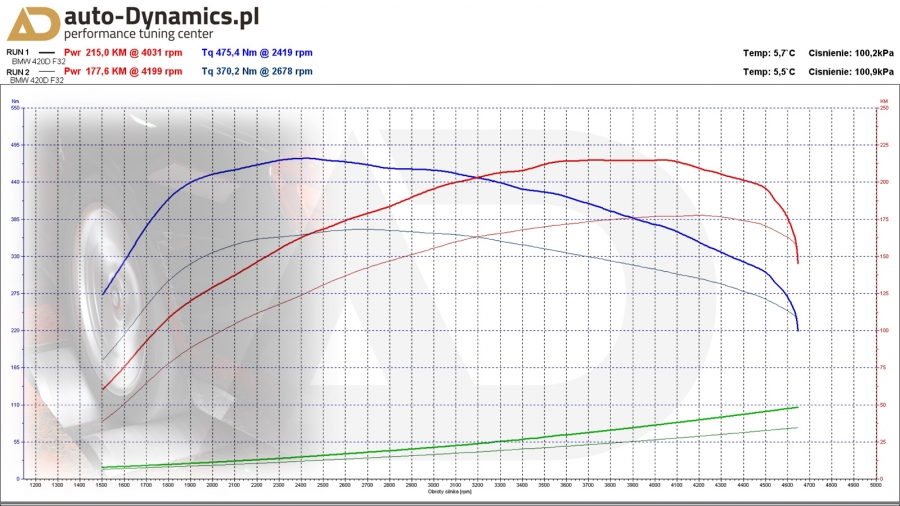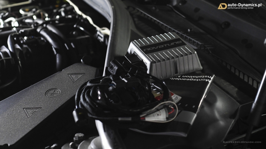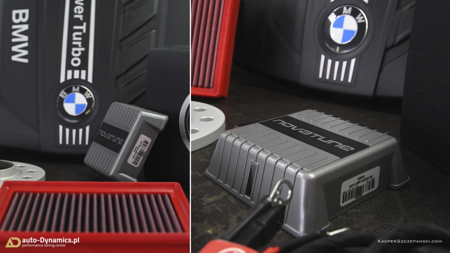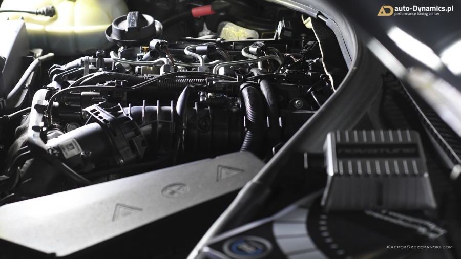W BMW z racji obowiązującej gwarancji, zainstalowany został profesjonalny, w pełni cyfrowy, dedykowany, zewnętrzny komputer ECU wraz z specjalną, rozbudowaną wiązką elektroniczną komunikującą się z sensorami magistrali CAN. Kontroler od renomowanego, niemieckiego producenta - firmy Novatune. ECU zapewnia osiągi i bezpieczeństwo identyczne do typowego chiptuningu przez OBD. Moduł korzysta z map z dynamiczną adaptacją - monitoruje wiele wartości w czasie rzeczywistym i elastycznie dobiera wskazania. Dodatkowo w BMW zainstalowany został sportowy, wysokoprzeustowy, wieczysty filtr powietrza firmy BMC - eliminujący mało wydajny, papierowy filtr. Właściwości fabryczne podane przez BMW to: 184KM i 380Nm [Wyniki pomiaru seryjnych wartości to 177KM i 370Nm]. Efekty naszego zabiegu zmierzone na hamowni to 215KM i 475Nm [Przyrost +38KM i +105Nm]. Wzrost parametrów na tym poziomie zapewnia absolutną bezawaryjność jednostki napędowej w połączeniu z rewelacyjnymi osiągami pozwalającymi na bezpieczne wyprzedzanie w każdych okolicznościach i warunkach drogowych. Różnica przyspieszenia w przedziale 100-200km/h jest kolosalna. Odczucia z jazdy są teraz naprawdę niesamowite, a elastyczność zdumiewa na każdym biegu! „Czwórka” po modyfikacjach w auto-Dynamics.pl wydajnością i osiągami nie odstaję od wersji 425d [F32].