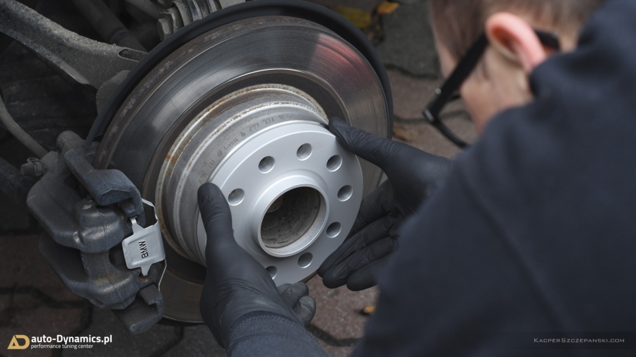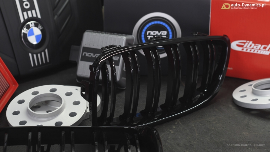 Celem zapewnienia ostatecznego szlifu i nadania jeszcze wyższej stabilności – w BMW zainstalowany został zestaw aluminiowych dystansów poszerzających niemieckiej firmy Eibach wraz z kompletem adekwatnie dłuższych śrub. Montaż pierścieni dystansujących [przód: 2 x 12 mm strona / 24 mm oś, tył: 2 x 15 mm strona / 30 mm oś] pozwolił zrównać felgi z linią błotnika i idealnie wypełnić nadkola - stawiając tym samym „kropkę nad i”. Dodatkowo w pojeździe zamontowana została frontowa atrapa chłodnicy [grill / nerki] wykończona w kolorze czarnego połysku, o podwójnym użebrowaniu stylizowanym na nowe wersje BMW Serii ///M. Produkt od renomowanego, duńskiego producenta – firmy Schmiedmann.
