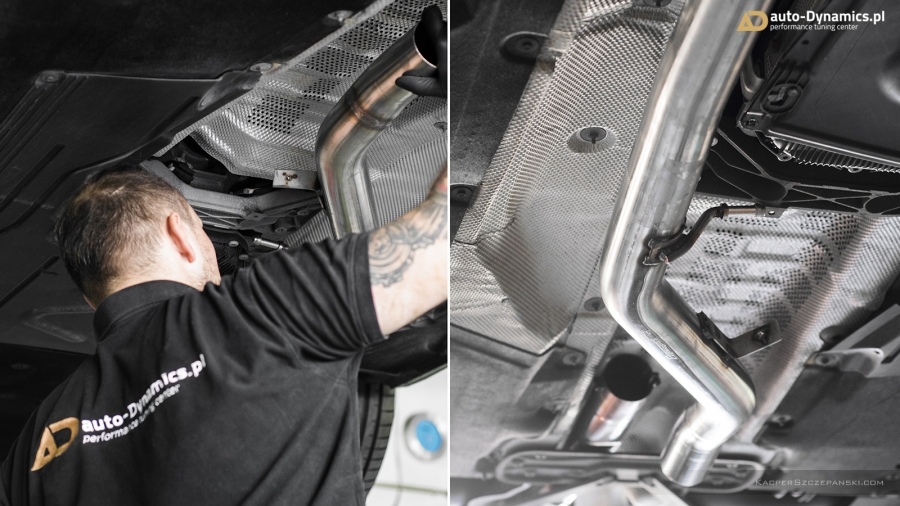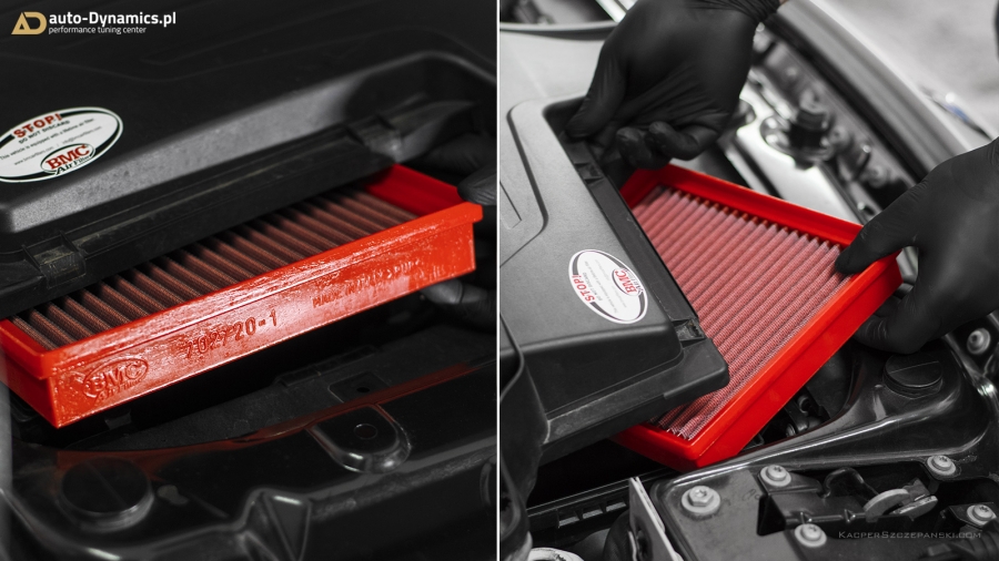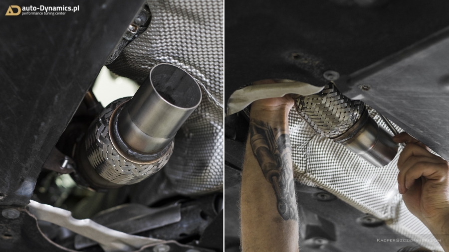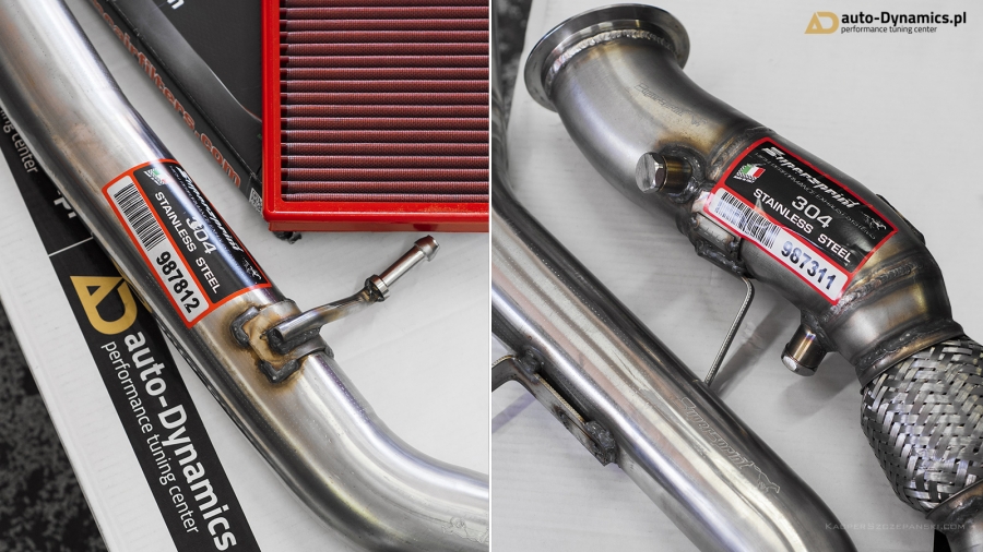 Kontynuując historię modyfikacyjnej metamorfozy, przy ścisłych założeniach koncepcyjnych całego projektu, BMW w tym etapie doposażyliśmy w wysoko-przepustową rurę „downpipe” eliminującą fabryczny, restrykcyjny katalizator oraz przednią część układu wydechowego w postaci „frontpipe”. Oba podzespoły systemu wydechowego, w połączeniu z wcześniej przeprowadzonymi zmianami, pozwoliły utworzyć kompletny układ typu „turbo-back” który radykalnie poprawił przepustowość gazów spalinowych, nadając jednocześnie charakterystycznego, bardzo sportowego brzmienia. Obydwa elementy układu wydechowego pochodzą od renomowanego producenta – firmy Supersprint. Dodatkowo w BMW zainstalowany został sportowy, wysoko-przepustowy, wieczysty filtr powietrza firmy BMC - eliminujący mało wydajny, seryjny filtr wykonany z papieru.