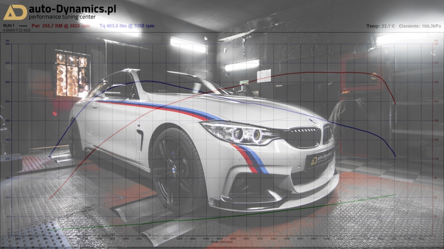 Wykorzystując potencjał przeprowadzonych modyfikacji mechanicznych typu „wdech + wydech”, poprawiających znacznie przepustowość gazów spalinowych oraz doprowadzających większą ilość powietrza do silnika, w 4-er wykonany został profesjonalny chiptuning sterownika ECU. Właściwości fabryczne podane przez BMW to: 184KM i 270Nm [Wyniki pomiaru seryjnych wartości to 182KM i 273Nm]. Efekty naszego strojenia zmierzone na hamowni to 255KM i 403Nm [Przyrost ~ +70KM i +130Nm]. Wzrost parametrów na tym poziomie zapewnia absolutną bezawaryjność jednostki napędowej w połączeniu z rewelacyjnymi osiągami pozwalającymi na bezpieczne wyprzedzanie w każdych okolicznościach i warunkach drogowych. Różnica przyspieszenia w przedziale 100-200km/h jest kolosalna. Odczucia z jazdy są teraz naprawdę niesamowite, a elastyczność zdumiewa na każdym biegu. „Czwórka” po modyfikacjach w auto-Dynamics.pl wydajnością i osiągami nie odstaję od wersji 428i czy 430i.