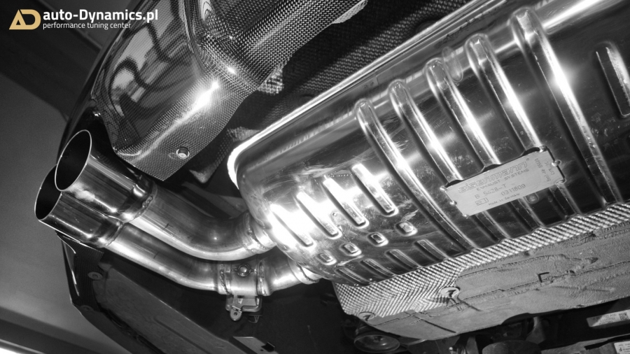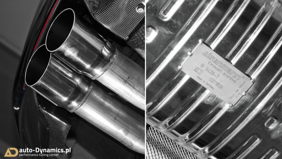 Kolejna modyfikacja którą przeprowadziliśmy koncentrowała się na poprawie dźwięku pojazdu. Seryjny, nieestetyczny i fatalnie brzmiący wydech ustąpił miejsca sportowemu układowi wydechowemu w postaci końcowego tłumika od legendarnego producenta – niemieckiej firmy Eisenmann. Tłumik w specyfikacji „Sport”, zakończony czterema końcówkami o słusznej średnicy [4 x Ø 76 mm] wraz z homologacja TUV oraz zaworem odpowiedzialnym z głośność układu, którego pracą zawiaduje fabryczny komputer BMW.