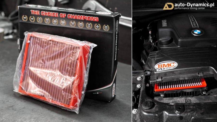 Uzupełnienie całości przeprowadzonych prac stanowi sportowy filtr powietrza o ponadprzeciętnych właściwościach filtracyjnych a jednocześnie przepuszczający większą dawkę powietrz - firmy BMC, który to zagościł w fabrycznym airbox’ie eliminując tym samym seryjny, papierowy i mało wydajny filtr. Dodatkowo w BMW wymienione zostały przednie klocki hamulcowe na doskonałą alternatywę w postaci klocków z palety performance firmy Brembo.