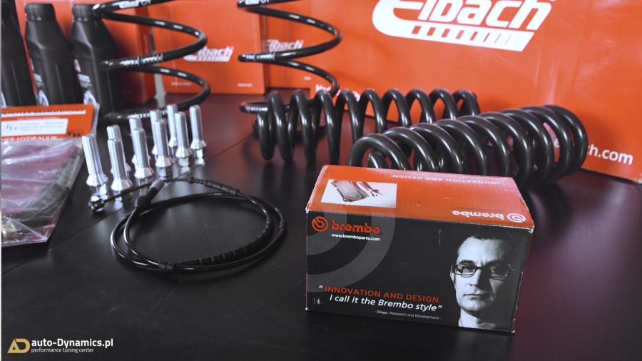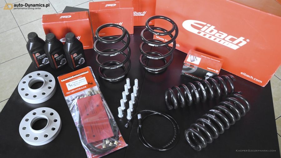 W pierwszej kolejności, eliminując punkt po punkcie bolączki „Czwórki” seryjne sprężyny ustąpiły miejsca ich sportowej odmianie o twardszej, lecz w dalszym ciągu dość komfortowej charakterystyce. Progresywny zestaw z serii „Pro-Kit” od renomowanego, niemieckiego producenta – firmy Eibach, prócz znacznej poprawy prowadzenia, obniżenia środka ciężkości i „czucia” pojazdu - dzięki niewielkiemu obniżeniu [-15-20mm oś przednia i -5-10mm oś tylna] nadał BMW dużo atrakcyjniejszej aparycji przy jednoczesnym zachowaniu komfortu podczas codziennej eksploatacji.