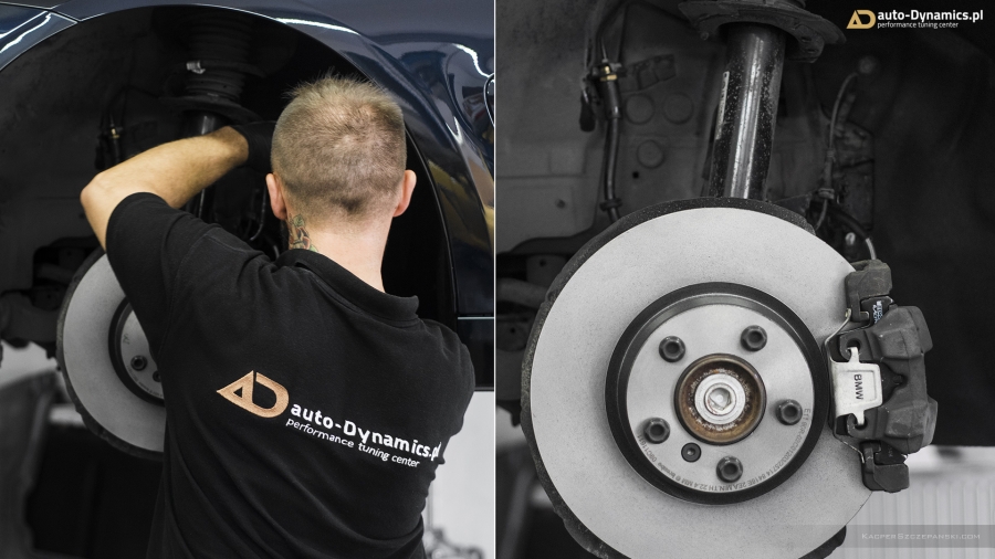 Precyzyjne założenia koncepcyjne projektu, konstytuowały całość prac związanych z eskalacją atrybutów systemu hamulcowego - w sposób czysto merytoryczny, uargumentowany i odpowiedzialny. W 4-er - seryjne, puchnące, mało wydajne a z czasem parciejące – gumowe przewody zastąpiliśmy przewodami hamulcowymi w stalowym oplocie – komplet od renomowanego, niemieckiego producenta, wraz z homologacją TUV – firmy Fischer Hydraulik. W całym układzie hamulcowym wymieniony został płyn na wyczynowy wariant o ekstremalnie wysokiej temperaturze wrzenia i znakomitej odporności higroskopijnej [Płyn „Performance Brake Fluid” brytyjskiej firmy Millers]. W zaciskach zagościły ultra wydajne, sportowe klocki hamulcowe z serii DS2500 firmy Ferodo Racing które współpracować będą z nowymi, wentylowanymi tarczami marki Brembo. Konglomerat wszystkich zainstalowanych podzespołów przeistacza fabryczny system hamulcowy w niezawodne, maksymalizujące poziom bezpieczeństwa narzędzie którego praca przekłada się bezpośrednio na gwarancję spokoju, zarówno kierowcy jak i pasażerów. System perfekcyjnie sprawdzi się również podczas dynamicznej, agresywnej jazdy. #ApprovedByAD