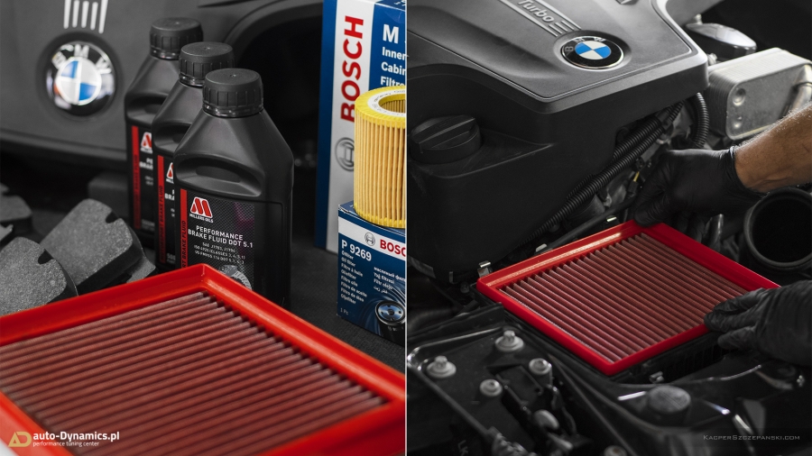Korzystając z obecności „Czwórki” w auto-Dynamics.pl, współbieżnie z modyfikacjami a uwzględniając interwały konserwacyjne, w BMW przeprowadziliśmy dodatkowo pełen profesjonalny serwis olejowy z wykorzystaniem zaufanych i niezawodnych olei Millers, które znacznie przewyższają zadane przez bawarską fabrykę normy. Rzędowa jednostka napędowa zapełniona została wysokiej klasy olejem z serii Premium, o specyfikacji 0W40 w połączeniu z filtrem marki Bosch, po wcześniejszym zastosowaniu płukanki firmy silnikowej Millers [Engine Flush] odpowiednio przygotowującej jednostkę napędową N20B20 do współpracy z najwyższej próby olejem. Dodatkowo w BMW zamontowany został sportowy, wysokoprzepustowy, wieczysty filtr powietrza firmy BMC - eliminujący mało wydajny, papierowy filtr. Za czystość powietrza w przedziale pasażerskim odpowiada nowy, przeciwpyłowy filtr od Bosch.