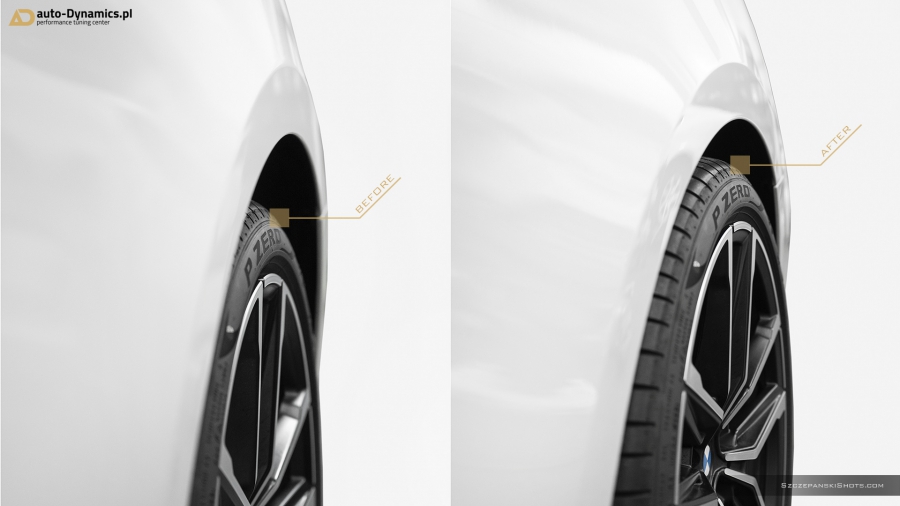 Celem zapewnienia ostatecznego szlifu i nadania jeszcze wyższej stabilności – w 4er zainstalowany został zestaw aluminiowych dystansów poszerzających niemieckiej firmy Eibach wraz z kompletem adekwatnie dłuższych śrub. Montaż pierścieni dystansujących pozwolił zrównać felgi z linią błotnika i idealnie wypełnić nadkola - stawiając tym samym przysłowiową „kropkę nad i” w odbiorze estetycznym czterysta-trzydziestki. #WiderBetterByAD