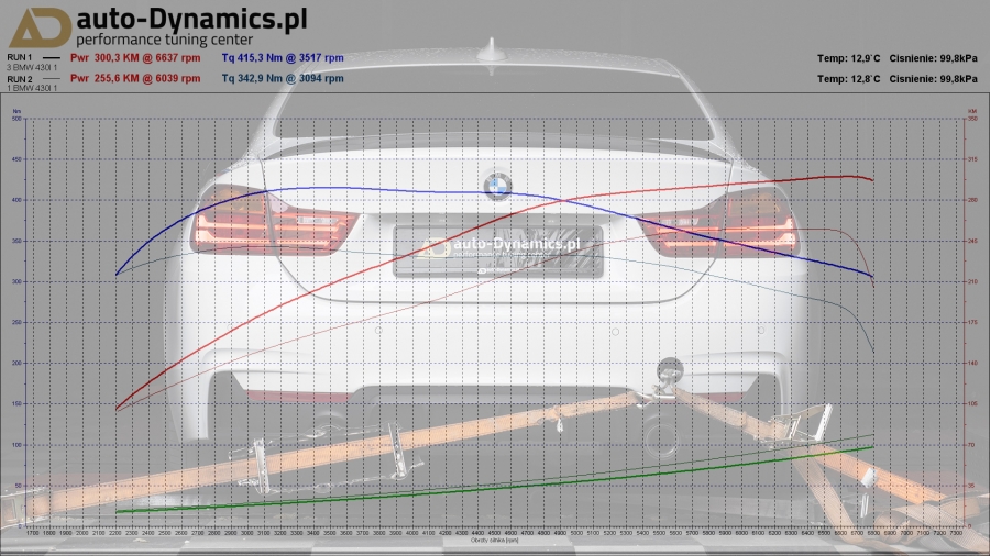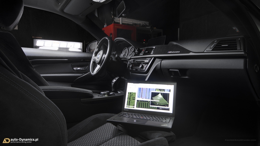 Koncentrując się na założeniach koncepcyjnych całego projektu, który miał na celu poprawę osiągów 2 litrowej, benzynowej jednostki napędowej kodyfikowanej przez producenta jako B48B20 - w pierwszej kolejności przystąpiliśmy do typowej, wspomagającej modyfikacji typu „wdech + wydech”, poprawiającej przepustowość gazów spalinowych oraz doprowadzającej większą ilość powietrza do silnika. W 4-er zainstalowany został wysoko-przepustowy, wieczysty filtr powietrza firmy BMC - eliminujący mało wydajny, papierowy filtr który mechanicznie uzupełnił wcześniej zainstalowany system wydechowy pochodzący z palety oryginalnych akcesoriów BMW M Performance. Wykorzystując potencjał przeprowadzonych modyfikacji mechanicznych, w 4-er wykonany został profesjonalny chiptuning sterownika ECU. Właściwości fabryczne podane przez BMW to: 252KM i 350Nm [Wyniki pomiaru seryjnych wartości to 255KM i 342Nm]. Efekty naszego strojenia zmierzone na hamowni to 300KM i 415Nm [Przyrost +45KM i +73Nm]. Wzrost parametrów na tym poziomie zapewnia absolutną bezawaryjność jednostki napędowej w połączeniu z rewelacyjnymi osiągami pozwalającymi na bezpieczne wyprzedzanie w każdych okolicznościach i warunkach drogowych. Różnica przyspieszenia w przedziale 100-200km/h jest kolosalna. Odczucia z jazdy, w połączniu z napędem xDrive, są teraz naprawdę niesamowite, a elastyczność zdumiewa na każdym biegu!