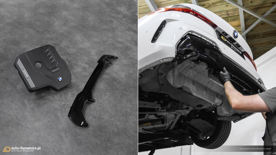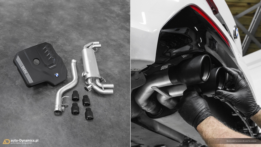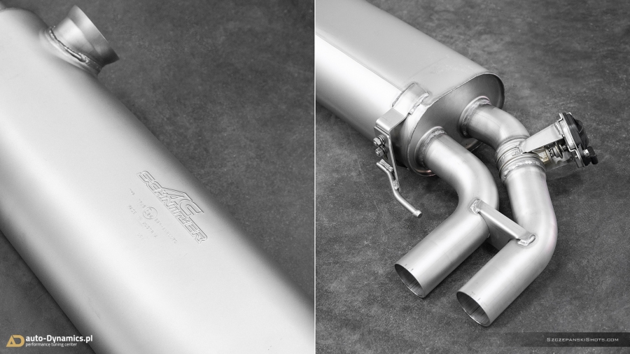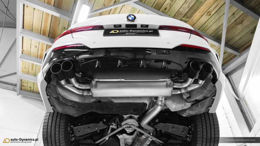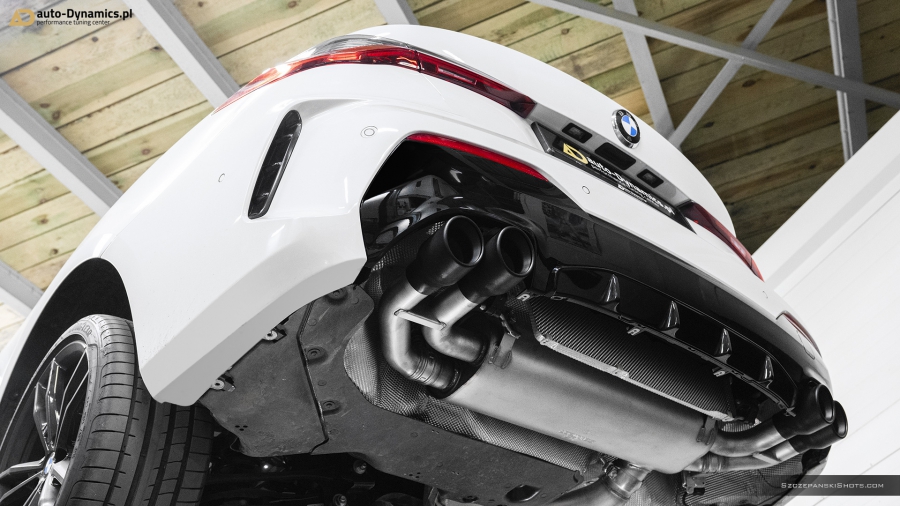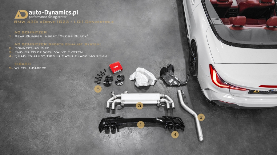 Radykalna poprawa barwy tonów emitowanych przez pojazdy uposażone fabrycznie w filtry OPF / GPF nie jest zadaniem prostym. Szczególnie w przypadku konieczności pozostawienia ów ekologicznych filtrów w nienaruszonej formie, choćby z tytułu szeregu aspektów gwarancyjnych tudzież homologacyjnych. Przemianowanie całkowicie wykastrowanej z akustyki przez uprzednio wspomniane filtry, jednostki silnikowej B48O1ZIK rozpoczęliśmy od zastąpienia szalenie restrykcyjnego, skrajnie niewydolnego, seryjnego układu wydechowego – jego sportowym zamiennikiem pochodzącym z linii produktów wprost od ekskluzywnego producenta specjalizującego się od dziesięcioleci w tuningu i modyfikacjach pojazdów marki BMW – niemieckiej firmy AC Schnitzer. Zainstalowany w BMW 430i przez zespół #AD układ wydechowy stanowi kompletacja zawierająca wysoko przepustowy, sportowy tłumik końcowy z zaimplementowanym systemem zaworów / przepustnic których pracą zawiaduje on-board’owy komputer BMW [eco / comfort – zawory zamknięte (tryb cichszy) i sport / sport+ - zawory otwarte (tryb głośniejszy)], dedykowana rura łącząca oraz cztery fenomenalnie prezentujące się końcówki o zwiększonej średnicy wykończone w kolorze czarnej satyny które to jednocześnie idealnie wypełniły otwory w nowo zainstalowanym, wylakierowanym w czarnym połysku, tylnym dyfuzorze który to AC Schnitzer dostarcza w pakiecie wraz z nowymi osłonami termo-izolacyjnymi oraz pozostałymi elementami umożliwiającymi bezproblemową konwersję systemu wydechowego z dwóch na cztery końcówki. Wartym podkreślenia jest fakt, iż system AC Schnitzer wyposażony jest w dwie a nie jedną przepustnicę jak to ma miejsce w przypadku fabrycznego tłumika. W przypadku zamkniętych przepustnic, spaliny trafiają do kanistra tłumika ale dzięki podwójnym przepustnicom – gazy spalinowe wydobywają się z dwóch wewnętrznych końcówek. Tryby sportowe otwierają obie przepustnice i wówczas gazy spalinowe praktycznie całkowicie pomijają tłumik co przekłada się po prostu na dużo przyjemniejsze brzmienie. W trybach sportowych gazy wydobywają się z wszystkich czterech końcówek. Credo AC Schnitzer brzmi „Beyond The Standard” – ów dewiza idealnie odzwierciedla jakość i poziom akustyki oraz charakterystykę dźwięków generowanych przez wykonany z nierdzewnej stali kwasoodpornej układ wydechowy. Zdumiewająco poprawnie wyważony balans pomiędzy niskimi, średnimi jak i wysokimi tonami plasuje system niemieckiego tunera w ścisłej czołówce aftermaketowych systemów dedykowanych do BMW 430i [generacji G2X]. Pracujące w trybie zamkniętym zawory pozwalają w arcy-komfortowych warunkach pokonywać autostradowe odległości a tryb otwartych zaworów stanowi salwę nasyconych agresywną barwą, motoryzacyjnych dźwięków i tonów. Paralelnie, stylistycznie dodając szalenie indywidualnej, charakterystycznej, dynamicznie zorientowanej fizjonomii w tylnej ekspozyturze cabrio-pojazdu. #CarPerfectByAD