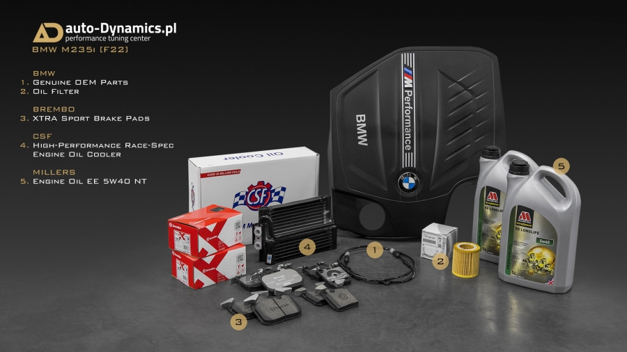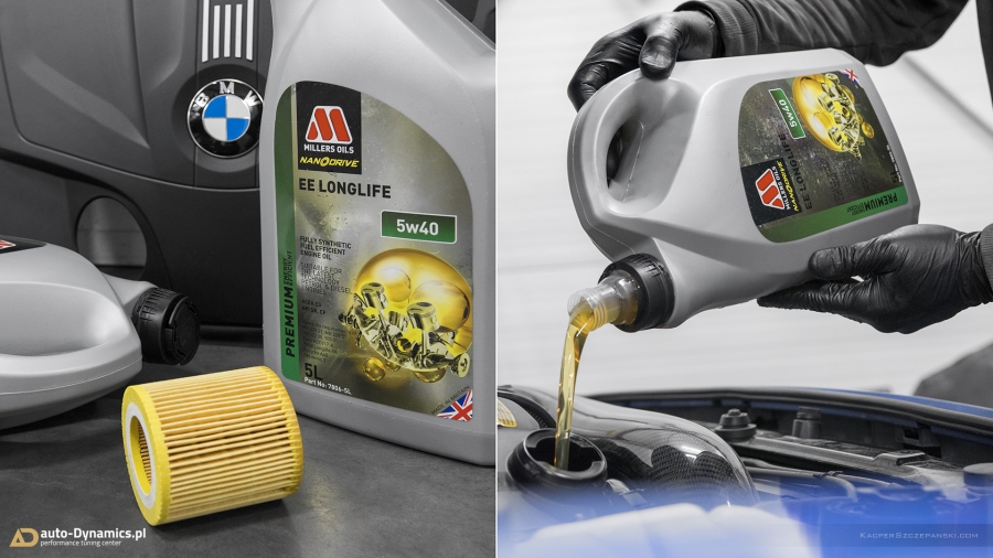 Korzystając z obecności M235i w auto-Dynamics.pl, współbieżnie z modyfikacjami a uwzględniając interwały konserwacyjne, w BMW przeprowadziliśmy dodatkowo pełen profesjonalny serwis olejowy z wykorzystaniem zaufanych, wielokrotnie sprawdzonych w naszych projektach, niezawodnych olei Millers, które znacznie przewyższają zadane i wytyczone przez bawarską fabrykę normy. Rzędowa jednostka napędowa zapełniona została wysokiej klasy olejem o specyfikacji 5W40 – z technologią NT w połączeniu z OEM filtrem BMW. Ponadto całkowicie oczyściliśmy i zakonserwowaliśmy wieczysty, imponująco-wydajny filtr powietrza goszczący w karbonowym układzie dolotowym Eventuri. Dopełniając metodykę oraz ścisłość reguł przeglądu, w BMW przeprowadziliśmy całkowitą, profesjonalną, zaawansowaną diagnostykę komputerową [przy pomocy najnowocześniejszego oprogramowania firmy TEXA] oraz wszelkie wymagane adaptacje i regulacje. Wszystkie wykonane czynności przeglądowo-serwisowe, przy zachowaniu szczegółowych procedur i wytycznych BMW oraz naszych wewnętrznych, wyśrubowanych standardów dla pojazdów przez nas zmodyfikowanych - potwierdzone zostały należytym wpisem w elektronicznym systemie centrali BMW AG, tworząc tym samym kompletną historię pojazdu w e-książce producenta, jednocześnie gwarantując bezawaryjną i bezproblemową eksploatację pojazdu o spotęgowanych osiągach przez kolejne tysiące kilometrów.