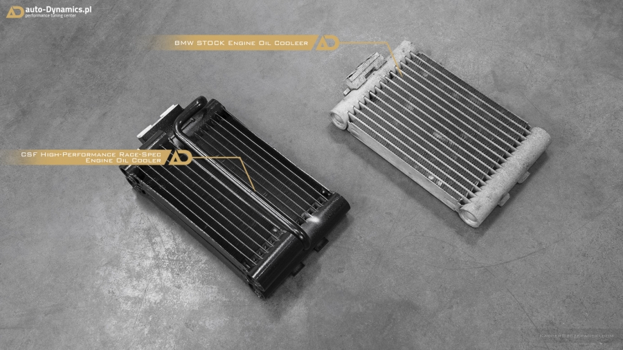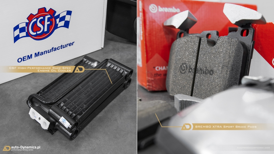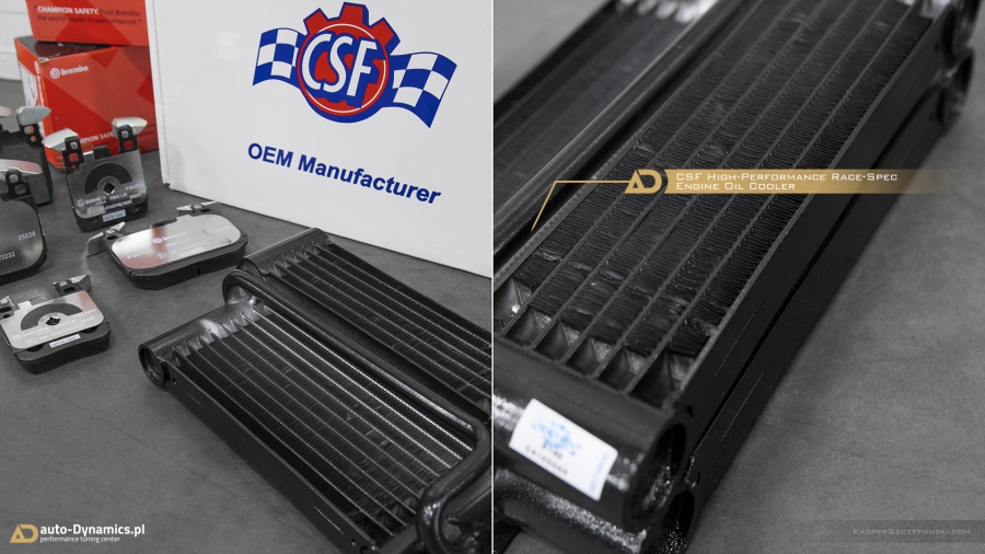 Wykorzystując audiencję M235i, przystąpiliśmy do następnego epizodu metamorfozy, implementując w układ chłodzenia jednostki napędowej, profesjonalną, wysoce wydajną, bezkompromisową chłodnicę oleju silnikowego pochodzącą z palety produktów renomowanego, utytułowanego producenta, firmy CSF. Transformacja ta, dzięki zastąpieniu skrajnie niewydolnej fabrycznej chłodnicy, dwu-rdzeniowym „coolerem” CSF o zwiększonym wolumenie areału chłodniczego, pozwoliła skutecznie zredukować temperaturę roboczą oleju silnikowego [ca. ~12-15°C] co w konsekwencji, szczególnie w trakcie dynamicznej jazdy, skutkuje radykalnie dłuższym i bezawaryjnym okresem użytkowania silnika kodyfikowanego przez producenta jako N55B30. Niezaprzeczalne stanowi również fakt, iż cały zestaw CSF pozwolił zwiększyć litraż wysoce-wydajnego oleju Millers który pracuje w trzy litrowej, rzędowej szóstce, dzięki czemu sam lubrykant eksploatować i zużywać będzie się dużo wolniej. #ApprovedByAD