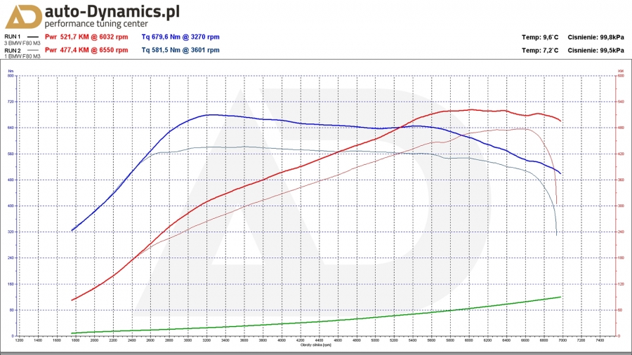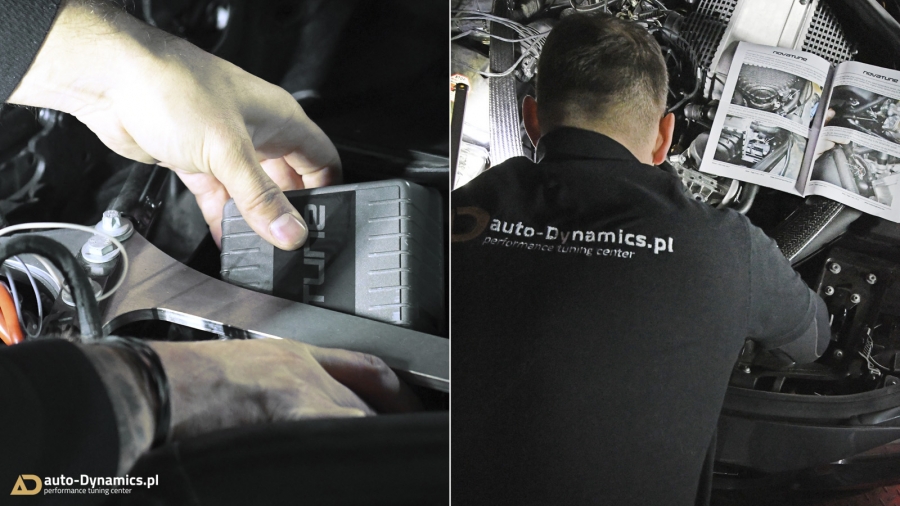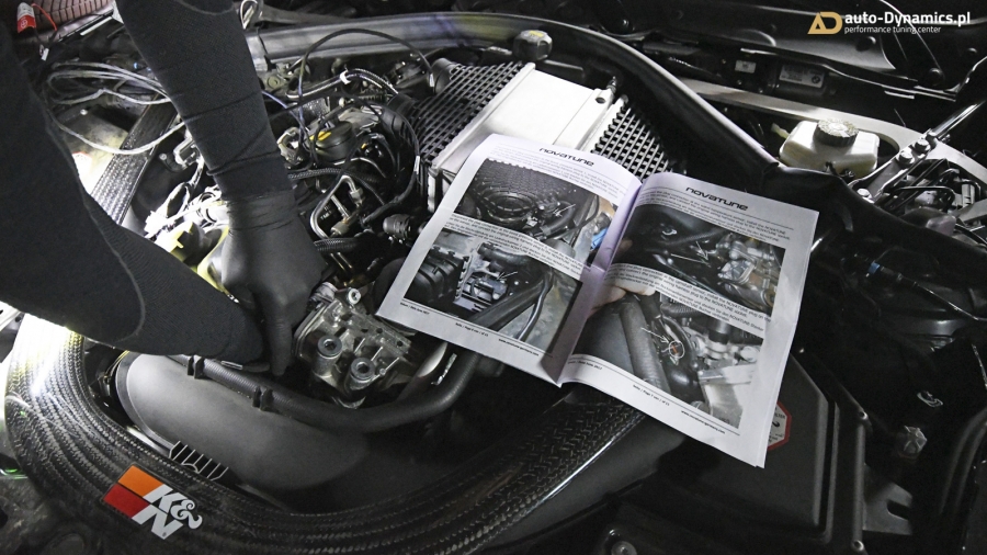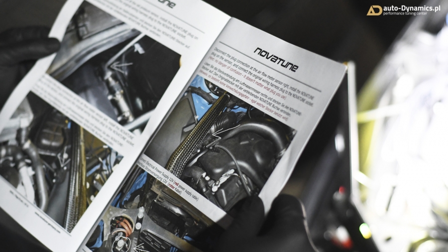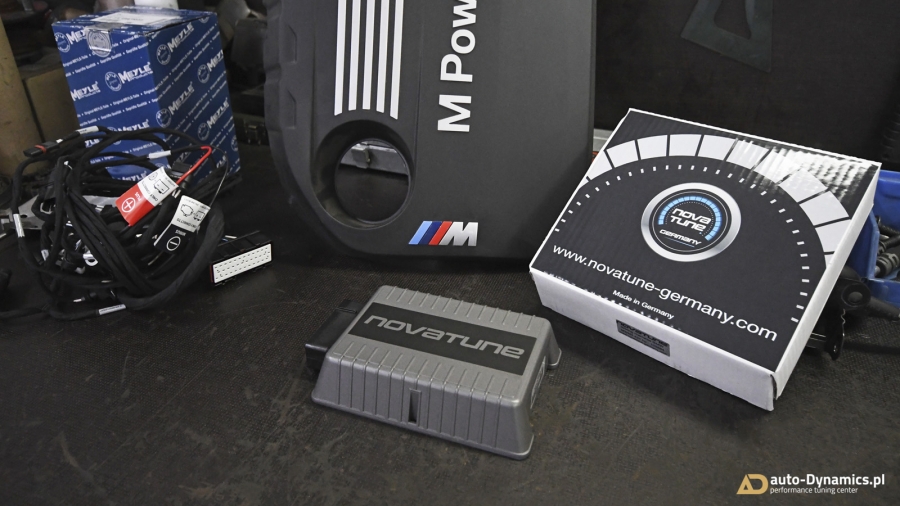 W BMW z racji obowiązującej gwarancji, zainstalowany został profesjonalny, w pełni cyfrowy, dedykowany, zewnętrzny komputer ECU wraz z specjalną, rozbudowaną wiązką elektroniczną komunikującą się z sensorami magistrali CAN. Kontroler od renomowanego, niemieckiego producenta - firmy Novatune. ECU zapewnia osiągi i bezpieczeństwo identyczne do typowego chiptuningu przez OBD. Moduł korzysta z map z dynamiczną adaptacją - monitoruje wiele wartości w czasie rzeczywistym i elastycznie dobiera wskazania. Właściwości fabryczne podane przez BMW to: 450KM i 550Nm [Wyniki pomiaru seryjnych wartości to 477KM i 581Nm]. Efekty naszego zabiegu zmierzone na hamowni to 521KM i 679Nm [Przyrost +44KM i +98Nm (+71KM i +129Nm w stosunku do wartości katalogowych)]. Wzrost parametrów na tym poziomie zapewnia absolutną bezawaryjność jednostki napędowej w połączeniu z rewelacyjnymi osiągami pozwalającymi na bezpieczne wyprzedzanie w każdych okolicznościach i warunkach drogowych. Różnica przyspieszenia w przedziale 100-200km/h jest kolosalna. Odczucia z jazdy są teraz naprawdę niesamowite, a elastyczność zdumiewa na każdym biegu!