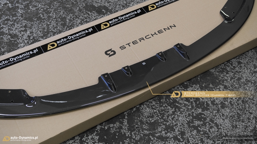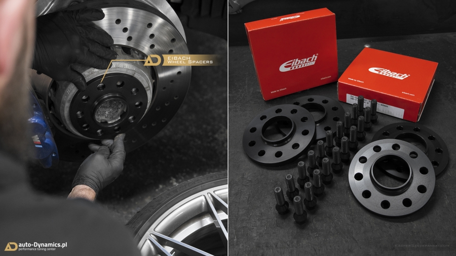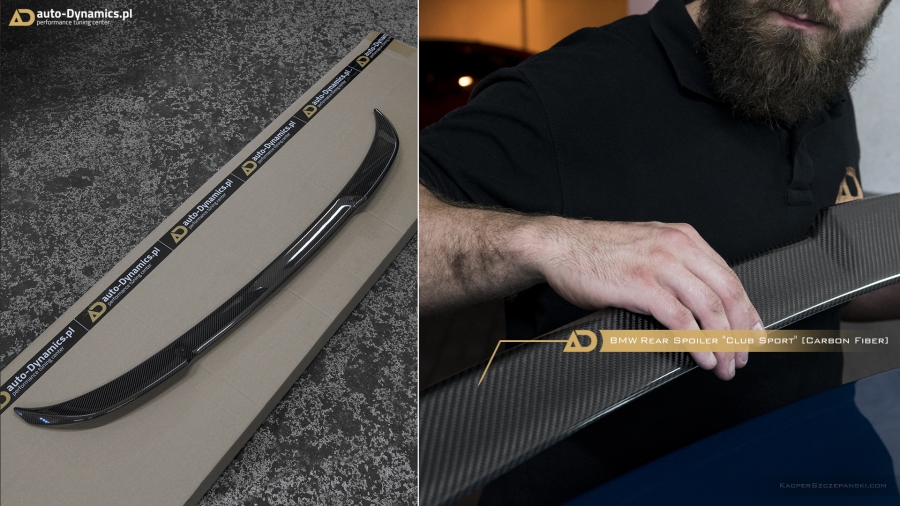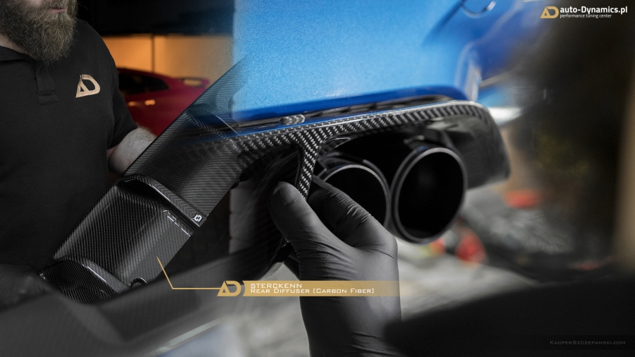 Konsekutywny „Stage” transformacyjnej metamorfozy to urzeczywistnienie konceptu i strategii związanej z wyeksponowaniem i akcentacją atrybutów stricte estetycznych. Intensyfikację dynamiki w odbiorze bryły pojazdu rozpoczęliśmy od profesjonalnego montażu elementów wykonanych z niczym niedomieszkowanego włókna węglowego [carbon fiber] pochodzących z palety produktów od renomowanego, europejskiego producenta – firmy Sterckenn. Przedni zderzak doposażyliśmy w aerodynamiczny spoiler w sekcji dolnej oraz zestaw spójnych stylistycznie nakładek w części górnej. W dolnym segmencie zderzaka tylnego zagościł zaprojektowany w koherentnym do przedniego spoilera stylu – dyfuzor, który zastąpił mało finezyjną, sztampową blendę BMW. Tylna pokrywa / maska bagażnika otrzymała, również karbonowy, oryginalny spoiler „CS – Club Sport” BMW Motorsport instalowany fabrycznie przez producenta w modelach M3 CS a który to stanowi stylistyczną fuzję z aero-częściami Sterckenn. Nie bez znaczenia pozostaje również fakt identycznej struktury ułożenia i splotu włókna węglowego w każdym z zainstalowanych podzespołów. Celem zapewnienia ostatecznego szlifu i nadania jeszcze wyższej stabilności – w ///M3 zainstalowany został zestaw aluminiowych dystansów poszerzających niemieckiej firmy Eibach, naturalnie wraz z kompletem adekwatnie dłuższych śrub [pakiet w kolorze czarnym]. Montaż pierścieni pozwolił zrównać i licować felgi z linią błotnika, które w konsekwencji idealnie wypełniły nadkola.