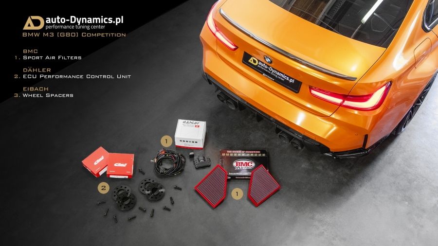 Nad ów wyjątkowym egzemplarzem ///M3 mieliśmy sposobność pracować w auto-Dynamics.pl jakiś czas temu, wówczas koncertując działania nad radykalną poprawą akustyki pojazdu paralelnie z nutą stylistycznego indywidualizmu [mods-Stage#1]. Podczas ówczesnej wizyty, skoncentrowaliśmy się nad poprawą elastyki i osiągów 3-litrowej, dualistycznie-doładowanej, rzędowej jednostki napędowej kodyfikowanej przez BMW jako S58. Respektując i uwzględniając obowiązującą gwarancję producencką, celem dynamicznej intensyfikacji właściwości tabelarycznych generowanych przez sześcio-cylindrowy silnik, w M3 [generacji G80] zainstalowany został profesjonalny, w pełni cyfrowy, dedykowany, zewnętrzny komputer ECU [Engine Control Unit] wraz z specjalną, rozbudowaną wiązką elektroniczną komunikującą się z sensorami magistrali CAN. Modyfikacja ta jest nieinwazyjna, nie wymaga zmian w fabrycznym oprogramowaniu i jest w pełni odwracalna gdy sytuacja tego wymaga [moduł wraz z wiązką można zdemontować bez pozostawienia żadnych śladów (mechanicznych i elektronicznych)]. Zainstalowany przez #teamAD kontroler wywodzi się z serii Competition Line od renomowanego, szwajcarskiego producenta i tunera pojazdów BMW - firmy dÄHLer [dÄHLer Design & Technik GmbH]. Zaawansowany, zewnętrzny sterownik ECU zapewnia osiągi i bezpieczeństwo silnika identyczne do typowego chiptuningu przez OBD. Moduł korzysta z map z dynamiczną adaptacją - monitoruje wiele wartości w czasie rzeczywistym i elastycznie dobiera wskazania, sięgając po drzemiący w 3-litrowej jednostce potencjał i przekuwa go w potężny zastrzyk przyrostu mocy i momentu obrotowego jak również znacznie zwiększa elastyczność dostępną w pełnym zakresie obrotów. Dodatkowo w ///M3 zamontowane zostały sportowe, wysokoprzepustowe, wieczyste filtry powietrza od renomowanego, włoskiego producenta - firmy BMC które to wyeliminowały skrajnie niewydolne, papierowe filtry fabryczne dostarczając po wymianie większą dawkę chłodnego i mniej zabrudzonego powietrza to komory spalania. Właściwości nominalne / katalogowe przedstawione przez BMW to: 510KM (375kW) i 650Nm [Wyniki pomiaru seryjnych wartości z zainstalowanych układem wydechowym i filtrami powietrza to 523KM (384kW) i 681Nm]. Efekty naszego zabiegu zmierzone na hamowni [paliwo RON98] to 612KM (450kW) i 764Nm [Przyrost: +102KM (+75kW) i +114Nm w stosunku do wartości katalogowych a +89KM (+66kW) i +83Nm w stosunku do wartości rzeczywistych]. Wzrost parametrów na tym poziomie zapewnia absolutną bezawaryjność jednostki napędowej w połączeniu z rewelacyjnymi osiągami pozwalającymi na bezpieczne oraz dynamiczne wyprzedzanie w każdych okolicznościach i warunkach drogowych. Różnica przyspieszenia zarówno w przedziale 0-100km/h jak i 100-200km/h oraz 200km/h-UP jest absolutnie kolosalna. Odczucia z jazdy, w połączniu z napędem ///M xDrive, są teraz naprawdę niesamowite, a elastyczność dzięki momentowi obrotowemu dostępnemu w szeroki i pełnym zakresie obrotów zdumiewa na każdym biegu! #Performance&WarrantyWithAD