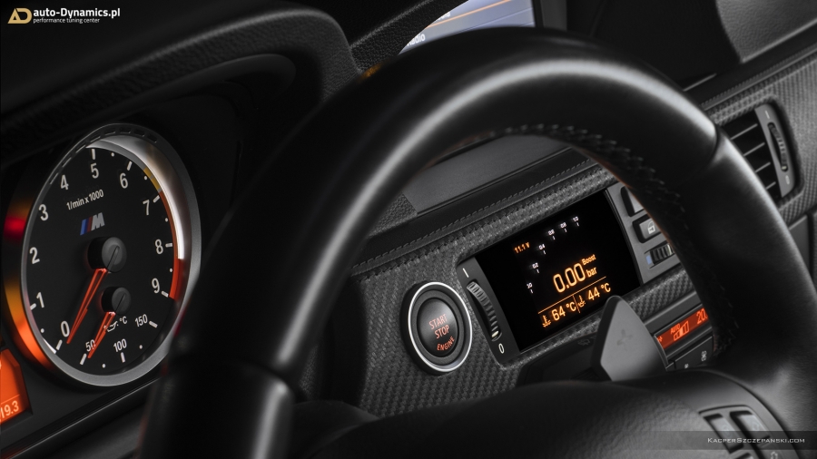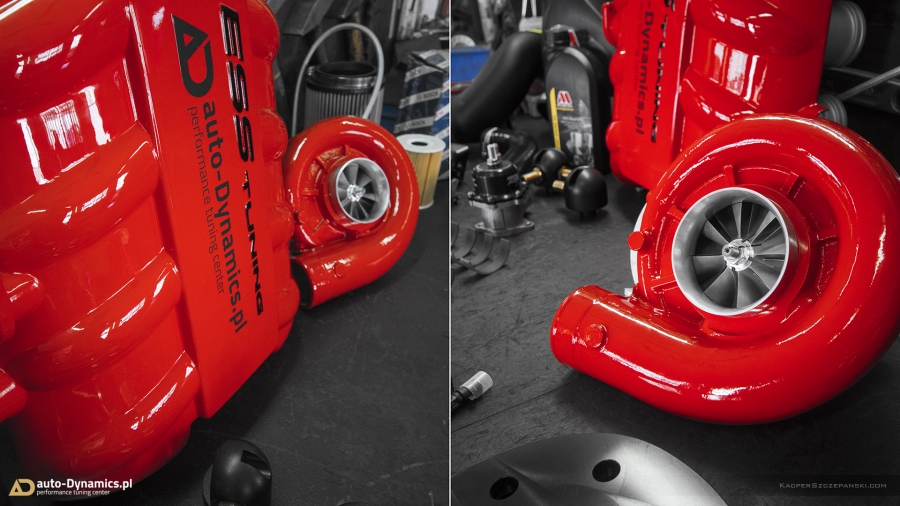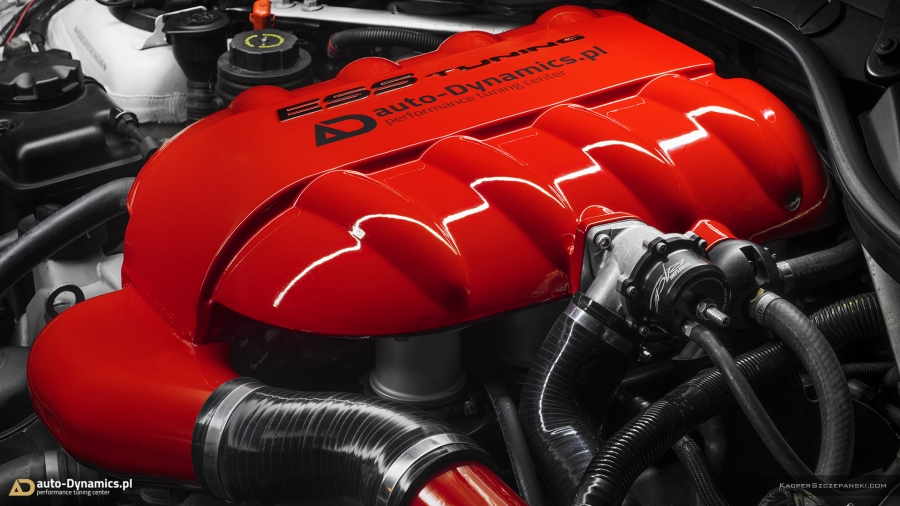 Realizując ścisłe założenia koncepcyjne całego projektu, eskalację osiągów fenomenalnego ///M3 rozpoczęliśmy od montażu ultra-wydajnego, rozbudowanego zestawu kompresora w wersji VT2-625 z dodatkowym chłodzeniem od renomowanego producenta – firmy ESS Tuning. Kompletacja zestawu to między innymi dużo wydajniejsze wtryskiwacze, frontowy wymiennik ciepła, przeprojektowany system dolotu powietrza oraz oczywiście kolektor dolotowy i jednostka kompresora. Całością systemu zawiaduje profesjonalnie zmodyfikowane oprogramowanie ECU przygotowane przez inżynierów z ESS. Zmodernizowany software objął dodatkowo 7-biegową przekładnie DCT / DKG. Skrzynia biegów zawiadywana przez program ESS znakomicie współpracuje z zwiększoną mocą i momentem obrotowym generowanym przez doładowaną widlastą jednostkę napędową w układzie V8.