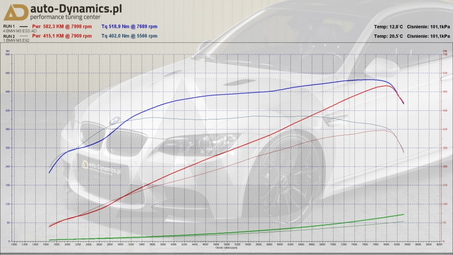 Właściwości fabryczne podane przez BMW to: 420KM i 400Nm [Wyniki pomiaru rzeczywistych wartości to 415KM i 402Nm (M3 przeszło wcześniej chiptuning i zostało wyposażone w sportowy układ wydechowy)]. Efekty naszego zabiegu zmierzone na hamowni to 582KM i 519Nm [Przyrost +167KM i +117Nm]. Wzrost parametrów na tym poziomie, paralelnie z przeprowadzonymi równolegle modyfikacjami mechanicznymi oraz software’owymi zapewnia absolutną bezawaryjność jednostki napędowej w połączeniu z rewelacyjnymi osiągami pozwalającymi na bezpieczne wyprzedzanie w każdych okolicznościach i warunkach drogowych oraz torowych. Poziom elastyczności na każdym biegu jest absolutnie zdumiewający a odczucia z jazdy są literalnie ekstremalne!