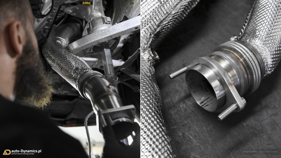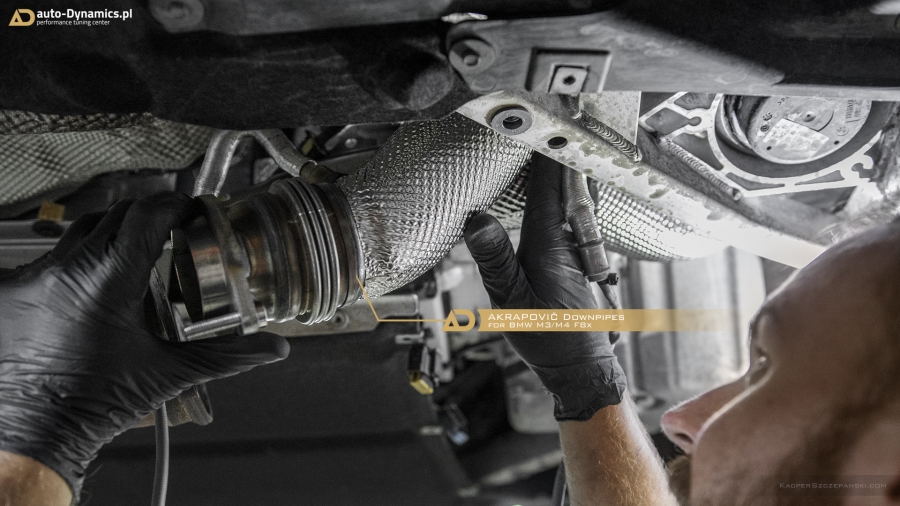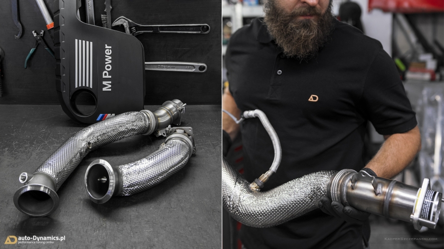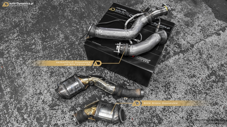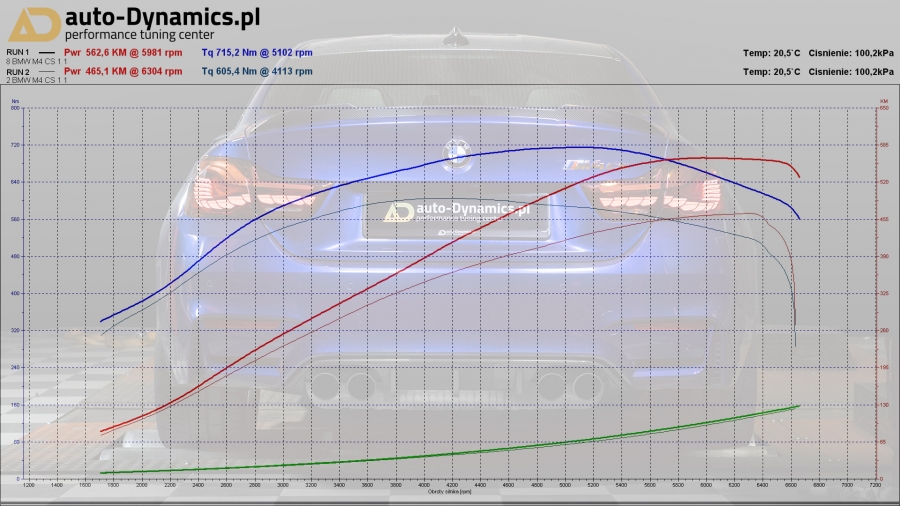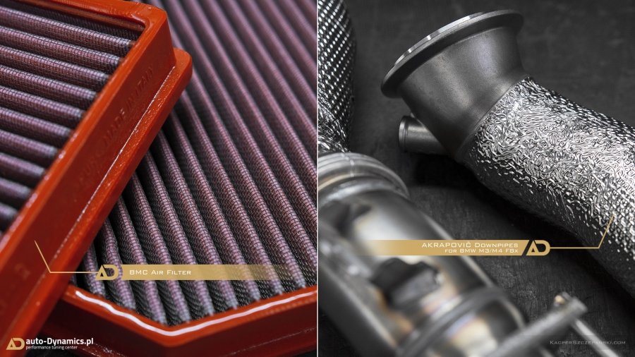 Redefinicję cech ClubSport’a rozpoczęliśmy od eliminacji „wąskiego gardła” tj. zastąpienia fabrycznych, restrykcyjnych katalizatorów ich bezkompromisową odmianą pod postacią w pełni przelotowych, zapewniających maksymalizację przepustowości gazów spalinowych, wykonanych z nierdzewnej stali kwasoodpornej, rur „Downpipe’s” od renomowanego, słoweńskiego producenta – firmy Akrapovic. Montaż zestawu rur DP naturalnie i zgodnie z modyfikacyjną sztuką przy zastosowaniu nowych [OEM BMW] podzespołów [uszczelki, śruby etc.]. Kolejno, seryjne, skrajnie niewydolne, papierowe filtry powietrza ustąpiły miejsca ich wyczynowej odmianie a ściślej, zestawowi sportowych, wieczystych filtrów powietrza firmy BMC które zapewniły zwiększony dopływ powietrza do turbosprężarek. Wykorzystując potencjał wszystkich, merytorycznie zaplanowanych i w konsekwencji przeprowadzonych modyfikacji mechanicznych, w ClubSporcie dokonaliśmy profesjonalnego, indywidualnego strojenia [chiptuning] komputera sterującego ECU. Uwzględniając zastosowanie pojazdu zgodnie z jego pierwotnym przeznaczeniem [track day’s] linia przebiegu momentu obrotowego została specjalnie i charakterystycznie wymodelowana. Celowo, z powodów trakcyjnych, zlimitowaliśmy moment w dolnej partii obrotów i uwypukliliśmy w górnej sekcji, czyli de facto powyżej pułapu w którym pojazd osiąga już pełne zdolności trakcyjne na oponach typu semi-slick [Pirelli Trofeo R]. Krzywe wymodelowane zostały tak, by moc oddawana była jak najbardziej liniowo. Właściwości fabryczne podane przez BMW to: 460KM i 600Nm [Wyniki pomiaru seryjnych wartości to 465KM i 605Nm]. Efekty naszego strojenia zmierzone na hamowni to 562KM i 715Nm [Przyrost +97KM i +110Nm]. Stabilny i track’owy full spec winien idealnie zaakcentować i podkreślić właściwości ClubSport’a podczas wyczynowych zmagań. #TrackWeapon by #AD