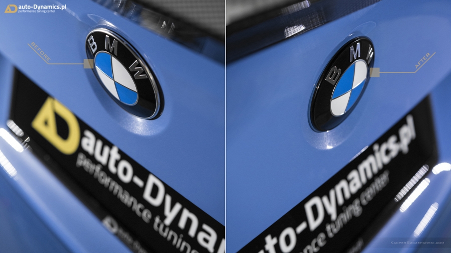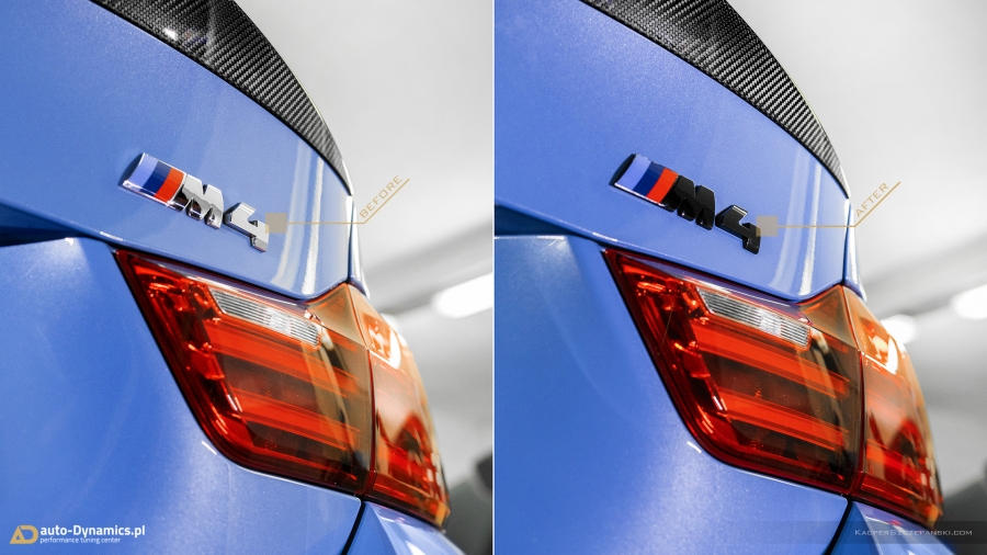 Precyzyjne założenia koncepcyjne projektu, konstytuowały całość prac związanych z eskalacją atrybutów systemu hamulcowego - w sposób czysto merytoryczny, uargumentowany i odpowiedzialny. W ///M4 - seryjne, puchnące, mało wydajne a z czasem parciejące – gumowe przewody zastąpiliśmy przewodami hamulcowymi w stalowym oplocie – komplet od renomowanego, niemieckiego producenta, wraz z homologacją TUV – firmy Fischer Hydraulik / Stahlflex. W całym układzie hamulcowym wymieniony został płyn na wyczynowy wariant o ekstremalnie wysokiej temperaturze wrzenia i znakomitej odporności higroskopijnej [Płyn „Performance Brake Fluid” brytyjskiej firmy Millers]. Dodatkowo w BMW zamontowane zostały sportowe, wysokoprzepustowe, wieczyste filtr powietrza firmy BMC - eliminujące skrajnie niewydolne, papierowe filtry. Bawarskie Coupé uzupełniliśmy ponadto o pakiety kosmetyczny. Modyfikacje obejmowały wymianę przedniego oraz tylnego emblematu BMW na wersję wykończoną głębokim, czarnym połyskiem [produkt firmy IND] oraz w tożsamym wykończeniu kolorystycznym insygnia modelowe ///M4 zainstalowane na tylnej pokrywie bagażnika [również IND] – minimalizując jednocześnie obecność niepasującego do sportowego charakteru pojazdu „chromu”.