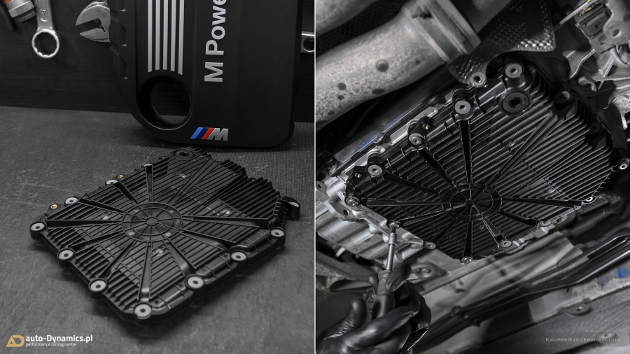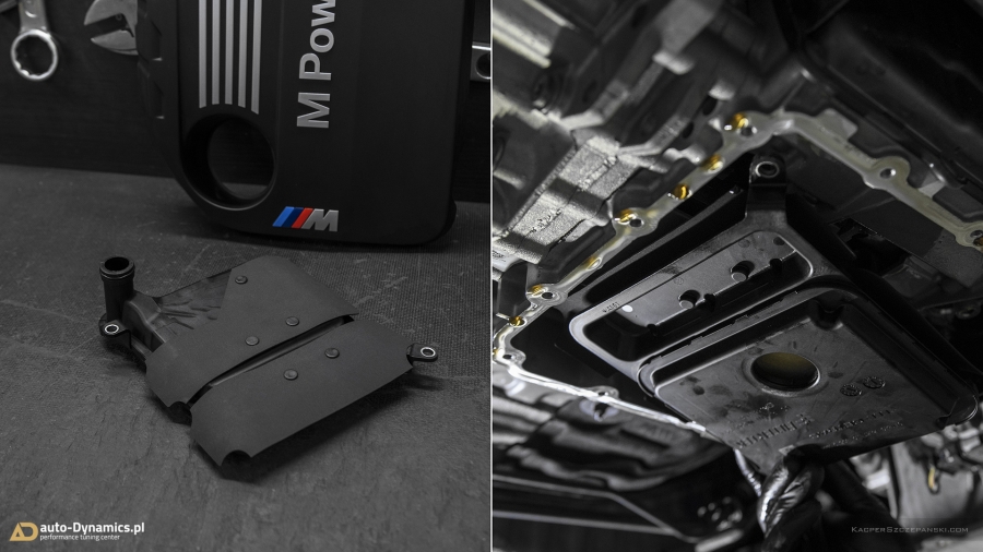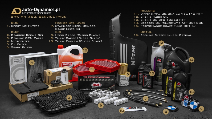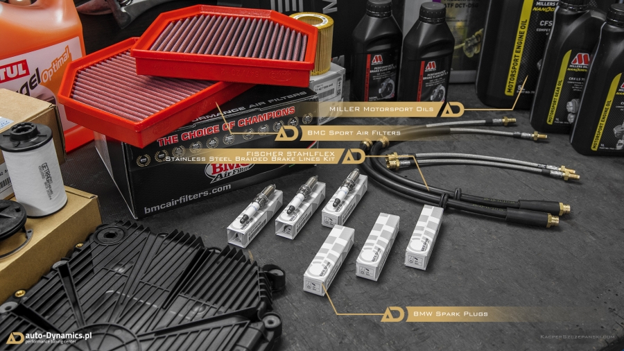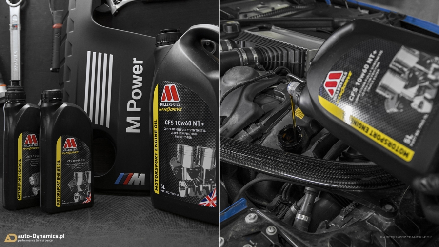 Skuteczna recepta zapewniająca perfekcyjną kondycję i długowieczną sprawność eksploatacyjną zmodyfikowanego pojazdu to częstsza dbałość o intensywniej użytkowane podzespoły mechaniczne auta. W auto-Dynamics.pl otaczamy profesjonalną opieką serwisową każdy pojazd w którym mieliśmy sposobność czynić mniejsze lub większe modyfikacje, a goszczące u nas BMW stanowi idealny casus konstatujący przywołane fakty. Współbieżnie z kolejnym etapem metamorfozy, uwzględniając interwały konserwacyjne, przeprowadziliśmy dodatkowo pełen profesjonalny serwis olejowy z wykorzystaniem zaufanych i niezawodnych olei i lubrykantów brytyjskiej firmy Millers, które znacznie przewyższają zadane przez bawarską fabrykę normy. Rzędowa jednostka napędowa zapełniona została wysokiej klasy olejem z serii Motorsport, o specyfikacji 10W60 z NT+ w połączeniu z oem’owym filtrem marki BMW, po wcześniejszym zastosowaniu płukanki silnikowej Millers [Engine Flush] odpowiednio przygotowującej jednostkę napędową S55B30 do współpracy z najwyższej próby olejem. Active M Differential tj. mechanizm różnicowy o ograniczonym poślizgu wypełniony został olejem CRX LS NT+ o charakterystyce 75W140 NT+ – pochodzącym również z ultra wydajnej serii Motorsport. W skrzyni biegów zagościł Millermatic ATF DCT-DSG, naturalnie w połączeniu z kompletem nowych [OEM BMW] podzespołów i filtrów przewidzianych przez producenta do przeprowadzenia takowej procedury w 7-Gang-Doppelkupplungsgetriebe. W całym systemie chłodzenia zaaplikowany został płyn firmy Motul. Biorąc pod uwagę wszelki dyrektywy BMW, w silniku „eMki” zagościł zestaw nowych, oem’owych świec zapłonowych a czystość powietrza w przedziale pasażerskim zapewnia nowy, przeciwpyłowy filtr kabinowy.