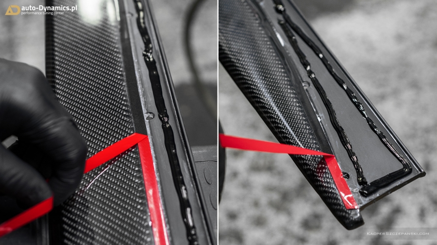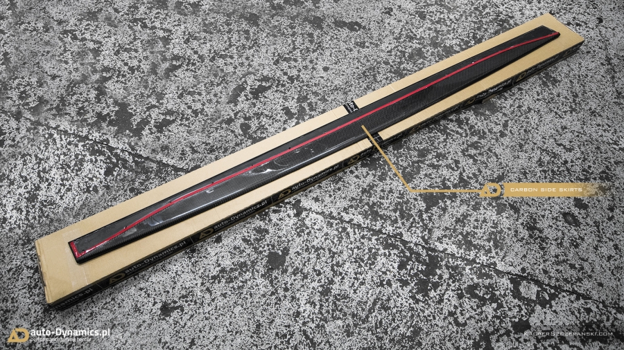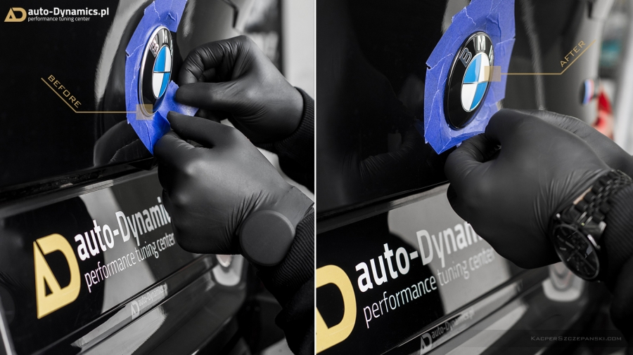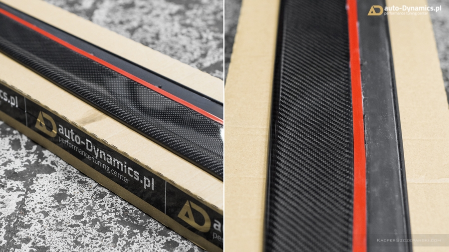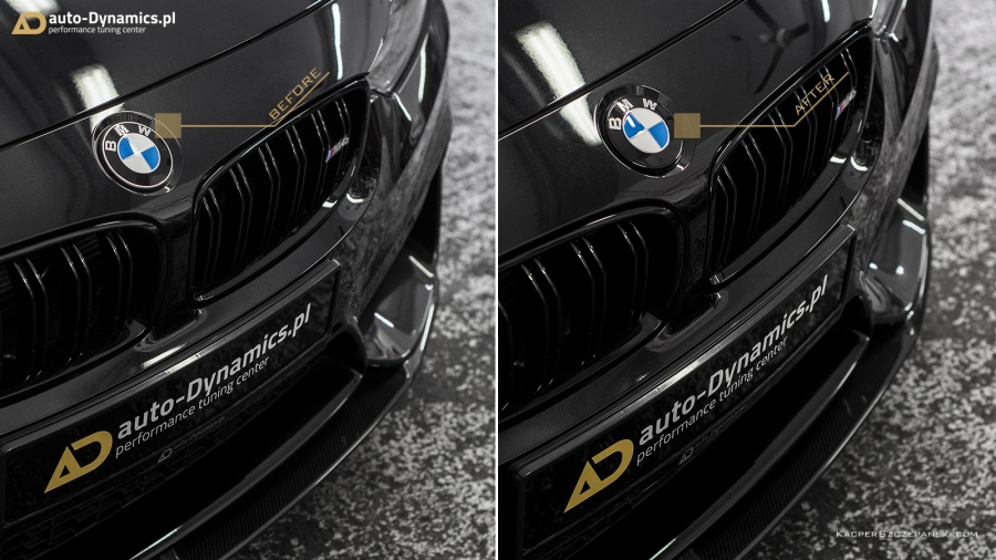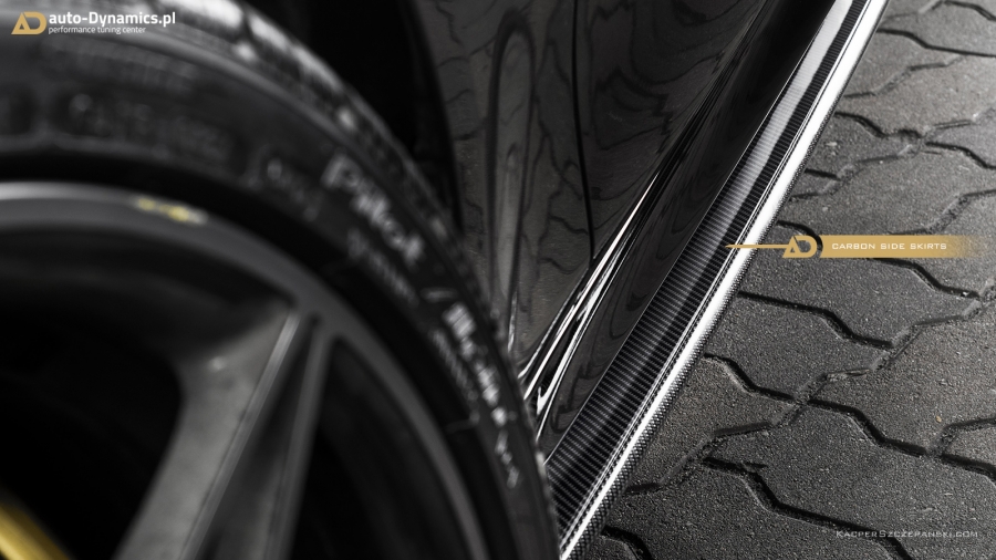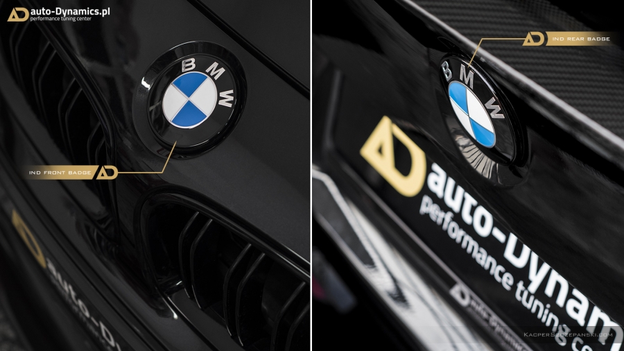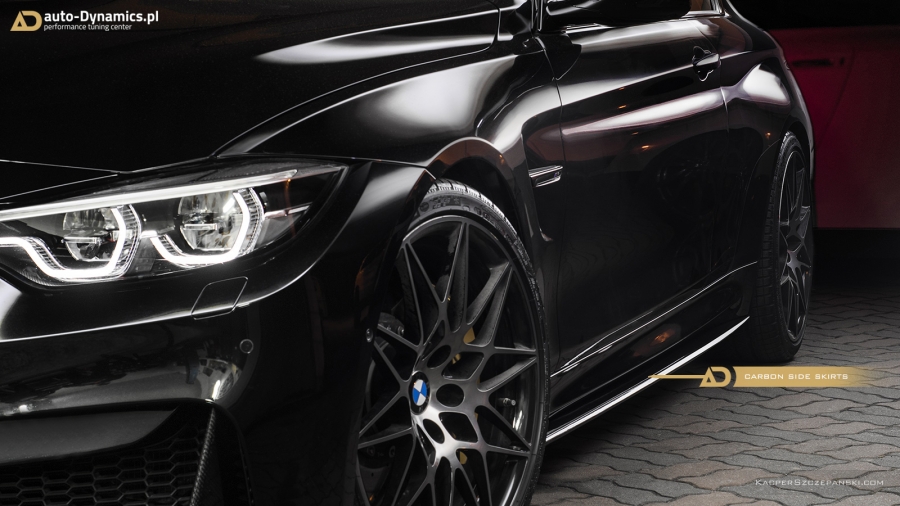 Kolejny „Stage” to konsekwentna realizacja ściśle przyjętej wizji i planu, których założenia zostały zdefiniowane w sposób jasny i klarowny. W pierwszym etapie zajęliśmy się uzupełnieniem strony wizualno-estetycznej „eM Cztery” w podzespoły zapewniające stylistyczną fuzję z wcześniej zainstalowanymi elementami pakietu aero. Modyfikacje obejmowały m.in. wymianę przedniego oraz tylnego emblematu BMW na wersję wykończoną głębokim, czarnym połyskiem [produkt firmy IND] – minimalizując jednocześnie obecność niepasującego do sportowego charakteru pojazdu „chromu”. Następna zmiana gwarantująca koherentność stylu paralelnie z agresywnością to montaż listew progowych. Progi pochodzą z linii OEM akcesoriów BMW M Performance. Na specjalne życzenie zostały pokryte włóknami karbonizowanymi [carbon] oraz wylakierowane bezbarwnie lakierem w wysokim połysku. Sploty i struktury włókna dobrane zostały tożsamo do wcześniej zainstalowanych części karbonowych. Listwy progowe w połączeniu z przednim spoilerem i tylnym dyfuzorem oraz „lotką” tworzą jednolitą, spójną i arcy energiczną linię.