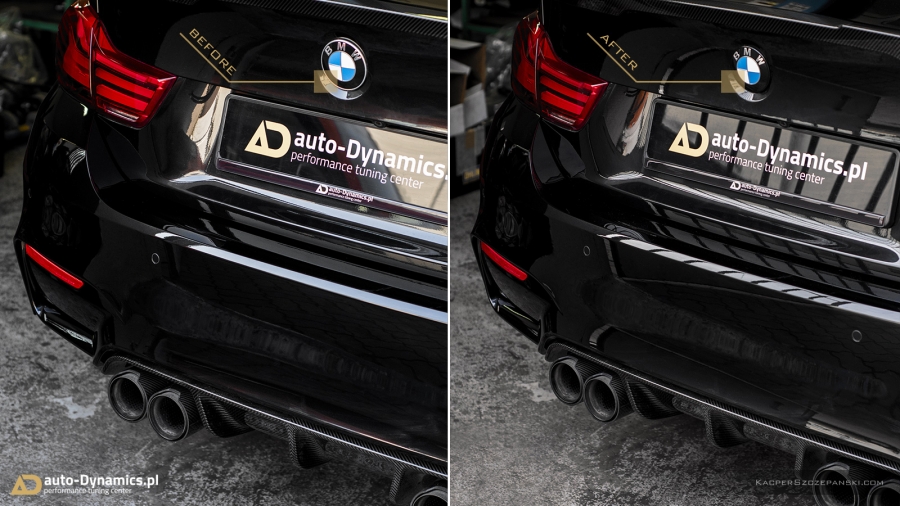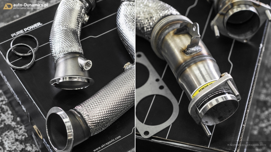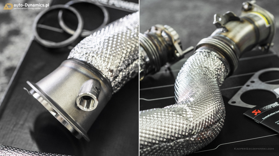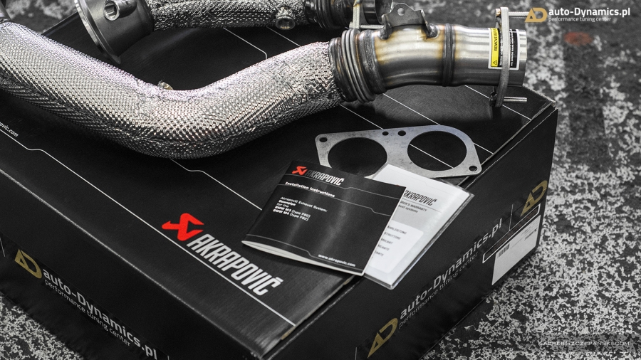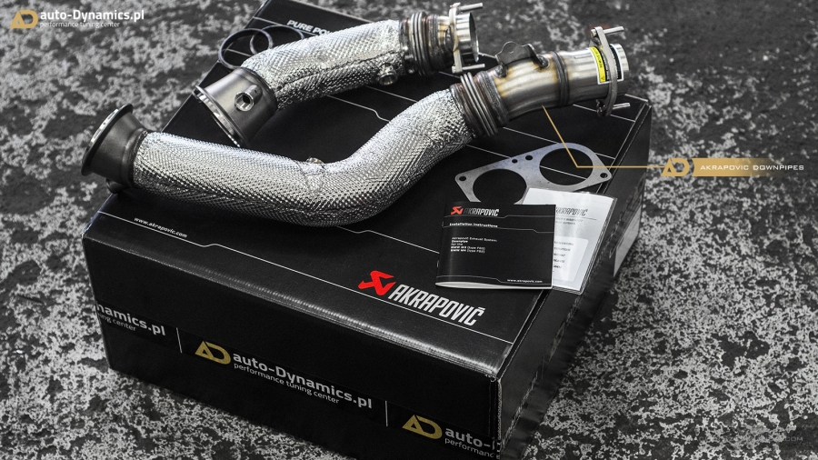 Następny stopień rozwoju projektu „Competition²” to eliminacja fabrycznych, restrykcyjnych katalizatorów za pomocą dedykowanych rur „Downpipes”. Zestaw od renomowanego, słoweńskiego producenta – firmy Akrapovic. Downpipe’y w M4 pozwoliły na znaczną poprawę przepustowości gazów spalinowych oraz redukcję ciśnienia zwrotnego, co w konsekwencji zaowocowało przyrostem mocy i momentu obrotowego. Obecnie BMW legitymuje się parametrami zweryfikowanymi na hamowni, wynoszącymi odpowiednio: 550KM i 720Nm. Dodatkowym, pozytywnym rykoszetem wyeliminowania seryjnych katalizatorów jest spektakularna, powalająca wręcz poprawa akustyki, w szczególności podczas permanentnie otwartych zaworów / przepustnic zaimplementowanych w wyczynowym układzie wydechowym BMW M Performance. Brzmienie emitowane przez BMW M4 jest w pełni regulowane za pomocą wcześniej zainstalowanego wyświetlacza Awron [system odpowiada również za brak błędu CEL].