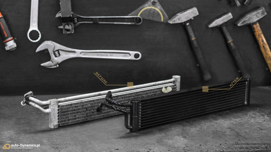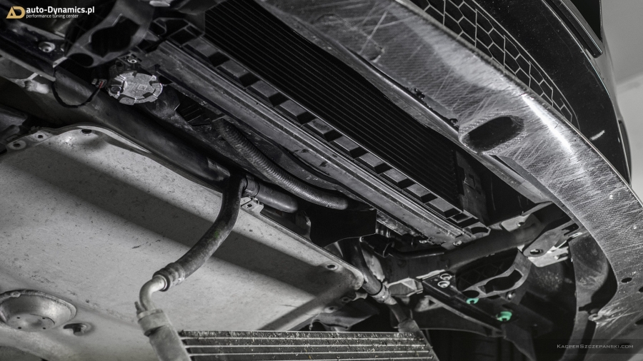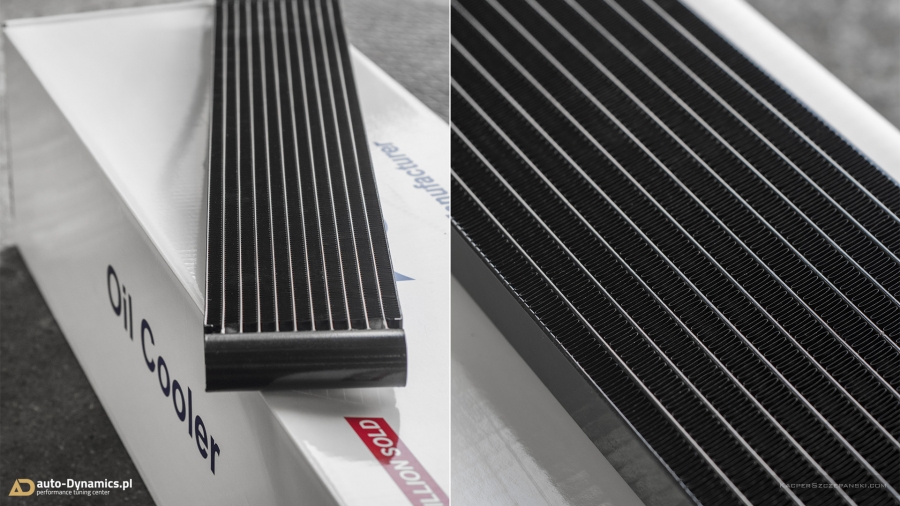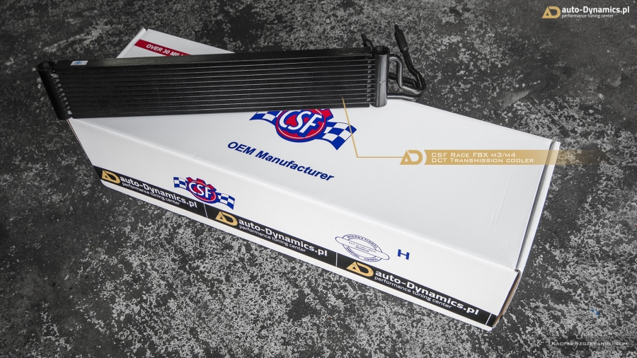 550KM | 720Nm w fuzji z dynamiczną, agresywną jazdą, startami z wykorzystaniem procedury „launch control” oraz okazjonalnymi eventami typu track-day zaskutkowały koniecznością poprawy chłodzenia sportowej, automatycznej skrzyni biegów DCT / DKG. „Competition²„ wyposażyliśmy w ultra wydajną, dedykowaną chłodnicę oleju dwusprzęgłowej przekładni o efektywniejszym, dużo potężniejszym rdzeniu o znacznie większej objętości. Chłodnica z serii „Race” od renomowanego producenta, firmy CSF Radiators. Transmission Oil-Cooler instalowany jest w schemacie plug&play, poprawia operatywność chłodzenia o 30% w konfrontacji z fabrycznym, mało wydajnym wymiennikiem ciepła.