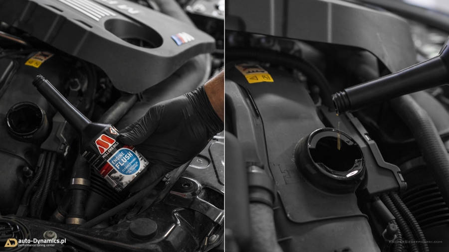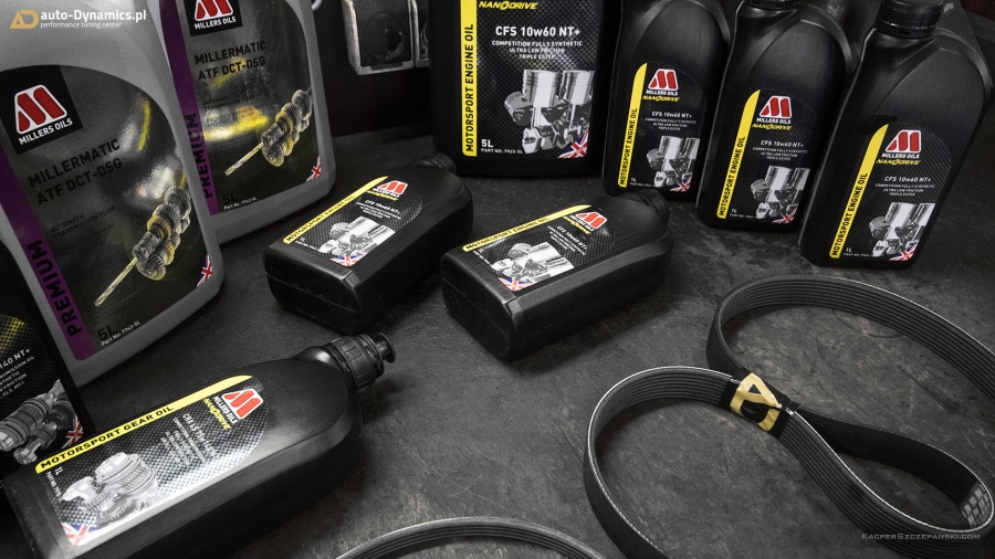 Korzystając z obecności eMki w auto-Dynamics.pl, pozostając jednocześnie w tematyce czynników smarujących a współbieżnie uwzględniając interwały konserwacyjne, w BMW przeprowadziliśmy dodatkowo pełen profesjonalny serwis olejowy z wykorzystaniem zaufanych i niezawodnych olei Millers, które znacznie przewyższają zadane przez monachijską fabrykę normy. Rzędowa jednostka napędowa zapełniona została wyczynowym olejem z serii Motorsport, o specyfikacji 10W60 – CFS z NT+. Active M Differential tj. mechanizm różnicowy o ograniczonym poślizgu wypełniony został olejem CRX LS NT+ o charakterystyce 75W140 – pochodzącym również z ultra wydajnej serii Motorsport.