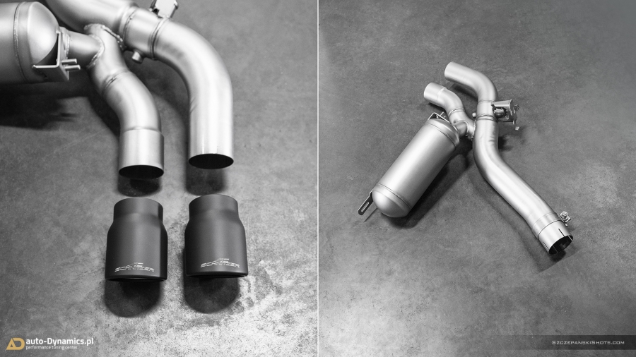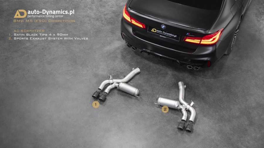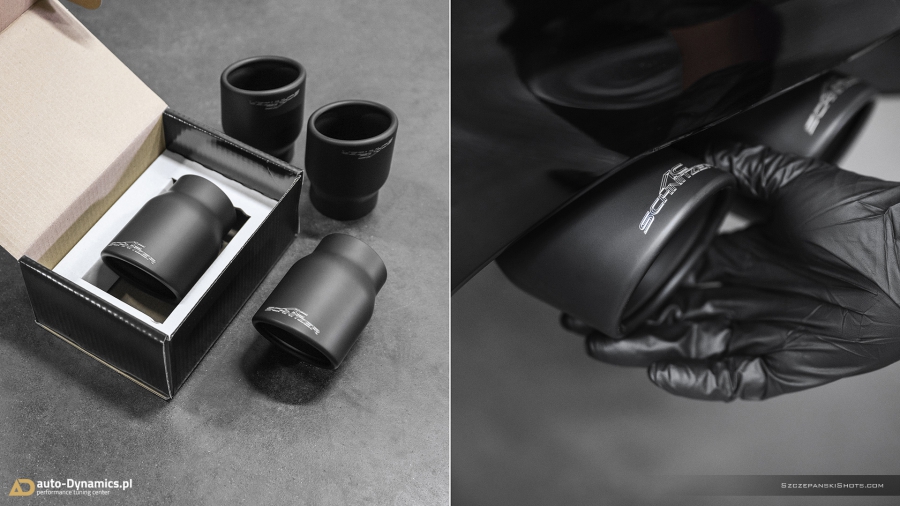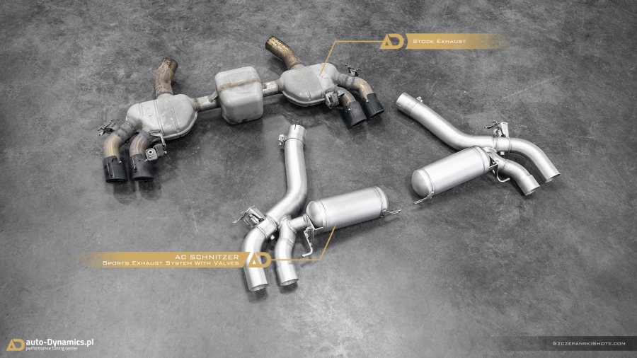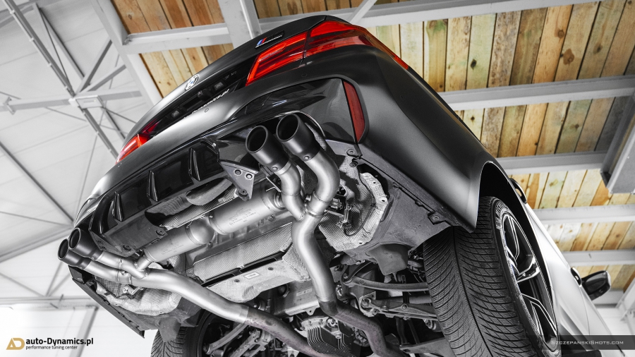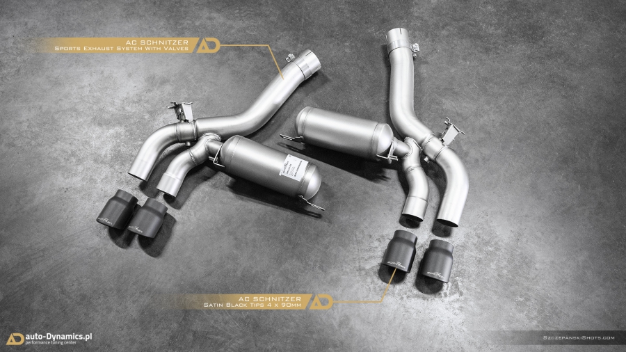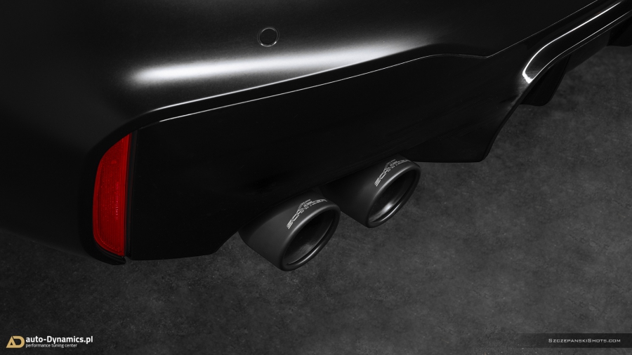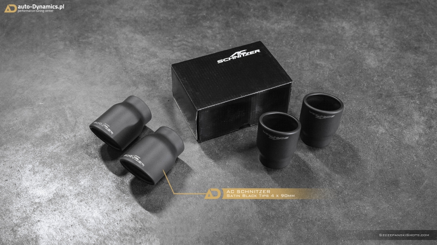 Radykalna korekta barwy dźwięków i tonów generowanych przez pojazdy uposażone fabrycznie w ekologiczne filtry OPF / GPF nie jest zadaniem trywialnym i prostym. Szczególnie w przypadku konieczności pozostawienia ów ekologicznych filtrów w nienaruszonej formie, choćby z tytułu szeregu aspektów gwarancyjnych tudzież homologacyjnych. Przemianowanie całkowicie wykastrowanej z akustyki przez uprzednio wspomniane filtry, jednostki kodyfikowanej przez BMW jako S63B44 rozpoczęliśmy od zastąpienia szalenie restrykcyjnego, seryjnego układu wydechowego – jego sportowym zamiennikiem pochodzącym od ekskluzywnego producenta specjalizującego się w tuningu pojazdów marki BMW – niemieckiej firmy AC Schnitzer. Zainstalowany w M5 przez zespół #AD układ wydechowy stanowi kompletacja zawierająca wysoko przepustowy, sportowy tłumik końcowy z zaimplementowanym systemem zaworów / przepustnic / klap których pracą to zawiaduje on-board’owy komputer [sterownik / ecu] BMW [trybo eco / comfort – zawory zamknięte (tryb cichszy) i sport / sport+ (lub M1 / M2) - zawory otwarte (tryb głośniejszy)] oraz cztery fenomenalnie prezentujące się końcówki wykończone w kolorze czarnej satyny które to jednocześnie idealnie wypełniły otwory w tylnym dyfuzorze. Credo AC Schnitzer brzmi „Beyond The Standard” – ów dewiza idealnie odzwierciedla jakość i poziom akustyki oraz charakterystykę dźwięków generowanych przez wykonany z nierdzewnej stali kwasoodpornej układ wydechowy. Zdumiewająco poprawnie wyważony balans pomiędzy niskimi, średnimi jak i wysokimi tonami plasuje system niemieckiego tunera w ścisłej czołówce wśród aftermaketowych systemów dedykowanych do BMW ///M5 [generacji F90 z OPF /GPF]. Pracujące w trybie zamkniętym zawory pozwalają w arcy-komfortowych warunkach pokonywać autostradowe odległości a tryb otwartych zaworów stanowi salwę nasyconych agresywną barwą, motoryzacyjnych dźwięków i V8-tonów. Paralelnie, stylistycznie dodając szalenie indywidualnej, charakterystycznej, dynamicznie zorientowanej fizjonomii w tylnej ekspozyturze pojazdu. #PerfectionRedefinedByAD
