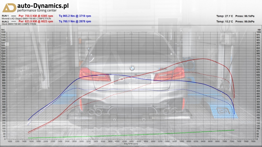 Wykorzystując potencjał wszystkich, merytorycznie zaplanowanych i w konsekwencji przeprowadzonych modyfikacji mechanicznych w ///M5 dokonaliśmy, przy zacieśnionej kooperacji #AD z MORENDI - profesjonalnego, indywidualnego strojenia [chiptuning] komputera sterującego ECU. Krzywe przebiegu mocy i momentu obrotowego wymodelowane zostały tak, by moc oddawana była jak najbardziej liniowo i w jak najszerszym zakresie. Właściwości nominalne / katalogowe prezentowane przez BMW to: 625KM (460kW) i 750Nm [wyniki pomiaru seryjnych wartości rzeczywistych to 623KM / 458kW i 760Nm]. Efekty naszych zabiegów zmierzonych na hamowni to 750KM (551kW) i 965Nm [Przyrost: +125KM (+91kW) i +215Nm w stosunku do wartości katalogowych a +127KM (+93kW) i +205Nm w stosunku do wartości rzeczywistych]. Ponadto w oprogramowaniu #F90 usunęliśmy całkowicie limiter prędkości V-Max [obecnie powyżej 340km/h+] a także dodaliśmy kilka innych opcji jak choćby intensyfikacja strzałów [pops & bangs] z układu wydechowego w trybach Sport / Sport+ [M1 / M2] oraz zmodyfikowaną procedurę startu tudzież re-kalibrację sportowych wskaźników centralnego wyświetlacza. Wzrost parametrów na tym poziomie zapewnia absolutną bezawaryjność jednostki napędowej w połączeniu z rewelacyjnymi osiągami pozwalającymi na bezpieczne wyprzedzanie w każdych okolicznościach i warunkach drogowych. Różnica przyspieszenia zarówno w przedziale 0-100km/h jak i 100-200km/h a także 200km/h-UP a także 300km/h+ jest absolutnie kolosalna. Odczucia z jazdy, w połączniu z napędem ///M xDrive, są teraz naprawdę niesamowite, a elastyczność dzięki momentowi obrotowemu dostępnemu w szerokim zakresie obrotów zdumiewa na każdym biegu! #AD-Stage2