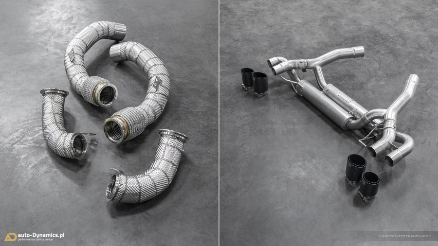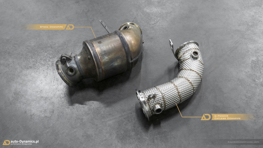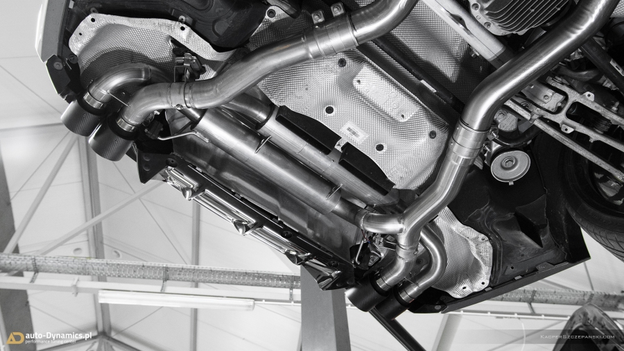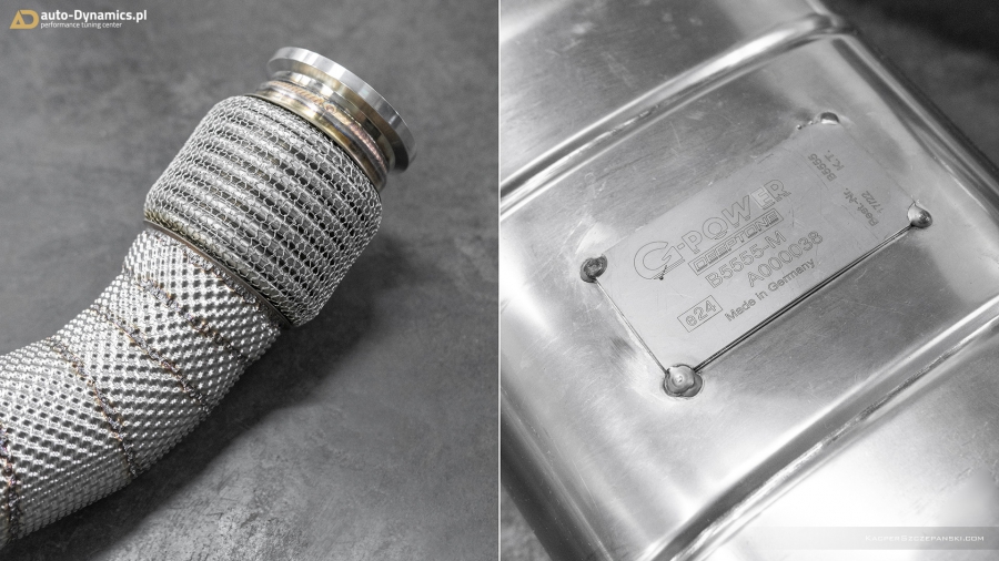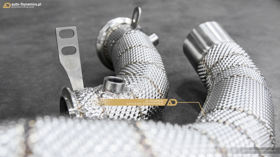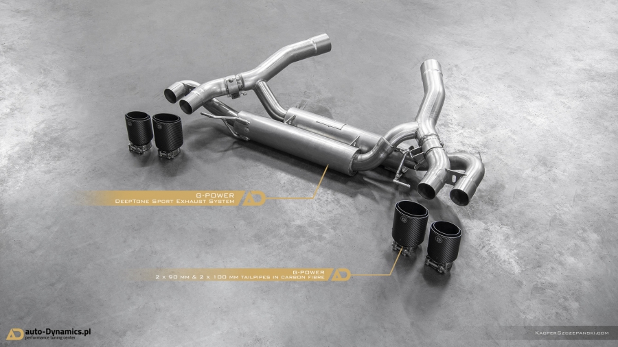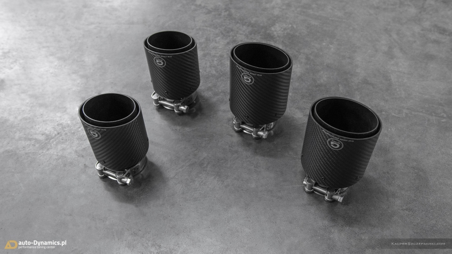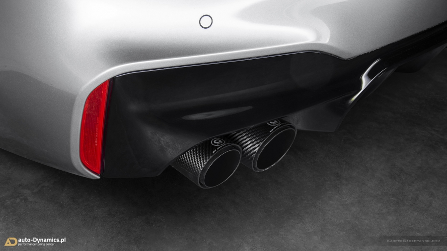 Przenosząc precyzyjne założenia koncepcyjne w świat rzeczywistości, trawestację ///M5 rozpoczęliśmy od eliminacji restrykcyjnych, ograniczających przepustowość spalin a także mocno kastrujących dźwięk silnika S63B44T4 [4395cm³] katalizatorów. Klasycznie dla #AD sięgnęliśmy po high-end’owe solucje. Maksymalizację drożności gazów wydechowych osiągnęliśmy za pomocą wysoko-przepustowych, w pełni przelotowych, dwu-częściowych rur DP’s [Downpipes] od renomowanego, światowej klasy lider w dziedzinie modyfikacji pojazdów marki BMW – niemieckiej firmy G-Power. Rury DP’s charakteryzują się perfekcyjną jakością wykonania co finalnie przekłada się w bezproblemowe spasowanie i montaż. Dodatkowo rury Down-pipe’s zostały pokryte na etapie produkcji osłoną termiczną. Termoizolacja skutecznie zapobiega przedostawaniu się ciepła do komory silnika finalnie czyniąc ów jednostkę bardziej efektywną. Downpipe’y G-Power odpowiadają ponadto za jeszcze jeden istotny aspekt – mianowicie intensyfikację dźwięków i tonów generowanych przez dualistycznie doładowaną jednostkę napędową w układzie V-Osiem. Pozostając przy układzie wydechowym a jednocześnie uwzględniając szerokość modyfikacyjnych planów, seryjna, wyposażona w filtry OPF / GPF sekcja centra układu wydechowego ustąpiła miejsca wysoko przepustowemu zamiennikowi który to całkowicie wyeliminował ww., podyktowane ekologią filtry a jednocześnie, dzięki zaimplementowanemu, przelotowemu tłumikowi centralnemu, zneutralizował efekt tzw. „dron’a” tj. potencjalnego „buczenia” w przedziale pasażerskim. Sekcja centralna wywodzi się z tożsamej co rury DP’s manufaktury – bezkonkurencyjnej, niemieckiej firmy G-Power. Trzymając się konsekwentnie planu, arcy-niewydajny tłumik końcowy pożegnał się z swoim miejscem na rzecz ultra-wydajnego odpowiednika z palety produktów firmy G-Power. Zainstalowany przez #teamAD tłumik uzupełnia w całości sportowy układ wydechowy zapewniając dodatkowo wyższą przepustowość spalin paralelnie z zachowaniem pełnej e-funkcjonalności bowiem tłumik sportowy wyposażony jest w system przepustnic odpowiadających za głośność i natężenie dźwięku. Zaworami zawiaduje on-board’owy komputer [ECU] BMW. Tryby Eco / Comfort [klapy zamknięte] umożliwiają komfortowe podróżowanie nawet podczas najdłuższych eskapad autostradowych a tryby Sport / Sport+ [klapy otwarte (tudzież zdefiniowane M1 / M2)] nie pozostawiają złudzeń i wynoszą eskalację V-Ósemkowych tonów na nieznany dotąd, motor-sportowy, obłędny wręcz poziom. Efektem wieńczącym całość modernizacji przez zespół #AD w układzie wydechowym stanowią asymetryczne rozmiarowo końcówki. Wewnętrzne – zlokalizowane bliżej siebie legitymują się średnicą 2 x Ø 100mm natomiast zewnętrzne to certyfikowane 2 x Ø 90mm. Asymetria ta idealnie wpisuje się w agresywną linię tylnej części pojazdu paralelnie z perfekcyjnym wypełnieniem otworów w tylnym dyfuzorze. Dodatkowo ów rozwiązanie nadaje arcy indywidualnego, niepowtarzalnego stylu w niefrontalnej sekcji ///M5 wynosząc odbiór bryły pojazdu na niesztampowy, ciekawy i niebinarny poziom. Wartym zauważania pozostaje fakt, iż asymetryczne końcówki wykonane zostały w pełni z odpornego termicznie, matowego włókna węglowego a na każdej z nich wygrawerowane zostało logo producenta tj. G-Power. Wszystkie komponenty i składowe kompletnego układu wydechowego zostały wykonane z nierdzewnej stali kwaso-odpornej co w konsekwencji, prócz niesamowicie długiej żywotności zapewnia dodatkowo znaczną redukcję masy. Dodatkowo, pozostając w tematach wydajności w Oberklasse ///M5, skrajnie niewydolne filtry papierowe zastąpiliśmy ich performance’owym zamiennikiem od renomowanego, włoskiego producenta – firmy BMC. Panelowe filtry powietrza BMC wykonane są z wysoko przepustowej bawełny dodatkowo zbrojonej nitkami stali. Zapewniają efektywniejszy dostęp zimnego powietrza do komory spalania przy jednoczesnej, lepszej filtracji wszelkich zabrudzeń. Są filtrami wieczystym i nie wymagają wymiany a jedynie okresowej konserwacji. #AD_Hardware_S2_F90