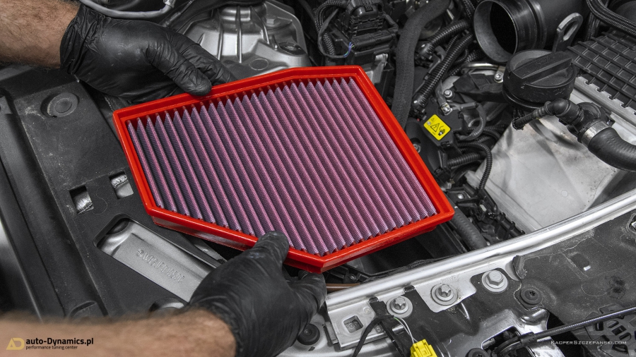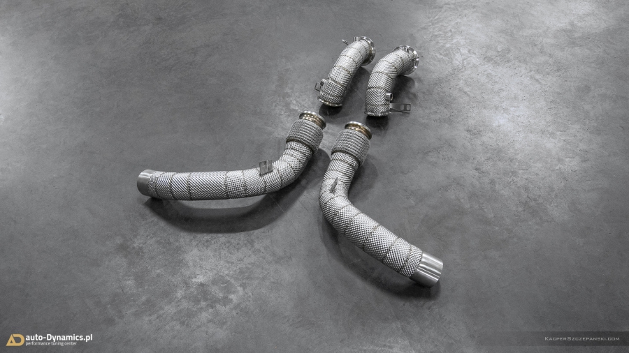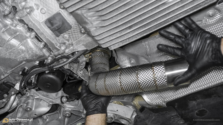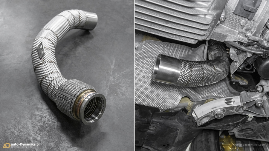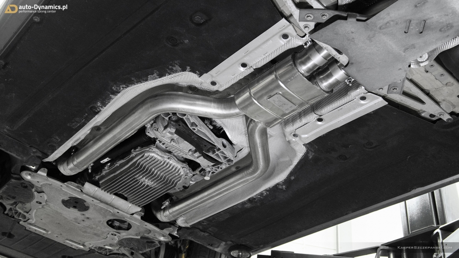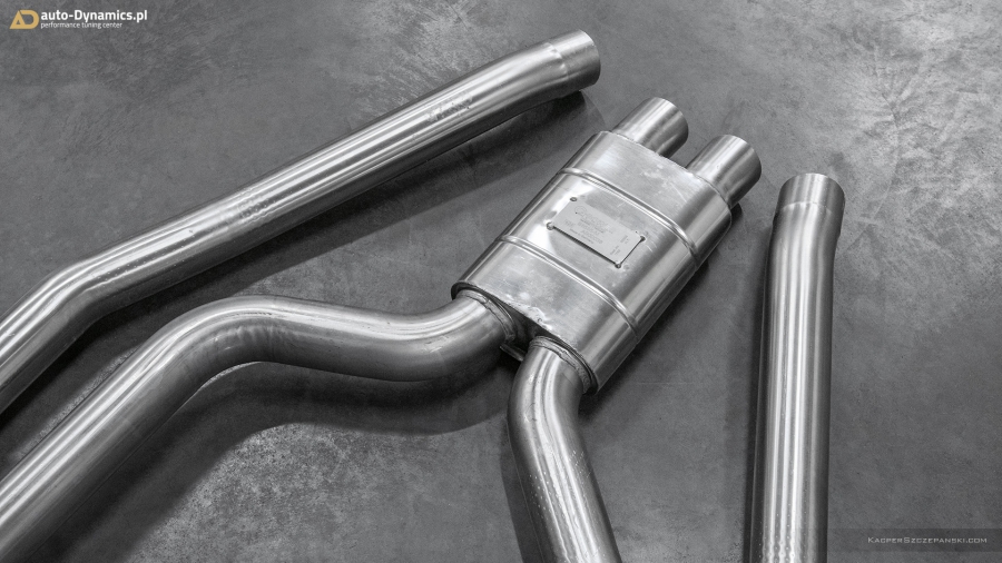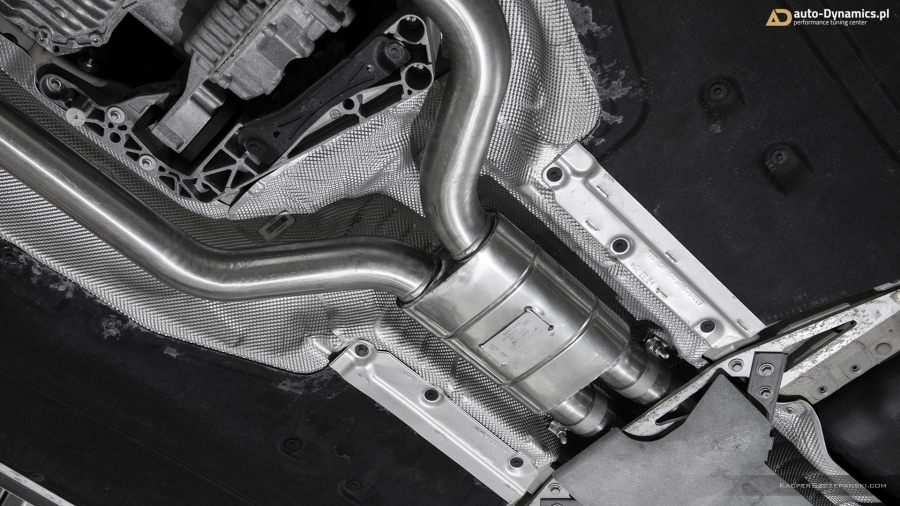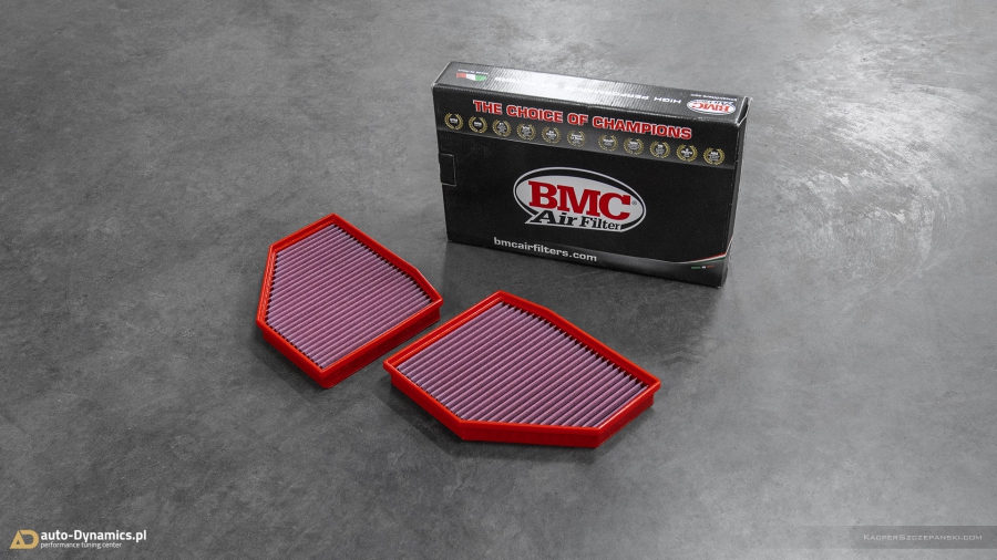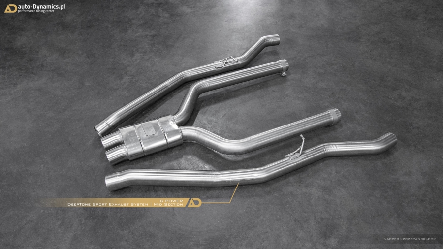 Przenosząc precyzyjne założenia koncepcyjne w świat rzeczywistości, trawestację ///M5 rozpoczęliśmy od eliminacji restrykcyjnych, ograniczających przepustowość spalin a także mocno kastrujących dźwięk silnika S63B44T4 [4395cm³] katalizatorów. Klasycznie dla #AD sięgnęliśmy po high-end’owe solucje. Maksymalizację drożności gazów wydechowych osiągnęliśmy za pomocą wysoko-przepustowych, w pełni przelotowych, dwu-częściowych rur DP’s [Downpipes] od renomowanego, światowej klasy lider w dziedzinie modyfikacji pojazdów marki BMW – niemieckiej firmy G-Power. Rury DP’s charakteryzują się perfekcyjną jakością wykonania co finalnie przekłada się w bezproblemowe spasowanie i montaż. Dodatkowo rury Down-pipe’s zostały pokryte na etapie produkcji osłoną termiczną. Termoizolacja skutecznie zapobiega przedostawaniu się ciepła do komory silnika finalnie czyniąc ów jednostkę bardziej efektywną. Downpipe’y G-Power odpowiadają ponadto za jeszcze jeden istotny aspekt – mianowicie intensyfikację dźwięków i tonów generowanych przez dualistycznie doładowaną jednostkę napędową w układzie V-Osiem. Pozostając przy układzie wydechowym a jednocześnie uwzględniając szerokość modyfikacyjnych planów, seryjna, wyposażona w filtry OPF / GPF sekcja centra układu wydechowego ustąpiła miejsca wysoko przepustowemu zamiennikowi który to całkowicie wyeliminował ww., podyktowane ekologią filtry a jednocześnie, dzięki zaimplementowanemu, przelotowemu tłumikowi centralnemu, zneutralizował efekt tzw. „dron’a” tj. potencjalnego „buczenia” w przedziale pasażerskim. Sekcja centralna wywodzi się z tożsamej co rury DP’s manufaktury – bezkonkurencyjnej, niemieckiej firmy G-Power. Trzymając się konsekwentnie planu, arcy-niewydajny tłumik końcowy pożegnał się z swoim miejscem na rzecz ultra-wydajnego odpowiednika z palety produktów firmy G-Power. Zainstalowany przez #teamAD tłumik uzupełnia w całości sportowy układ wydechowy zapewniając dodatkowo wyższą przepustowość spalin paralelnie z zachowaniem pełnej e-funkcjonalności bowiem tłumik sportowy wyposażony jest w system przepustnic odpowiadających za głośność i natężenie dźwięku. Zaworami zawiaduje on-board’owy komputer [ECU] BMW. Tryby Eco / Comfort [klapy zamknięte] umożliwiają komfortowe podróżowanie nawet podczas najdłuższych eskapad autostradowych a tryby Sport / Sport+ [klapy otwarte (tudzież zdefiniowane M1 / M2)] nie pozostawiają złudzeń i wynoszą eskalację V-Ósemkowych tonów na nieznany dotąd, motor-sportowy, obłędny wręcz poziom. Efektem wieńczącym całość modernizacji przez zespół #AD w układzie wydechowym stanowią asymetryczne rozmiarowo końcówki. Wewnętrzne – zlokalizowane bliżej siebie legitymują się średnicą 2 x Ø 100mm natomiast zewnętrzne to certyfikowane 2 x Ø 90mm. Asymetria ta idealnie wpisuje się w agresywną linię tylnej części pojazdu paralelnie z perfekcyjnym wypełnieniem otworów w tylnym dyfuzorze. Dodatkowo ów rozwiązanie nadaje arcy indywidualnego, niepowtarzalnego stylu w niefrontalnej sekcji ///M5 wynosząc odbiór bryły pojazdu na niesztampowy, ciekawy i niebinarny poziom. Wartym zauważania pozostaje fakt, iż asymetryczne końcówki wykonane zostały w pełni z odpornego termicznie, matowego włókna węglowego a na każdej z nich wygrawerowane zostało logo producenta tj. G-Power. Wszystkie komponenty i składowe kompletnego układu wydechowego zostały wykonane z nierdzewnej stali kwaso-odpornej co w konsekwencji, prócz niesamowicie długiej żywotności zapewnia dodatkowo znaczną redukcję masy. Dodatkowo, pozostając w tematach wydajności w Oberklasse ///M5, skrajnie niewydolne filtry papierowe zastąpiliśmy ich performance’owym zamiennikiem od renomowanego, włoskiego producenta – firmy BMC. Panelowe filtry powietrza BMC wykonane są z wysoko przepustowej bawełny dodatkowo zbrojonej nitkami stali. Zapewniają efektywniejszy dostęp zimnego powietrza do komory spalania przy jednoczesnej, lepszej filtracji wszelkich zabrudzeń. Są filtrami wieczystym i nie wymagają wymiany a jedynie okresowej konserwacji. #AD_Hardware_S2_F90
