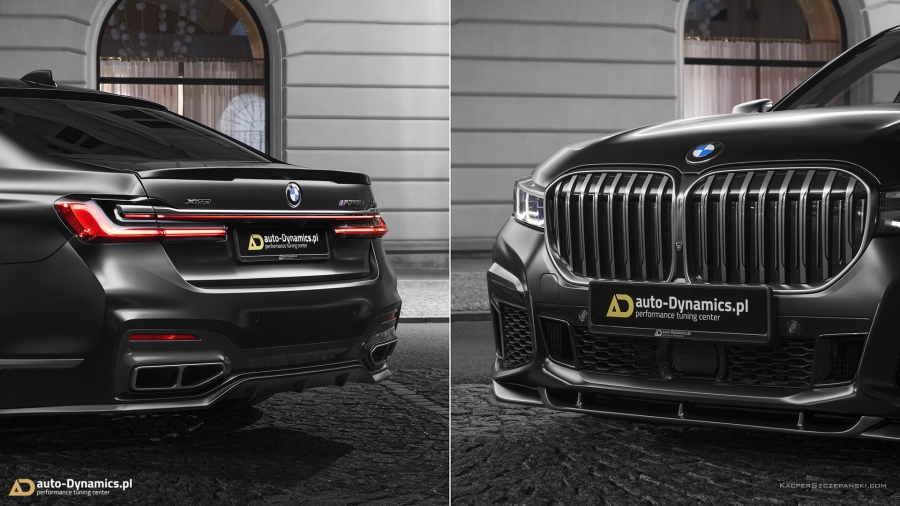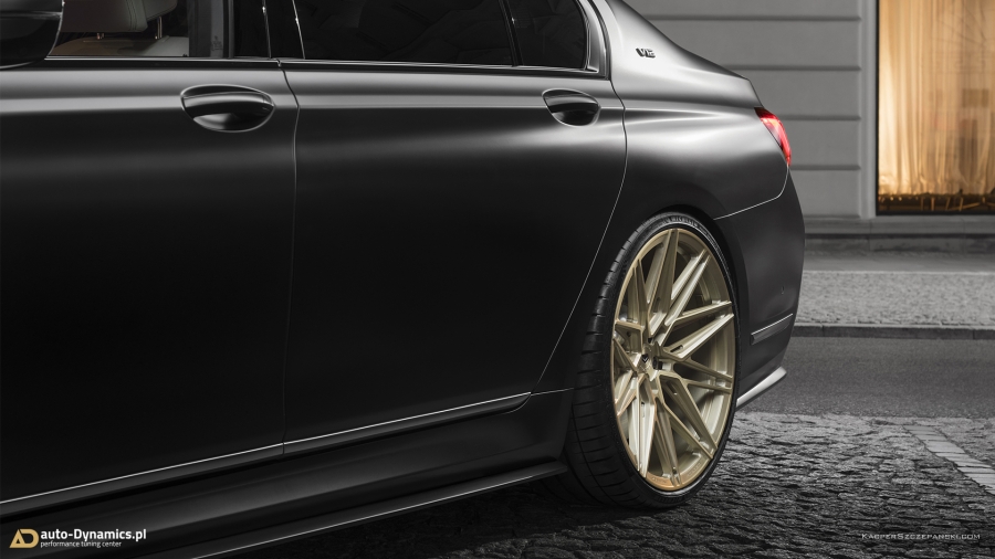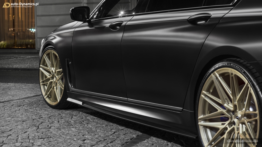 Krystalizując precyzyjne założenia koncepcyjne całego projektu, metamorfozę „Sieben” rozpoczęliśmy od montażu reprezentacyjnego, kompletnego pakietu stylistycznego pochodzącego od naszego zaufanego, wielokrotnie sprawdzonego, renomowanego partnera – rosyjskiej manufaktury Ronin Design. Dystynktywny „Aero Body Kit” pochodzący z dedykowanej i zarezerwowanej wyłącznie dla pojazdów z stajni Bayerische Motoren Werke, charakterystycznej linii Paradig///M. Kompletacja sportowo-zorientowanego, fenomenalnie-stylistycznie współgrającego z fabryczną bryłą M760Li xDrive zestawu to spoiler zderzaka przedniego skutecznie eliminujący efekt zadartego do przodu, mało estetycznego „kadłuba łódki” tak powszechnie serwowanego wszechobecnie przez BMW. Z front-lip’em korespondują wizualnie, agresywnie wyprofilowane listwy podprogowe które finezyjnie i koherentnie, współgrają z linią dyfuzora zderzaka tylnego który to, podkreśla estetykę końcówek V-dwunastkowego, układu wydechowego, jednocześnie swym kształtem okalając dolną sekcję zderzaka tylnego. W paralelnym, jednolitym stylu zainstalowaliśmy ponadto spoiler pokrywy / maski bagażnika oraz uzupełniający monolitycznie cały projekt, spoiler dachowy. Każdy z elementów pakietu stylistycznego Paradig///M wylakierowany został przez #AD w tożsamym do koloru karoserii G12 lakierze tj. niełatwym do perfekcyjnego osiągnięcia, fantastycznym dla oka odcieniu - Frozen Black.