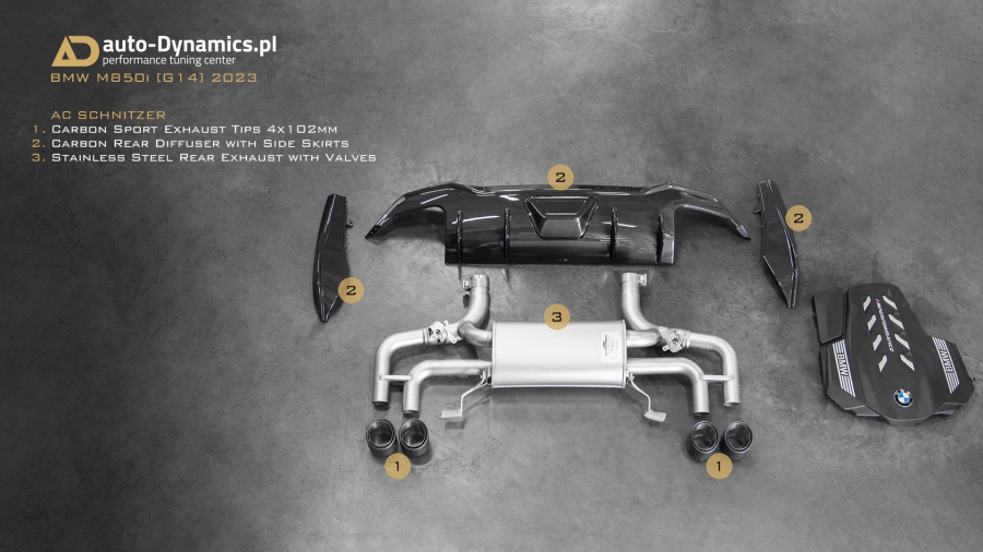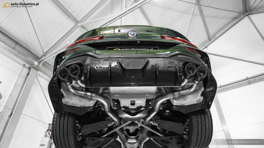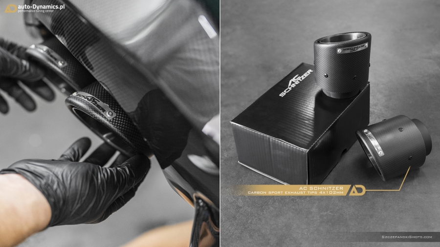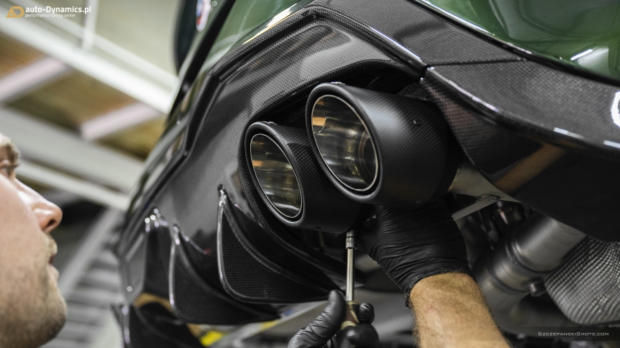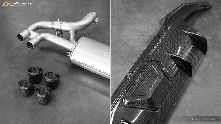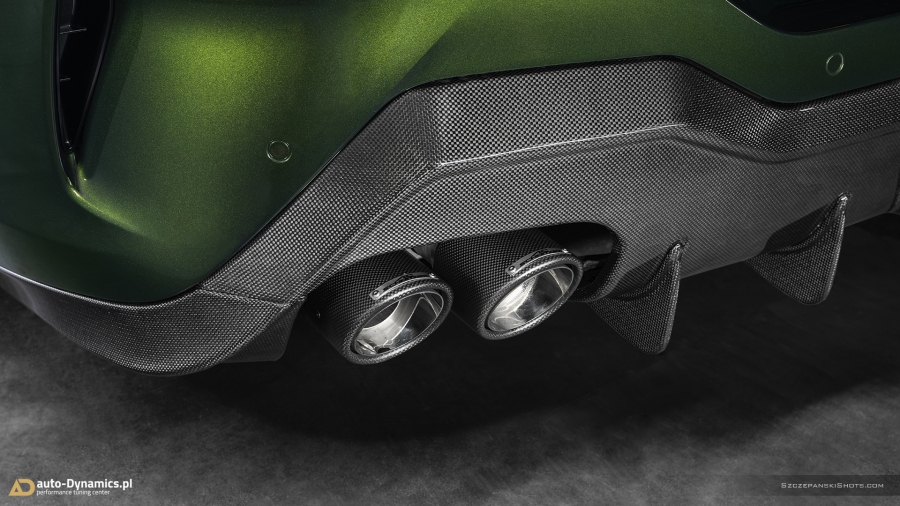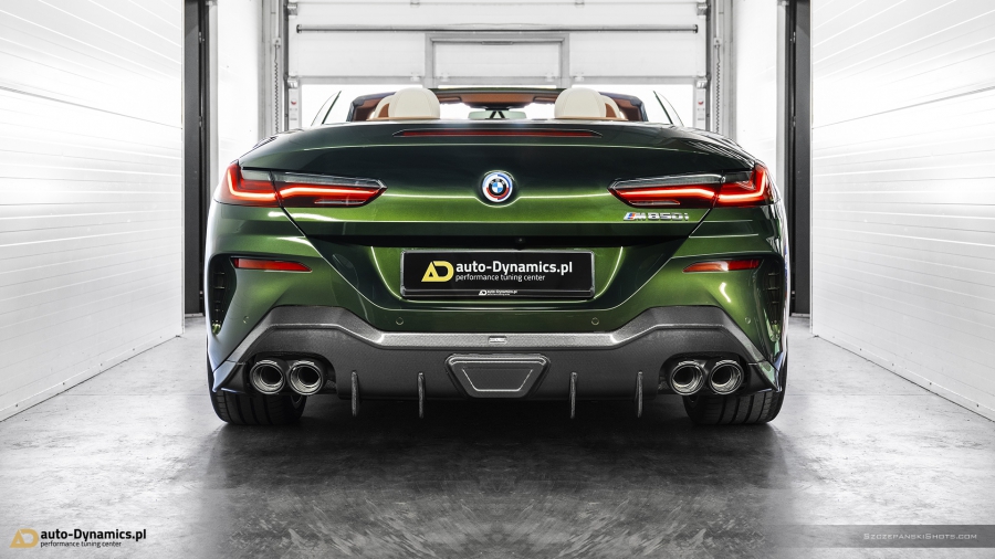 Sportowo zorientowane Cabrio z stajni Bayerische Motoren Werke w absolutnie spersonalizowanej konfiguracji zarówno zewnątrz [lakier San Remo Green Metallic] jak i wewnątrz [tapicerka Merino Elfenbeinweiß Tartufo] trafiło do #AD celem eliminacji trapezoidalnych końcówek układu wydechowego przez które to widoczne są mało estetyczne rury kończące fabryczny tłumik - paralelnie z podkreśleniem akustyki dualistycznie turbo-doładowanej V-ósemki. Radykalna poprawa barwy dźwięków i tonów emitowanych przez pojazdy uposażone fabrycznie w filtry OPF / GPF nie jest zadaniem trywialnym i błahym. Szczególnie w przypadku konieczności pozostawienia ów ekologicznych filtrów w nienaruszonej formie, choćby z tytułu szeregu aspektów gwarancyjnych tudzież homologacyjnych, jednakże w auto-Dynamics.pl każdorazowo odnajdujemy skrojone do potrzeb i oczekiwań Klienta, autorskie rozwiązania. Eskalację całkowicie wykastrowanej akustyki emitowanej przez 4,4-litrową jednostkę napędową kodyfikowaną przez producenta jako N63B44 przez wcześniej wspomniane filtry OPF / GPF rozpoczęliśmy od zastąpienia szalenie restrykcyjnego, niewydolnego, seryjnego układu wydechowego – jego sportowym zamiennikiem pochodzącym od ekskluzywnego, renomowanego producenta specjalizującego się w modyfikacjach i tuningu pojazdów marki BMW – niemieckiej firmy AC Schnitzer. Uwzględniając wytyczne naszego Klienta, sięgnęliśmy po w pełni homologowany [TUV / EC] zestaw składający się z ultra wydajnego, wysoko przepustowego tłumika końcowego z zaimplementowanym wewnętrznie systemem zaworów / przepustnic / klap, których to pracą zawiaduję on-board’owy komputer / sterownik BMW [eco / comfort – zawory zamknięte (tryb cichszy) i sport / sport+ - zawory otwarte (tryb głośniejszy)]. Zewnętrzną prezencję sportowego układu wydechowego wieńczą cztery fenomenalnie prezentujące się końcówki wykonane z włókna węglowego [carbon fiber] o potężnej średnicy 4 Ø 102mm z odgórnym logotypem producenta. System wydechowy o przeprojektowanym kształcie i średnicy końcówek wymaga obligatoryjnej wymiany tylnej, fabrycznej blendy. W M850i zainstalowaliśmy, wykonany w całości z niczym niedomieszkowanego włókna węglowego [pre-preg dry-carbon], aerodynamiczny dyfuzor zderzaka tylnego firmy AC Schnitzer którego otwory idealnie mieszczą ww. końcówki w stylistycznie spójnej i koherentnej formie. Zewnętrzna stylistyka zamontowanego dyfuzora, dzięki agresywnemu wzornictwu doskonale podkreśla i uwypukla całość wniesionych przez zespół #AD zmian w ów wysublimowane THE 8. #AD