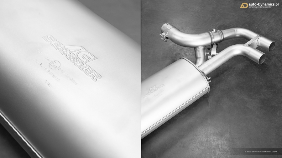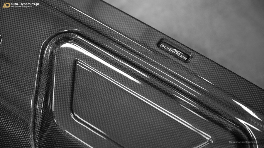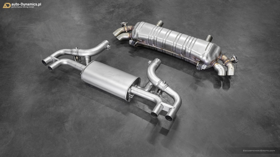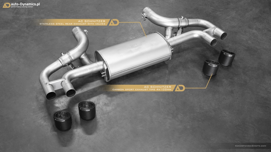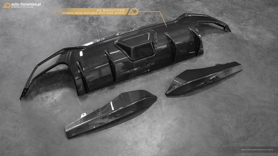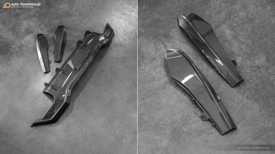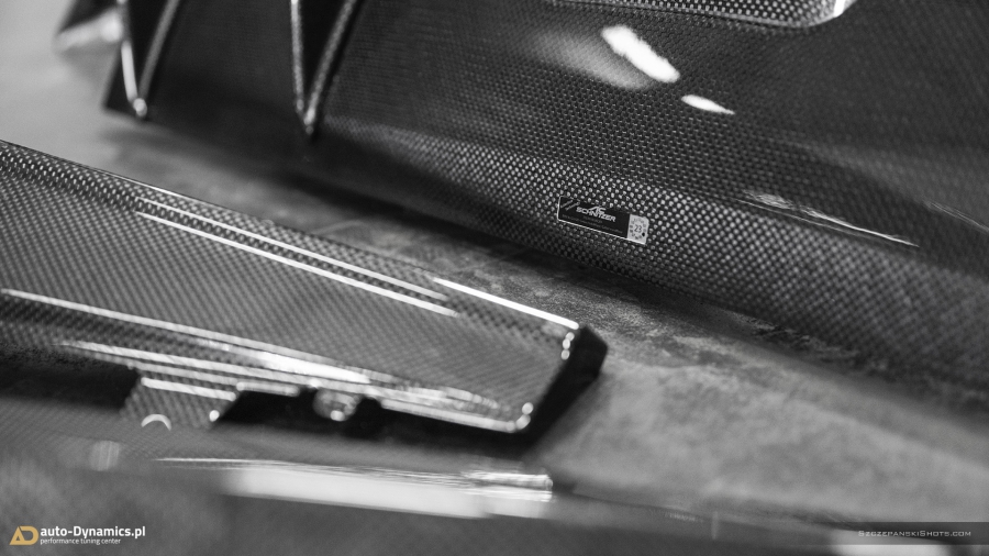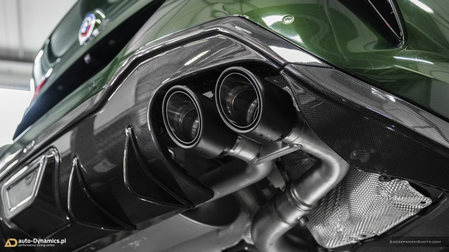 Sportowo zorientowane Cabrio z stajni Bayerische Motoren Werke w absolutnie spersonalizowanej konfiguracji zarówno zewnątrz [lakier San Remo Green Metallic] jak i wewnątrz [tapicerka Merino Elfenbeinweiß Tartufo] trafiło do #AD celem eliminacji trapezoidalnych końcówek układu wydechowego przez które to widoczne są mało estetyczne rury kończące fabryczny tłumik - paralelnie z podkreśleniem akustyki dualistycznie turbo-doładowanej V-ósemki. Radykalna poprawa barwy dźwięków i tonów emitowanych przez pojazdy uposażone fabrycznie w filtry OPF / GPF nie jest zadaniem trywialnym i błahym. Szczególnie w przypadku konieczności pozostawienia ów ekologicznych filtrów w nienaruszonej formie, choćby z tytułu szeregu aspektów gwarancyjnych tudzież homologacyjnych, jednakże w auto-Dynamics.pl każdorazowo odnajdujemy skrojone do potrzeb i oczekiwań Klienta, autorskie rozwiązania. Eskalację całkowicie wykastrowanej akustyki emitowanej przez 4,4-litrową jednostkę napędową kodyfikowaną przez producenta jako N63B44 przez wcześniej wspomniane filtry OPF / GPF rozpoczęliśmy od zastąpienia szalenie restrykcyjnego, niewydolnego, seryjnego układu wydechowego – jego sportowym zamiennikiem pochodzącym od ekskluzywnego, renomowanego producenta specjalizującego się w modyfikacjach i tuningu pojazdów marki BMW – niemieckiej firmy AC Schnitzer. Uwzględniając wytyczne naszego Klienta, sięgnęliśmy po w pełni homologowany [TUV / EC] zestaw składający się z ultra wydajnego, wysoko przepustowego tłumika końcowego z zaimplementowanym wewnętrznie systemem zaworów / przepustnic / klap, których to pracą zawiaduję on-board’owy komputer / sterownik BMW [eco / comfort – zawory zamknięte (tryb cichszy) i sport / sport+ - zawory otwarte (tryb głośniejszy)]. Zewnętrzną prezencję sportowego układu wydechowego wieńczą cztery fenomenalnie prezentujące się końcówki wykonane z włókna węglowego [carbon fiber] o potężnej średnicy 4 Ø 102mm z odgórnym logotypem producenta. System wydechowy o przeprojektowanym kształcie i średnicy końcówek wymaga obligatoryjnej wymiany tylnej, fabrycznej blendy. W M850i zainstalowaliśmy, wykonany w całości z niczym niedomieszkowanego włókna węglowego [pre-preg dry-carbon], aerodynamiczny dyfuzor zderzaka tylnego firmy AC Schnitzer którego otwory idealnie mieszczą ww. końcówki w stylistycznie spójnej i koherentnej formie. Zewnętrzna stylistyka zamontowanego dyfuzora, dzięki agresywnemu wzornictwu doskonale podkreśla i uwypukla całość wniesionych przez zespół #AD zmian w ów wysublimowane THE 8. #AD
