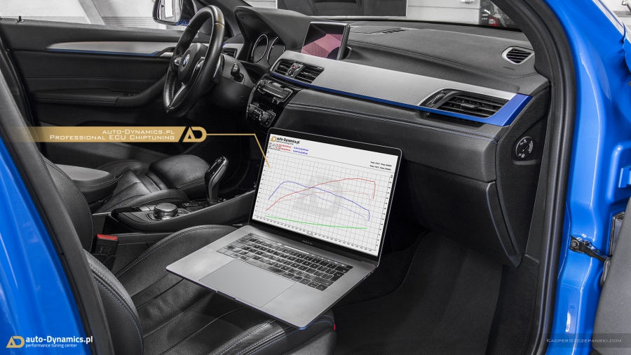 Wdrażając w życie ściśle zdefiniowane przez Klienta wytyczne, które miały na celu zachowawczą i bezpieczną poprawę osiągów 2-litrowej, turbo-doładowanej, rzędowej jednostki napędowej w układzie R4, w X2 przeprowadziliśmy profesjonalny, w pełni indywidualny chiptuning sterownika ECU [Engine Control Unit]. Właściwości nominalne podane przez BMW to: 192KM (141kW) i 280Nm [Wyniki pomiaru seryjnych wartości rzeczywistych to 196KM (144kW) i 295Nm]. Efekty naszego, wypełnionego asekuracją, zabiegu zmierzone na hamowni to 252KM (185kW) i 354Nm [Przyrost: +60KM (+44kW) i +74Nm w stosunku do wartości katalogowych a +56KM (+41kW) i +59Nm w stosunku do wartości rzeczywistych]. Ponadto w oprogramowaniu X2 usunęliśmy całkowicie limiter prędkości V-Max oraz przeprowadziliśmy kalibrację sportowych wskaźników wyświetlacza centralnego które obecnie, w czytelny sposób, prezentują adekwatną do bieżącej mocy skalę. Dodatkowo w turbodoładowanej jednostce B48A20M1 zamontowany został sportowy, wysokoprzepustowy, wieczysty filtr powietrza od renomowanego, włoskiego producenta - firmy BMC, który to wyeliminował skrajnie niewydolny, papierowy filtr seryjne aplikowany na linii pierwszego montażu przez BMW AG. Krzywe przebiegu zarówno mocy jak i momentu obrotowego wymodelowane zostały tak, by moc oddawana była jak najbardziej linearnie. Stabilny i ultra-bezpieczny spec winien idealnie zaakcentować i podkreślić właściwości czteronapędowego Crossover’a podczas codziennych, miejskich zmagań a także tych krótszych jak i dłuższych podróży, wszak różnica przyspieszenia zarówno w przedziale 0-100km/h jak i 100-200km/h jest bardzo czytelna. Odczucia z dynamiki jazdy, w fuzji z napędem xDrive zostały perfekcyjnie zaakcentowane, a elastyczność dzięki spotęgowanemu momentowi obrotowemu dostępnemu w szerokim zakresie obrotów satysfakcjonuje na każdym biegu! #SafetyPowerByAD