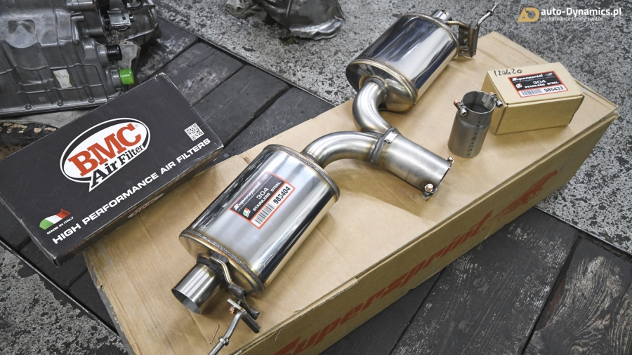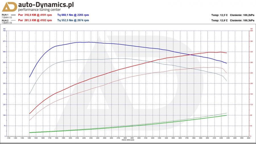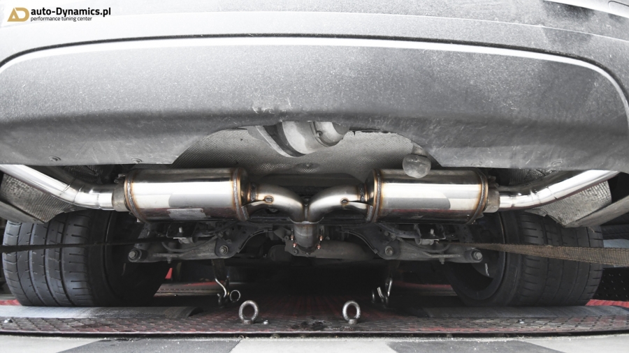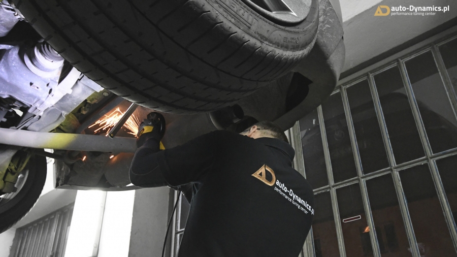 Koncentrując się na założeniach koncepcyjnych całego projektu, który miał na celu poprawę osiągów wysokoprężnej, 3 litrowej jednostki napędowej – w pierwszej kolejności przystąpiliśmy do typowej, wspomagającej modyfikacji typu „wdech + wydech”, poprawiającej przepustowość gazów spalinowych oraz doprowadzającej większą ilość powietrza do silnika. W X5 zainstalowany został wysokoprzeustowy, wieczysty filtr powietrza firmy BMC - eliminujący mało wydajny, papierowy filtr oraz sportowy, maksymalizujący przepustowość spalin, wykonany z nierdzewnej stali kwasoodpornej, tłumik firmy Supersprint. Realizując wizję Właściciela wykonaliśmy custom’ową adaptację fabrycznych, trapezoidalnych końcówek do nowego tłumika - polegającą na wykonaniu odpowiednich łączników [spawanych metodą TIG] a korzystając z okazji wypolerowaliśmy całość na wysoki połysk. Wykorzystując potencjał przeprowadzonych modyfikacji mechanicznych, w BMW wykonany został profesjonalny chiptuning sterownika ECU. Właściwości fabryczne podane przez BMW to: 258KM i 560Nm [Wyniki pomiaru seryjnych wartości to 261KM i 552Nm]. Efekty naszego strojenia zmierzone na hamowni to 318KM i 668Nm [Przyrost ~ +60KM i +110Nm]. Wzrost parametrów na tym poziomie zapewnia absolutną bezawaryjność jednostki napędowej w połączeniu z rewelacyjnymi osiągami pozwalającymi na bezpieczne wyprzedzanie w każdych okolicznościach i warunkach drogowych. Odczucia z jazdy w połączeniu z napędem na obie osie są teraz naprawdę niesamowite, a elastyczność zdumiewa na każdym biegu! „Iks Pięć” po modyfikacjach w auto-Dynamics.pl wydajnością nie odstaję od wersji xDrive40d [F15].