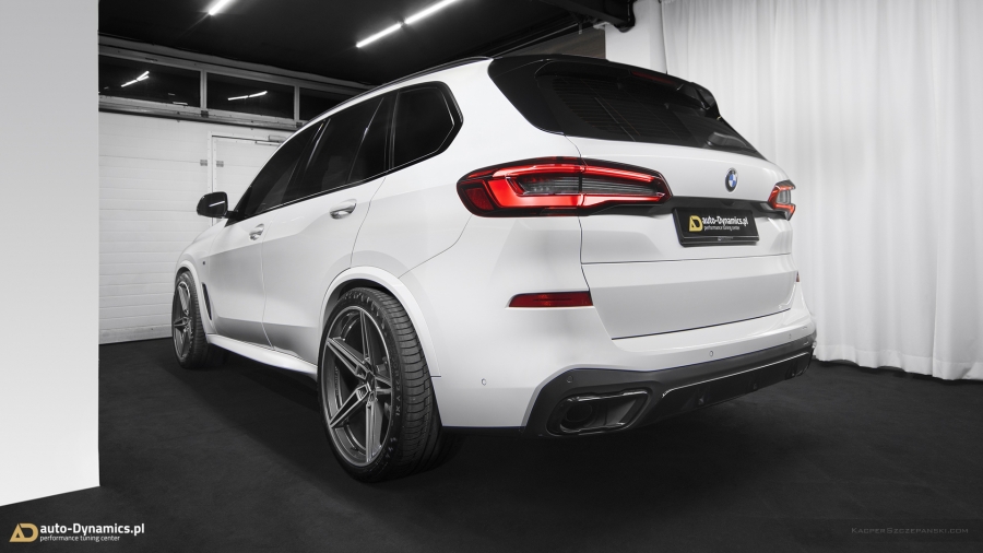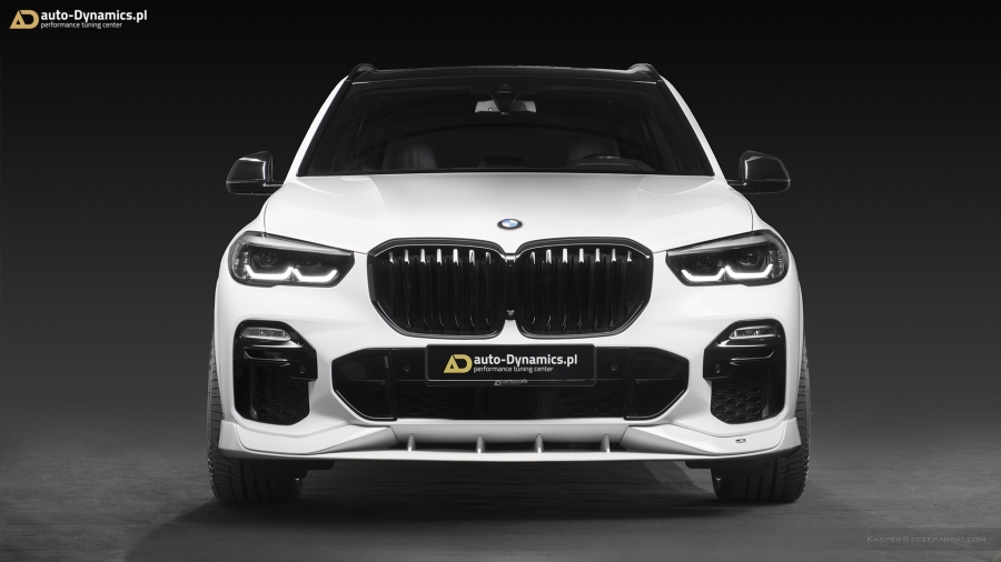 Sekundarny etap metamorfozy X5 stanowi dopełnienie przedniego zderzaka poprzez aerodynamiczny, koherentny stylistycznie, współgrający fuzyjnie z linią pojazdu, spoiler frontowego zderzaka, pochodzący oczywiście z palety akcesoryjnych produktów od renomowanego, niemieckiego tunera – firmy AC Schnitzer. Front lip, przed montażem został profesjonalnie wylakierowany zgodnie z kolorem VIN pojazdu w kolorze „Alpine White”. Element skutecznie eliminuje efekt zadartego do przodu, mało estetycznego „kadłuba łódki” tak powszechnie serwowanego wszechobecnie przez BMW. Niezaprzeczalne stanowi również fakt, iż mimo instalacji front-splittera, auto zachowuje absolutny komfort podczas codziennej eksploatacji. Spójnie z zestawem felg, G05 nabrało niebywałego wręcz, agresywnego a zarazem sportowego charakteru.
