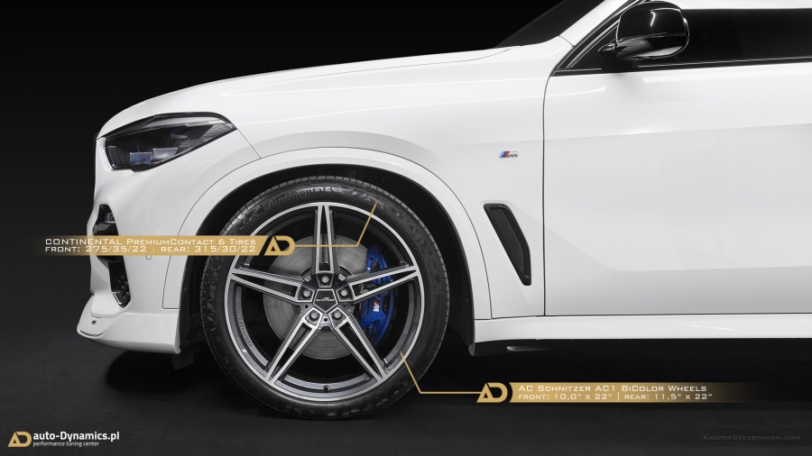 Transformację ów wyjątkowego egzemplarza X5 rozpoczęliśmy od elementarnej i fundamentalnej modyfikacji kryjącej się pod postacią montażu klasycznych, dystynktywnych stylistycznie a zarazem arcy-sportowych, aluminiowych felg w adekwatnym do bryły pojazdu, 22-calowym rozmiarze. Nie przebierając w środkach, sięgnęliśmy po rozwiązania od naszego wieloletniego partnera, niemieckiej firmy AC Schnitzer. Kompletacja zainstalowanego przez nas zestawu felg, to pakiet obręczy wywodzący się z linii AC1 wykończonych w lakierowaniu „BiColor” [FA: 10.0” | RA: 11,5”] cechujących się ekstremalną wklęsłością „deep concave”, naturalnie wraz z adekwatnym zestawem montażowym, który to idealnie wpisał osadzenie [ET] felg w linię szerokich błotników, a perfekcyjnie zwymiarowanie umożliwiło zachowanie nominalnego obwodu tocznego kół [homologacja BMW]. Felgi wyposażone zostały w zestaw sportowych opon klasy high-performance – niemieckiej firmy Continental. Nie mający sobie równych, absolutnie topowy model - PremiumContact6 [275/35/22 przód oraz 315/30/22 tył (zestaw opon z homologacją BMW tj. *)] oraz w pakiet nowych, OEM’owych [BMW] czujników kontroli ciśnienia w oponach [TPMS / RDCI], które własnym sumptem, metodą proszkową wylakierowaliśmy w kolorze obręczy AC Schnitzer celem uniknięcia nieestetycznego kontrastu.