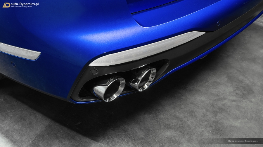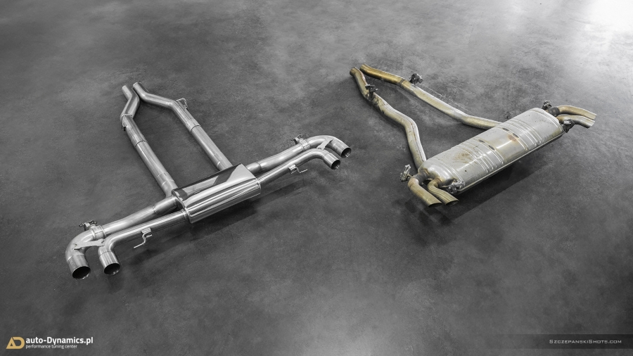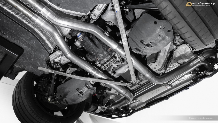 Modyfikacyjną metamorfozę monachijskiej X7 której genotyp pierwotnie zaaranżowała dywizja ///M-Performance, rozpoczęliśmy od dynamicznej eskalacji i znacznego podbicia właściwości akustycznych generowanych przez widlastą jednostkę napędową w układzie V8. Radykalna korekta barwy dźwięków i tonów generowanych przez pojazdy uposażone fabrycznie w ekologiczne filtry OPF / GPF nie jest zadaniem trywialnym i prostym. Szczególnie w przypadku konieczności pozostawienia ów ekologicznych filtrów w nienaruszonej formie, choćby z tytułu szeregu aspektów gwarancyjnych tudzież homologacyjnych. Przemianowanie całkowicie wykastrowanej z akustyki przez uprzednio wspomniane filtry, jednostki kodyfikowanej przez BMW jako S68 rozpoczęliśmy od zastąpienia szalenie restrykcyjnego, seryjnego układu wydechowego – jego sportowym zamiennikiem pochodzącym z linii produktów Competition Line – model High-Performance Stage#3 wprost od renomowanego, ekskluzywnego producenta specjalizującego się od dziesięcioleci w tuningu i modyfikacjach pojazdów marki BMW – szwajcarskiej firmy dÄHLer. Zainstalowany w X7 przez zespół #AD układ wydechowy stanowi kompletacja zawierająca wysoko przepustowy, sportowy tłumik końcowy z zaimplementowanym systemem zaworów / przepustnic / klap, cztery fenomenalnie prezentujące się końcówki wykończone w kolorze srebrnym które to jednocześnie, dzięki swoim pokaźnym rozmiarom [4 x 101mm] idealnie wypełniły otwory w tylnym dyfuzorze. Tłumik końcowy dopełnia zestaw rur łączących do sekcji centralnej. Immanentny skład zestawu HP Stage#3 stanowi również zestaw wysoko przepustowych, sportowych rur DP’s [downpipe’s] które to zastępują restrykcyjne, drugie katalizatory. Drugie katalizatory instalowane w silnikach S68 nie są monitorowane przez ECU dlatego ich eliminacja nie wymaga żadnych zmian w elektronice oraz oprogramowaniu pojazdu a co za tym idzie jest to idealne rozwiązanie dla osób chcących wydobyć więcej dźwięku z silnika V8 przy zachowaniu gwarancji producenta pojazdu. Zwieńczenie hardware’owe systemu HP Stage#3 od dÄHLer to sterownik systemu zaworów / przepustnic / klap układu wydechowego. W najnowszych modelach BMW fabryczny sterownik otwiera przepustnice na maksymalnie 75% uchylenia [nawet w modelach M], ponadto klapy cały czas pracują [otwierają się i zamykają nawet w trybach sportowych]. Sterownik dÄHLer umożliwia ich pełne otwarcie nawet w trybach nie sportowych. A trybie automatycznym przywraca sterowanie klapami fabrycznemu, on-board’owemu sterownikowi BMW. Kontroler posiada również wbudowaną pamięć więc nie trzeba każdorazowo klikać oczekiwanego trybu na pilocie. Pracujące w trybie zamkniętym zawory pozwalają w arcy-komfortowych warunkach pokonywać autostradowe odległości a tryb otwartych zaworów stanowi salwę nasyconych agresywną barwą, motoryzacyjnych dźwięków i tonów. Wartym podkreślenia pozostaje stylistyczny fakt przeprowadzonej modyfikacji, który to nie pozwala przejść obok pojazdu obojętnie dzięki poczwórnym końcówkom systemu wydechowego nadającym szalenie indywidualnej, charakterystycznej, dynamicznie zorientowanej fizjonomii w tylnej ekspozyturze pojazdu. #V8SoundByAD
