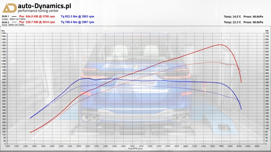 Wykorzystując potencjał wniesiony przez ww. modyfikacje mechaniczne zmian, przystąpiliśmy do transformacji kolejnych kryteriów. Zakładając poprawę elastyki i eskalację osiągów 4.4-litrowej, dualistycznie-turbodoładowanej, widlastej jednostki napędowej sygnowanej przez BMW jako S68, jednocześnie respektując i uwzględniając obowiązującą gwarancję producencką, celem dynamicznej intensyfikacji właściwości tabelarycznych generowanych przez ośmio-cylindrowy silnik, w X7 M60i [generacji G07] zainstalowany został profesjonalny, w pełni cyfrowy, dedykowany, zewnętrzny komputer ECU [Engine Control Unit] wraz z specjalną, rozbudowaną wiązką elektroniczną komunikującą się z sensorami magistrali CAN. Modyfikacja ta jest nieinwazyjna, nie wymaga zmian w fabrycznym oprogramowaniu i jest w pełni odwracalna gdy sytuacja tego wymaga [moduł wraz z wiązką można zdemontować bez pozostawienia żadnych śladów (mechanicznych i elektronicznych)]. Zainstalowany przez #teamAD kontroler wywodzi się z serii Competition Line od renomowanego, szwajcarskiego producenta i tunera pojazdów BMW - firmy dÄHLer [dÄHLer Design & Technik GmbH]. Zaawansowany, zewnętrzny sterownik ECU zapewnia osiągi i bezpieczeństwo silnika identyczne do typowego chiptuningu przez OBD. Moduł korzysta z map z dynamiczną adaptacją - monitoruje wiele wartości w czasie rzeczywistym i elastycznie dobiera wskazania, sięgają po drzemiący w jednostce potencjał i przekuwa go w potężny przyrost mocy i momentu obrotowego jak również znacznie zwiększa elastyczność dostępną w pełnym zakresie obrotów. Właściwości nominalne / katalogowe przedstawione przez BMW to: 530KM (390kW) i 750Nm [Wyniki pomiaru wartości rzeczywistych to 529KM i 768Nm]. Efekty naszego zabiegu zmierzone na hamowni [na paliwie RON98] to 644KM (473kW) i 852Nm [Przyrost: +114KM (+83kW) i +102Nm w stosunku do wartości katalogowych a +115KM (+84kW) i +84Nm w stosunku do wartości rzeczywistych po modyfikacjach mechanicznych]. Wzrost parametrów na tym poziomie zapewnia absolutną bezawaryjność jednostki napędowej w połączeniu z rewelacyjnymi osiągami pozwalającymi na bezpieczne oraz dynamiczne wyprzedzanie w każdych okolicznościach i warunkach drogowych. Różnica przyspieszenia zarówno w przedziale 0-100km/h jak i 100-200km/h oraz 200km/h-UP jest absolutnie kolosalna. Odczucia z jazdy, są teraz naprawdę niesamowite, a elastyczność dzięki momentowi obrotowemu dostępnemu w szerokim i pełnym zakresie obrotów, w połączeniu z napędem xDrive zdumiewa na każdym biegu! #PerformanceWarrantyByAD