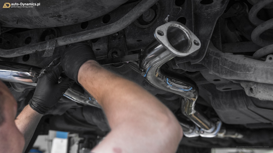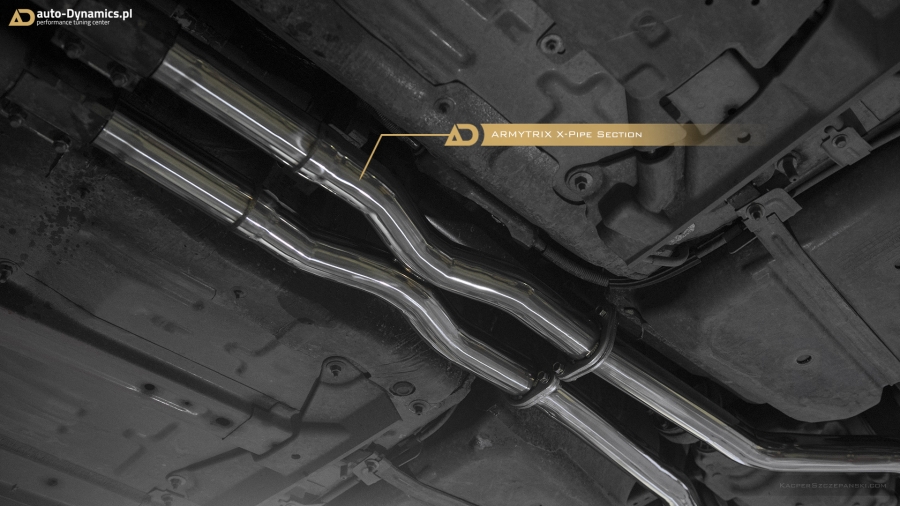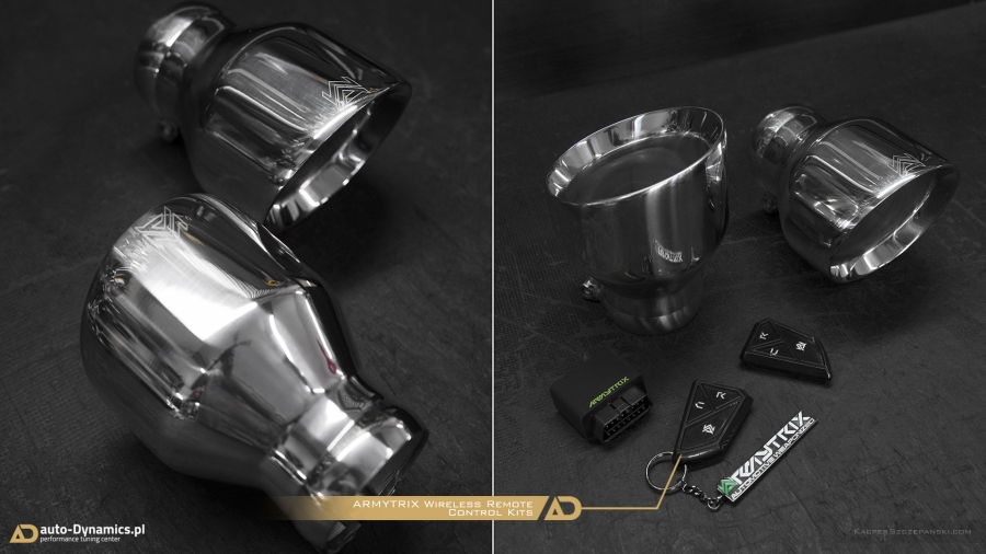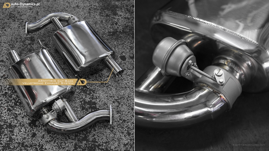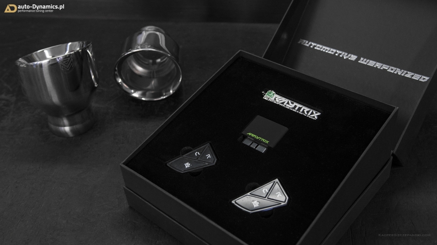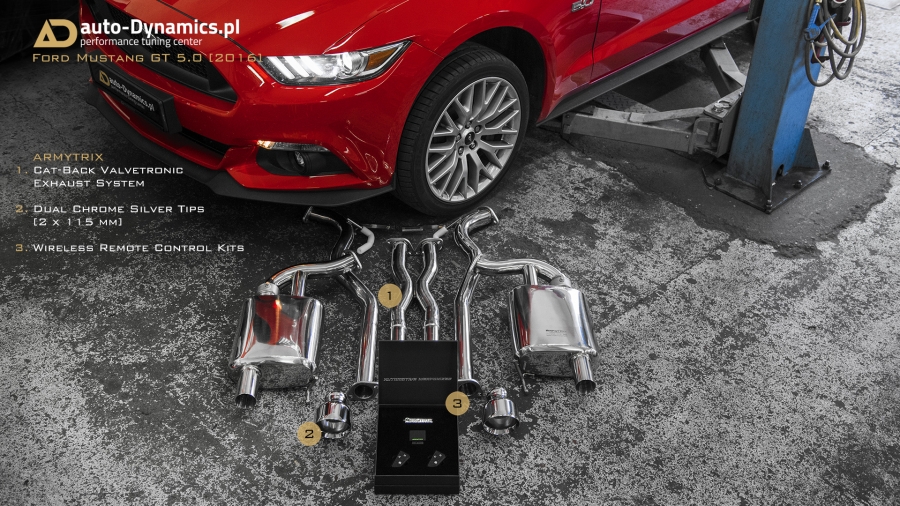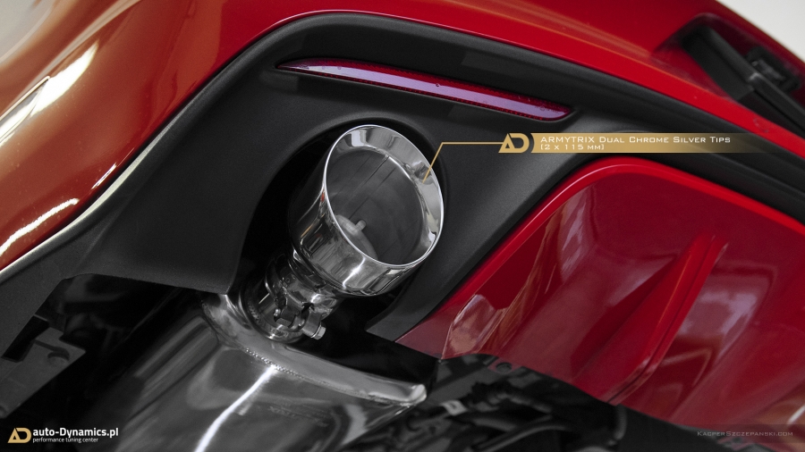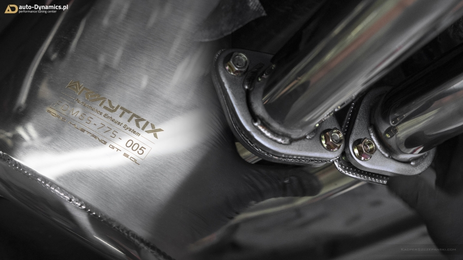 Krystalizując zdefiniowane odgórnie założenia koncepcyjne całego projektu, w Mustang’u, fabryczny, całkowicie bezbarwny dźwiękowo, niewydolny układ wydechowy odszedł w zapomnienie dzięki kompletnemu systemowi zaprojektowanemu i wykonanemu przez firmę Armytrix. OEM’owy, seryjny układ wydechowy zastąpiliśmy jego aftermaket’ową, performance’ową odmianą eskalującą fonię V8 do granic wręcz abstrakcyjnych, jednocześnie zapewniając pełną, akustyczną dozowalność. Kompletacja sportowego układu wydechowego składa się z pary tylnych tłumików końcowych z zaimplementowanym systemem podciśnieniowych zaworów / przepustnic odpowiadających za głośności pracy systemu, wysoko przepustowej sekcji centralnej niwelującej niepotrzebne zawirowania i restrykcje a jednocześnie maksymalizującej przepustowość gazów spalinowych, pary perfekcyjnie komponujących się z tylnym dyfuzorem, chromowanych końcówek o pokaźnej średnicy [4 x Ø 115 mm] oraz kompletnej instalacji podciśnieniowej wraz z jednostką ECU zawiadującą zdalnie, za pomocą dołączonych pilotów lub smartfonowej aplikacji systemem zaworów / przepustnic funkcjonujących w końcowych tłumikach. Job Done. Mustang GT #Weaponized