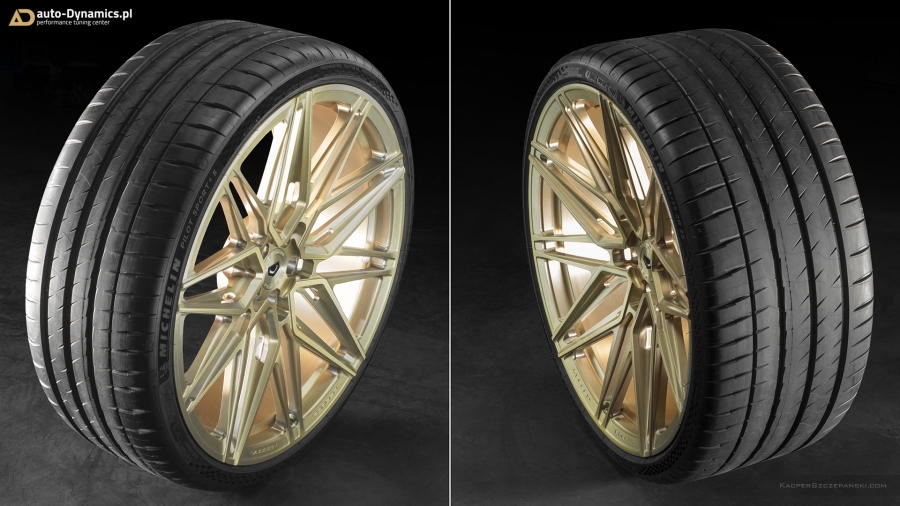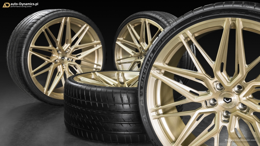 Czyniąc przygotowania do krystalizacji założeń koncepcyjnych nowego projektu #AD bazującego na kanwie majestatycznego, high-performance’owego, V-dwunastkowego luxusliner’a, demonstrujemy zestaw ultra-lekkich oraz ekstremalnie wytrzymałych, kutych felg aluminiowych w indywidualnym wykończeniu kolorystycznym tj. Patina Gold. Model EVO-5R pochodzący z najnowszej, zaprezentowanej na rok ’20 linii modelowej EVO Series firmy Vossen Forged otrzymał ponadto szereg dodatkowych, custom’owych akcentów jak wewnętrzne kieszenie odelżające [Lightening Pockets] tudzież indywidualną kolorystykę zaślepek piast [Color Matched Cap]. Charakterystyczny, modernistyczny, niepowtarzalny a zarazem dynamiczny i luksusowy wzór felg EVO-5R korespondować będzie w sposób koherentny i finezyjny z dystynktywną bryłą limuzyny bawarskiego producenta. Konfiguracja zestawu to 22” x 9” dla osi przedniej oraz 22” x 10,5” dla osi tylnej. Precyzyjnie przeprojektowane, skrupulatnie wyliczone, agresywne odsadzenie ET pozwoli wpisać nowy zestaw kół w nadkola, zrównując tym samym perfekcyjnie ich linię z krawędziami błotników. Felgi wyposażone zostały w zestaw sportowych opon klasy high-performance – francuskiej firmy Michelin. Sprawujący się perfekcyjnie, absolutnie topowy, bezkonkurencyjny model – Pilot Sport 4S [255/30/22 przód oraz 295/25/22 tył] oraz w pakiet nowych, OEM’owych [BMW] czujników kontroli i monitorowania ciśnienia w oponach [TPMS], które własnym sumptem, metodą proszkową wylakierowaliśmy w kolorze obręczy Vossen celem niezaburzonego i estetycznego odbioru, nowych kół. Tożsamą procedurę zastosowaliśmy do odważników które korelują harmonijnie z pozostałymi składowymi pakietu. EVO-5R zabezpieczone zostały flagową powłoką ceramiczno-ochronną MOHS pochodzącą z palety produktów firmy Gyeon. Prawidłowe mocowanie felg do piast zapewni zestaw dedykowanych, odpowiednio zwymiarowanych, pływających śrub marki Vossen, na których to „łbach” wygrawerowana została charakterystyczna dla producenta „V-ka”. #TheDevilIsInTheDetail #QualityAD