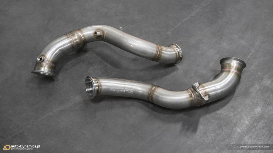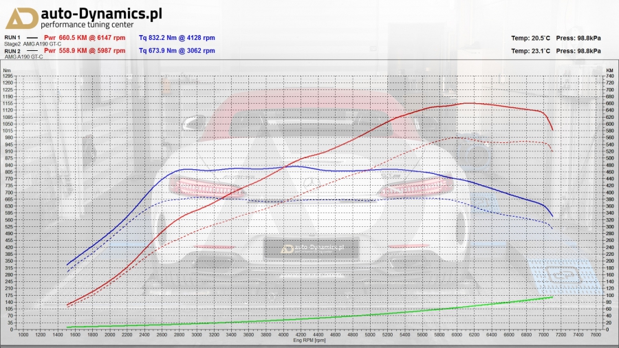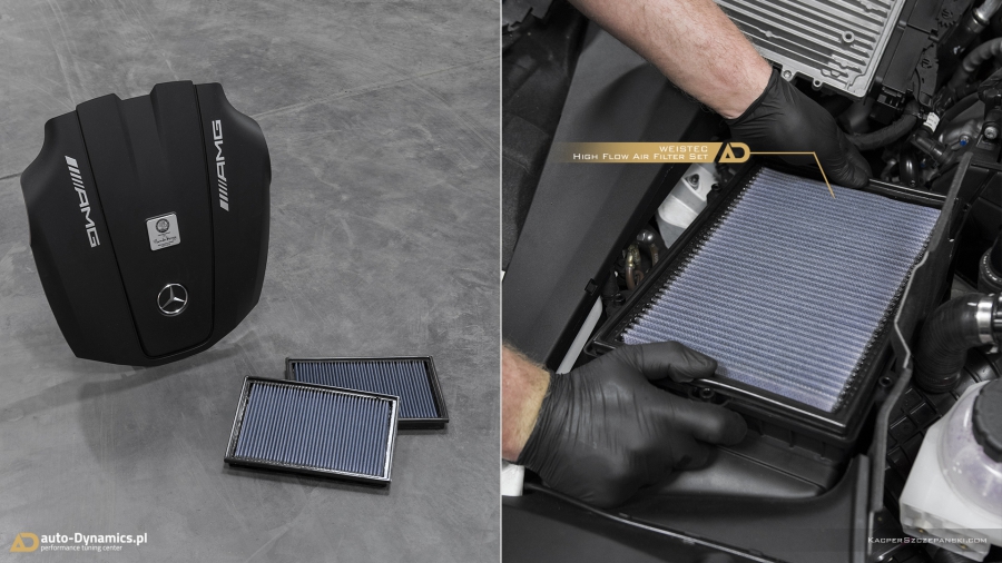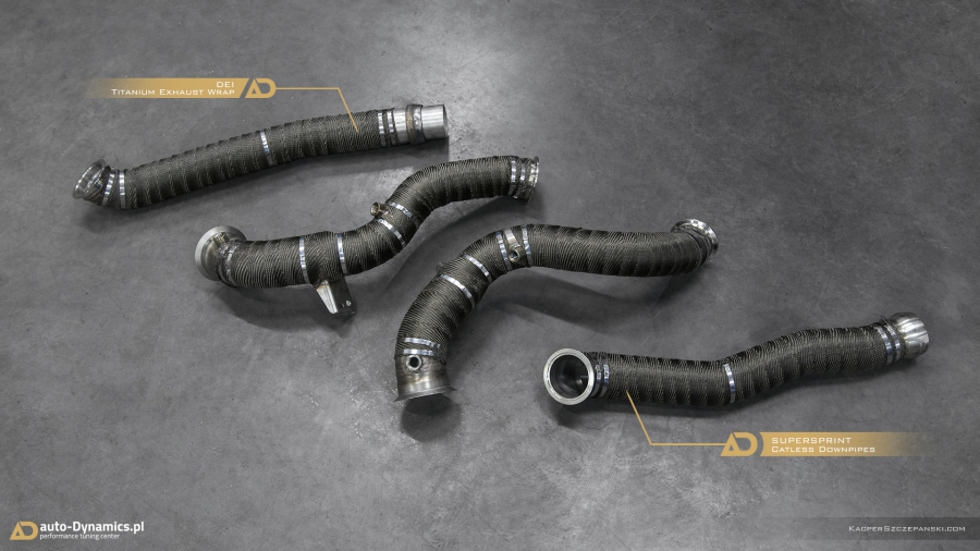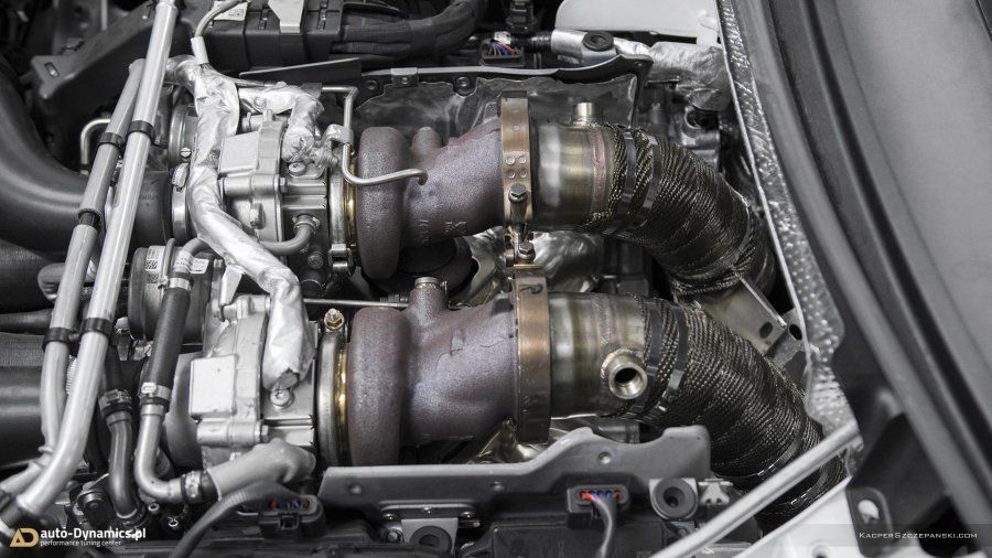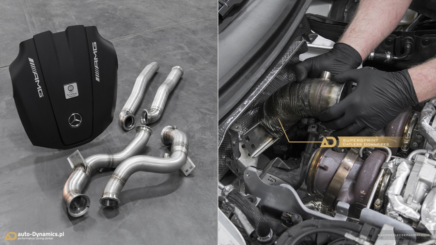 Krystalizację precyzyjnych założeń koncepcyjnych całego projektu rozpoczęliśmy od modyfikacyjnej trawestacji wartości tabelarycznych pojazdu. W pierwszej kolejności, fabryczne, restrykcyjne cztery katalizatory ustąpiły miejsca wysoko przepustowym rurom DP [Downpipe’s] które to radykalnie poprawiły przepustowość gazów spalinowych i znacznie zredukowały ciśnienie zwrotne. Pakiet od naszego wielokrotnie sprawdzonego i zaufanego partnera – firmy Supersprint. Montaż zestawu rur DP naturalnie i zgodnie z modyfikacyjną sztuką przy zastosowaniu nowych [OEM AMG] podzespołów [uszczelki, śruby etc.]. Dodatkowo rury DP's doposażyliśmy własnym sumptem w dodatkową termoizolację firmy DEI. Zestaw przelotowych downpipe’ów prócz wcześniej przytoczonych aspektów zagwarantował rykoszetowo niebywałą wręcz eskalację symfonii dźwięku wydobywającej się z widlastej, czterolitrowej v-ósemki. Kolejno w dualistycznie-turbodoładowanej jednostce zamontowane zostały sportowe, wysokoprzepustowe, wieczyste filtry powietrza od renomowanego producenta - firmy Weistec które to wyeliminowały skrajnie niewydolne, papierowe filtry seryjne aplikowane na linii pierwszego montażu. Szeroko pojęty system doładowania AMG GT C w wersji Cabrio otrzymał jeszcze jedną modyfikację pod postacią adapterów VTA / BOV [Blow Off Valves] do seryjnych zaworów DV, które generują szalenie przyjemny w odbiorze, charakterystyczny dźwięk upuszczanego powietrza – produkt, ponownie - firmy Weistec Engineering. Właściwości nominalne / katalogowe przedstawione przez Mercedes-AMG to: 557KM (410kW) i 680Nm [Wyniki pomiaru seryjnych wartości rzeczywistych to 558KM i 673Nm]. Efekty naszego zabiegu zmierzone na hamowni to 660KM (488kW) i 832Nm [Przyrost: +102KM (+78kW) i +159Nm w stosunku do wartości rzeczywistych]. Ponadto w oprogramowaniu R190 usunęliśmy całkowicie limiter prędkości V-Max a także dodaliśmy kilka innych opcji jak choćby intensyfikacja strzałów z układu wydechowego w trybach Sport / Race. Konkludując, „Mech-AMG” z autorskim pakietem #S2byAD legitymuje się powtarzalnym, sześcio-sekundowym przyspieszeniem w zakresie 100-200km/h [Dragy – LINK]. #Stage2byAD