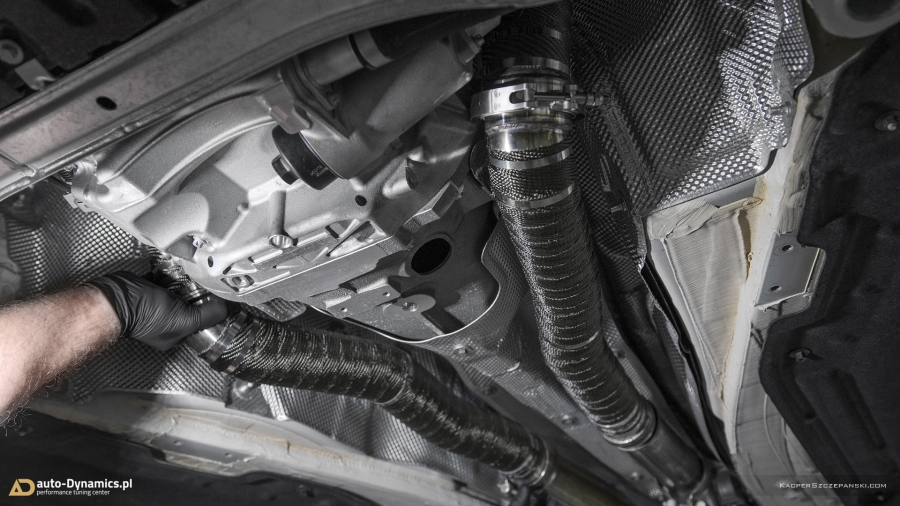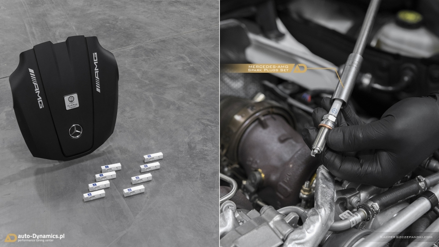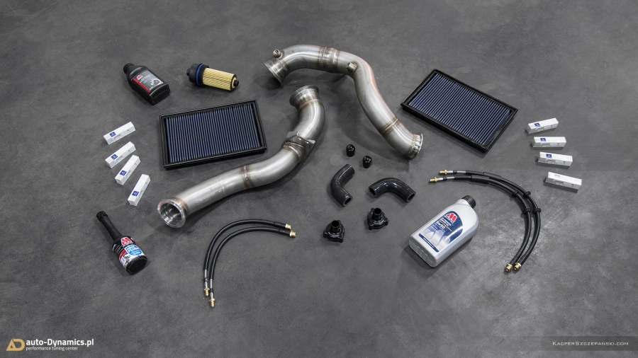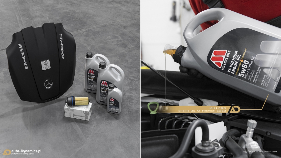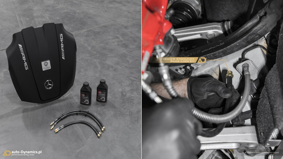 Czyniąc tuning odpowiedzialnym, uwzględniając jednocześnie radykalny przyrost mocy i momentu obrotowego, gumowe, puchnące a z czasem parciejące przewody hamulcowe zastąpiliśmy ich sportową odmianą – przewodami w stalowym oplocie od naszego niemieckiego, zaufanego partnera – firmy Fischer Hydraulik / Stahlflex. Przewody oczywiście z homologacją drogową i certyfikatem TUV. W całym układzie hamulcowym wymieniony został płyn na wyczynowy wariant o ekstremalnie wysokiej temperaturze wrzenia i znakomitej odporności higroskopijnej [Płyn „Performance Brake Fluid” brytyjskiej firmy Millers]. Przy zwiększonej mocy - modyfikacja ta w znaczny sposób przekłada się na poprawę bezpieczeństwa zarówno kierowcy i pasażerów. W AMG GT C, uwzględniając interwały konserwacyjne i wyśrubowane osiągi, przeprowadziliśmy dodatkowo pełen profesjonalny serwis olejowy z wykorzystaniem zaufanych i niezawodnych olei i lubrykantów brytyjskiej firmy Millers, które znacznie przewyższają zadane przez stuttgarcką fabrykę normy. Cztero-litrowa, [V]idlasta jednostka napędowa zapełniona została wysokiej klasy olejem z serii Premium, o specyfikacji 5W50 – w połączeniu z oem’owym filtrem AMG oraz kompletem nowych świec zapłonowych [OEM AMG], po wcześniejszym zastosowaniu płukanki silnikowej Millers [Engine Flush] odpowiednio przygotowującej jednostkę napędową M178DE40AL do współpracy z najwyższej próby olejem. Dopełniając metodykę oraz ścisłość reguł przeglądu, w GT’ku przeprowadziliśmy całkowitą, zaawansowaną diagnostykę komputerową [za pomocą najnowocześniejszego oprogramowania firmy TEXA oraz Bosch] oraz wszelkie wymagane adaptacje i regulacje. Wszystkie wykonane czynności przeglądowo-serwisowe, przy zachowaniu szczegółowych procedur i wytycznych Daimler AG oraz naszych wewnętrznych, wyśrubowanych standardów dla pojazdów przez nas zmodyfikowanych – gwarantują bezawaryjną i bezproblemową eksploatację pojazdu o zwiększonej mocy przez kolejne dziesiątki-tysięcy kilometrów. #StufeZweiByAD