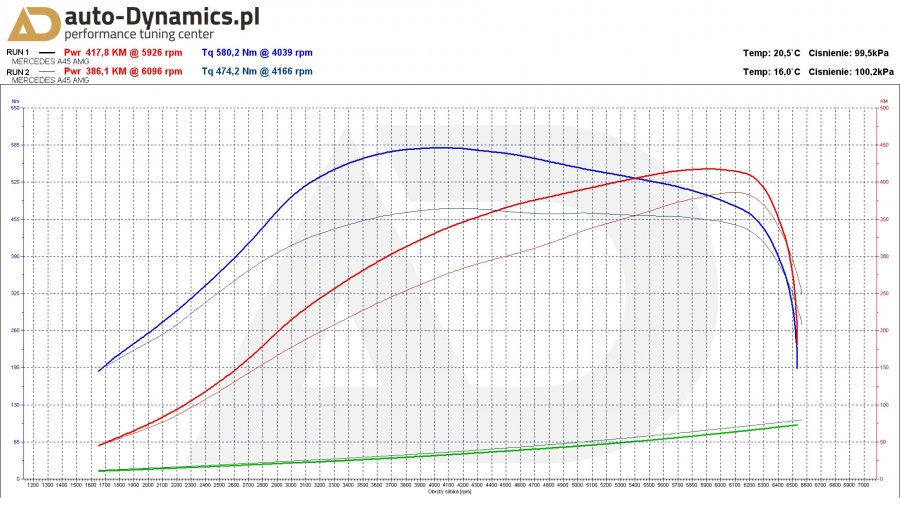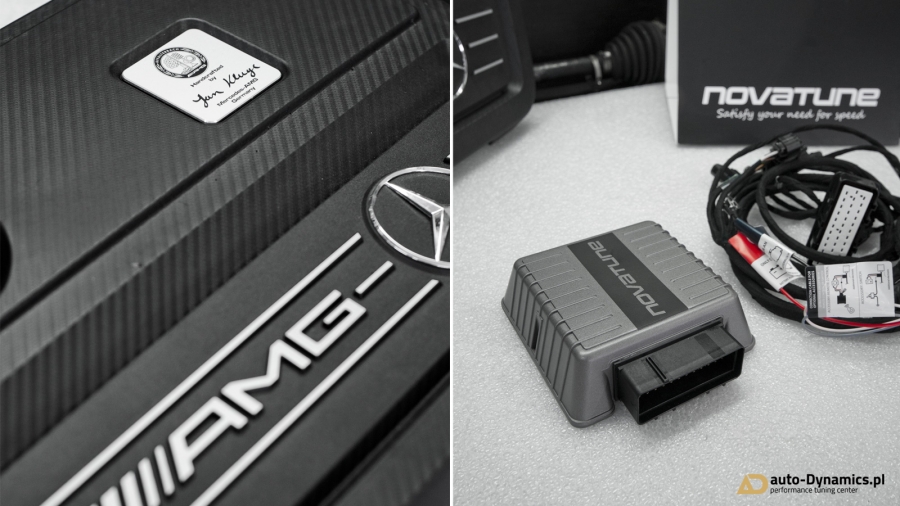W AMG z racji obowiązującej gwarancji, zainstalowany został profesjonalny, w pełni cyfrowy, dedykowany, zewnętrzny komputer ECU wraz z specjalną, rozbudowaną wiązką elektroniczną komunikującą się z sensorami magistrali CAN. Kontroler od renomowanego, niemieckiego producenta - firmy Novatune. ECU zapewnia osiągi i bezpieczeństwo identyczne do typowego chiptuningu przez OBD. Moduł korzysta z map z dynamiczną adaptacją - monitoruje wiele wartości w czasie rzeczywistym i elastycznie dobiera wskazania. Właściwości fabryczne podane przez MB to: 381KM i 475Nm [Wyniki pomiaru seryjnych wartości to 386KM i 474Nm]. Efekty naszego zabiegu zmierzone na hamowni to 418KM i 580Nm. Przyrost +37KM i +105Nm w stosunku do wartości katalogowych. Wzrost parametrów na tym poziomie zapewnia absolutną bezawaryjność jednostki napędowej w połączeniu z rewelacyjnymi osiągami pozwalającymi na bezpieczne wyprzedzanie w każdych okolicznościach i warunkach drogowych. Odczucia z jazdy w połączeniu z napędem na obie osie są teraz naprawdę niesamowite, a elastyczność zdumiewa na każdym biegu!